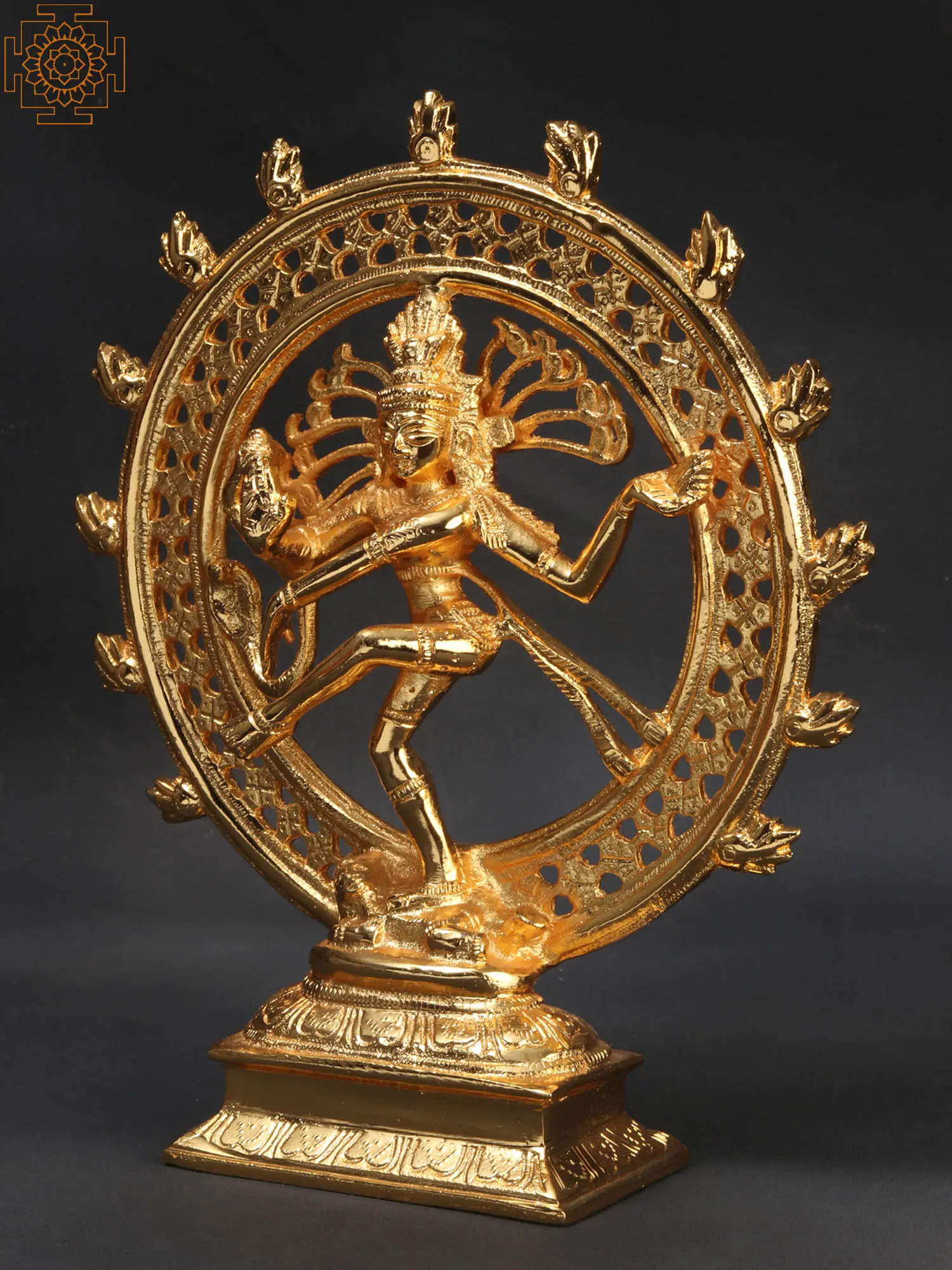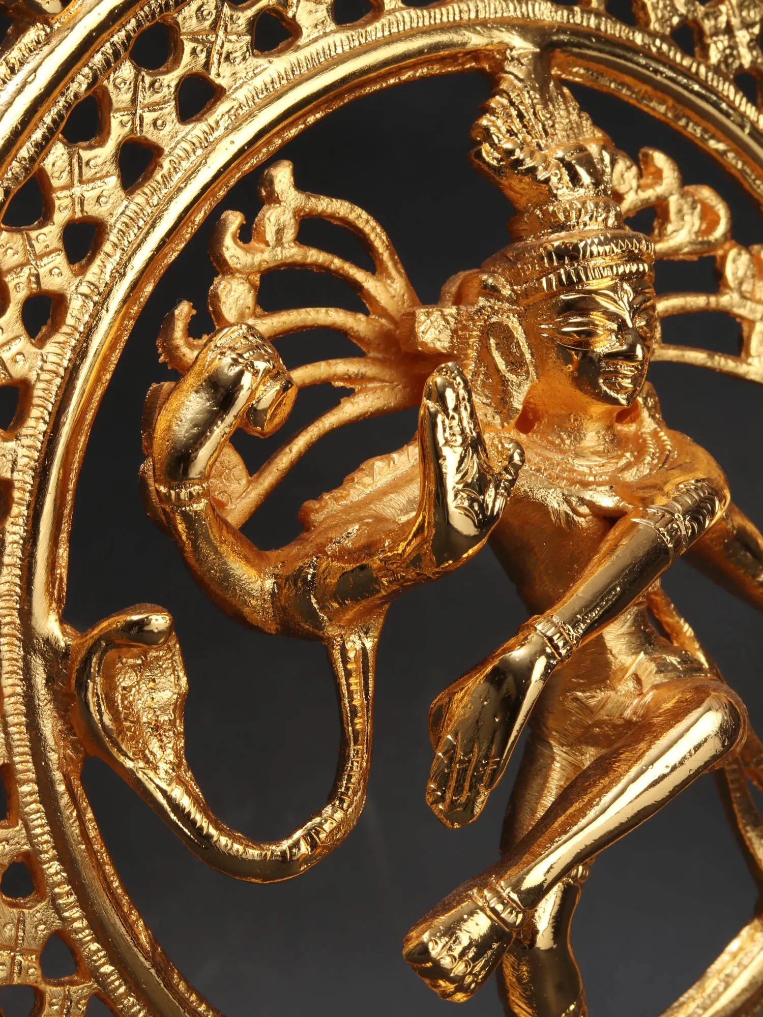 The Gold-Plated Nataraja Idol in Brass is a dazzling rendition of Lord Shiva's cosmic dance. Bathed in radiant gold, this masterpiece captures the divine energy of Nataraja, symbolizing the eternal cycle of creation and destruction. Hara, the destroyer, shattered the three cities (of the demon Tripura). He had elevated one bent foot while dancing. He is one who provided vision to Sage Patanjali. He breaks the cycle of birth and death. He possesses the beauty of the Kadamba tree and wears the sky as clothing. His neck is as black as the many gloomy clouds. He is the ocean's treasure. This statue is a tribute to the grand image of Nataraja; with meticulous craftsmanship and opulent gold plating, it exudes spiritual significance and visual grandeur.