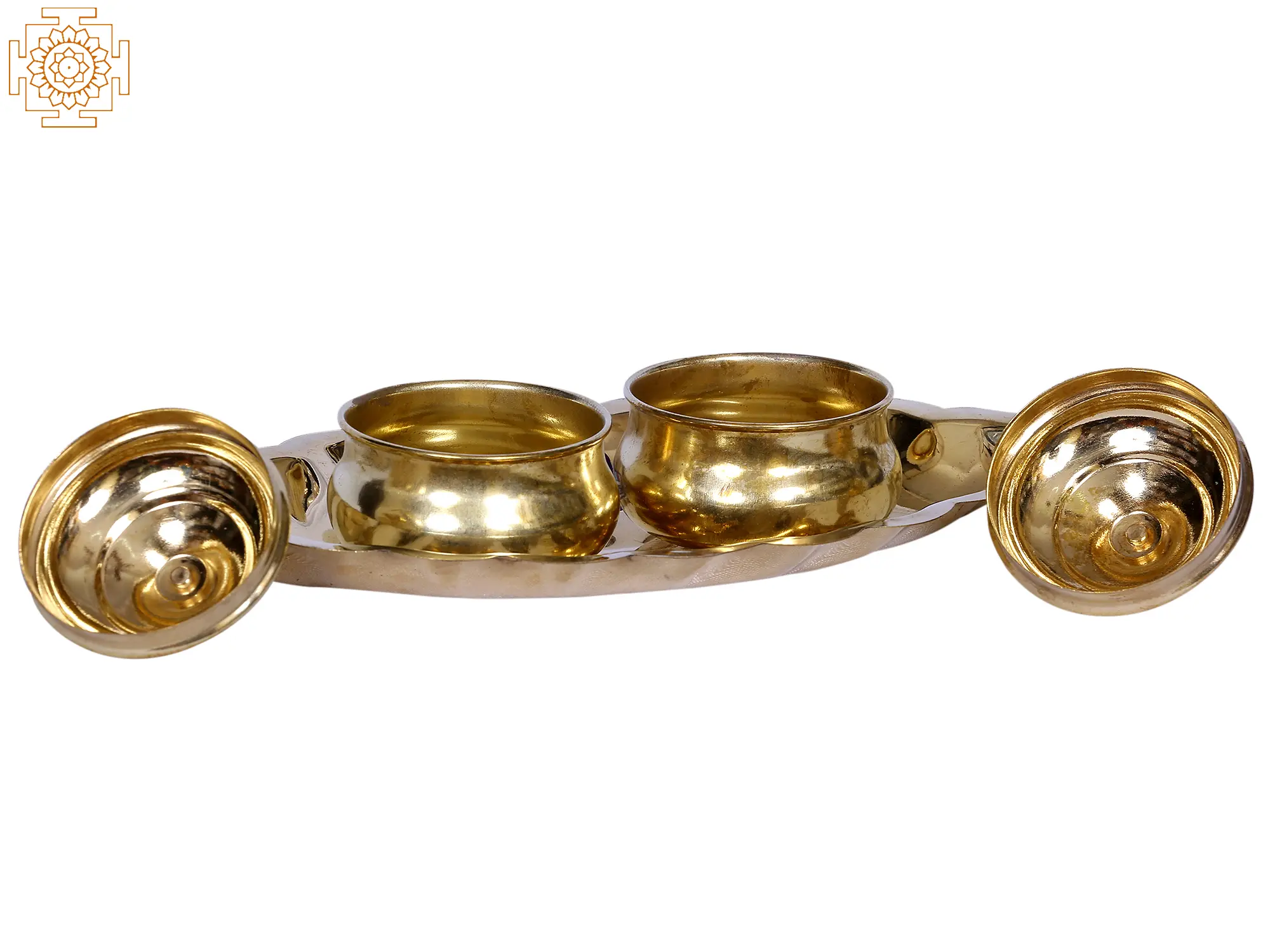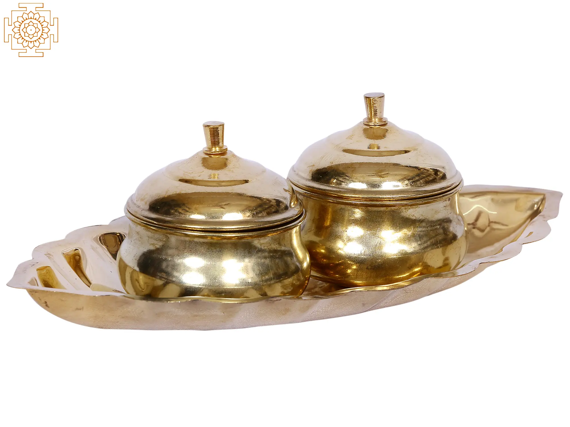 Ritual objects in India are very important as they perform specific roles and also help complete the rituals smoothly. This leaf-shaped tray with two containers is a similar ritual object having the composition of brass metal. The tray is used for keeping the containers in place and also ease their portability. The two containers with a lid are useful for storing Kumkum and raw rice for the purpose of tilak during the aarti. These kinds of trays with containers have been in use for a very long time and have become an integral part of Hindu rituals.
