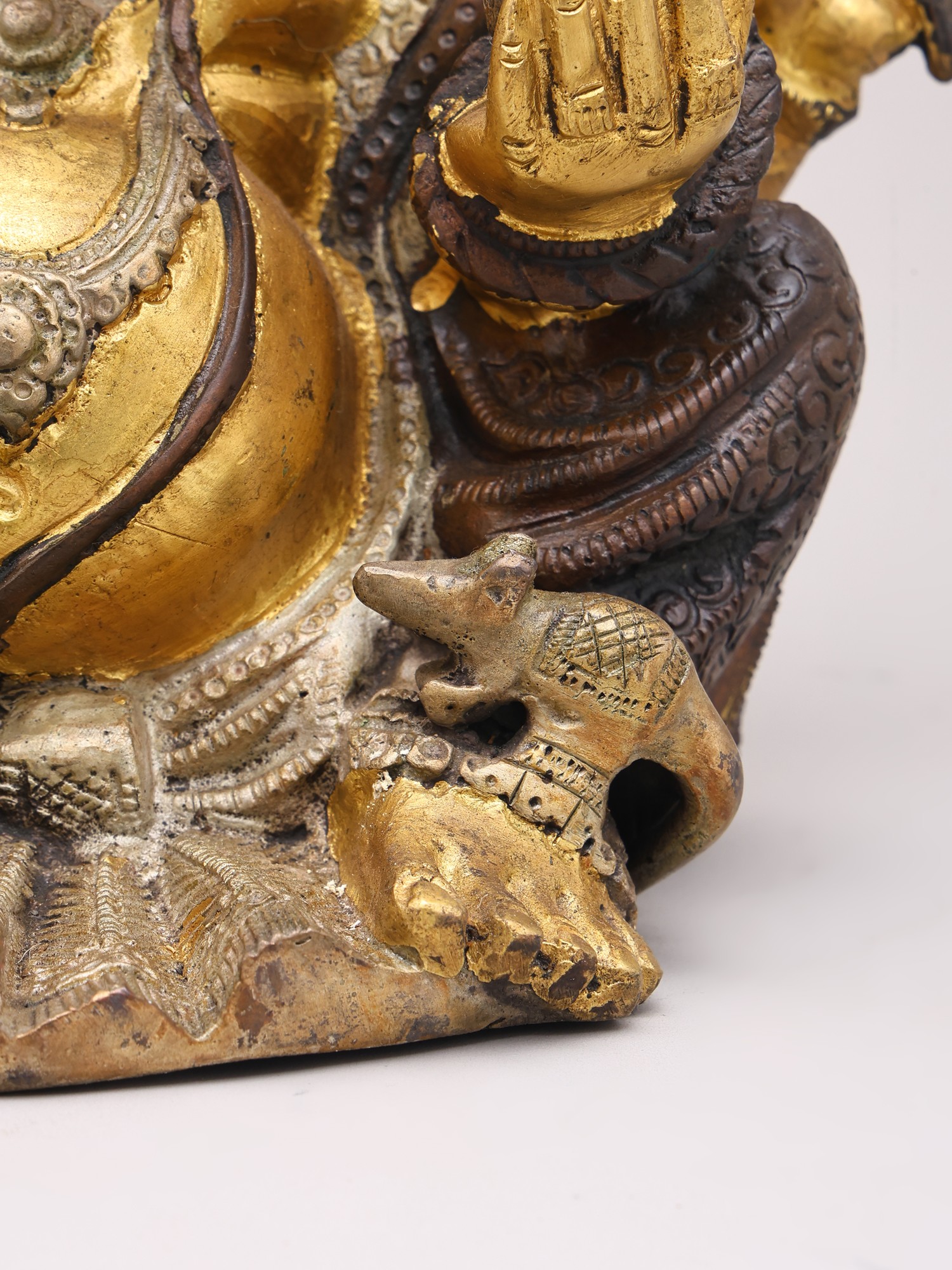 The interplay of polished brass and darker patinas creates a striking visual depth, highlighting the divine form. You'll appreciate the graceful pose, with one hand raised in blessing and the other holding symbolic representations of spiritual endeavors and material abundance. The elaborate headdress, the gentle curve of the trunk, and the watchful eyes all contribute to a captivating aesthetic that speaks volumes. This work stands approximately 8.7 inches tall, with a width of 8.5 inches and a depth of 5.7 inches, striking a perfect balance between presence and proportion.
