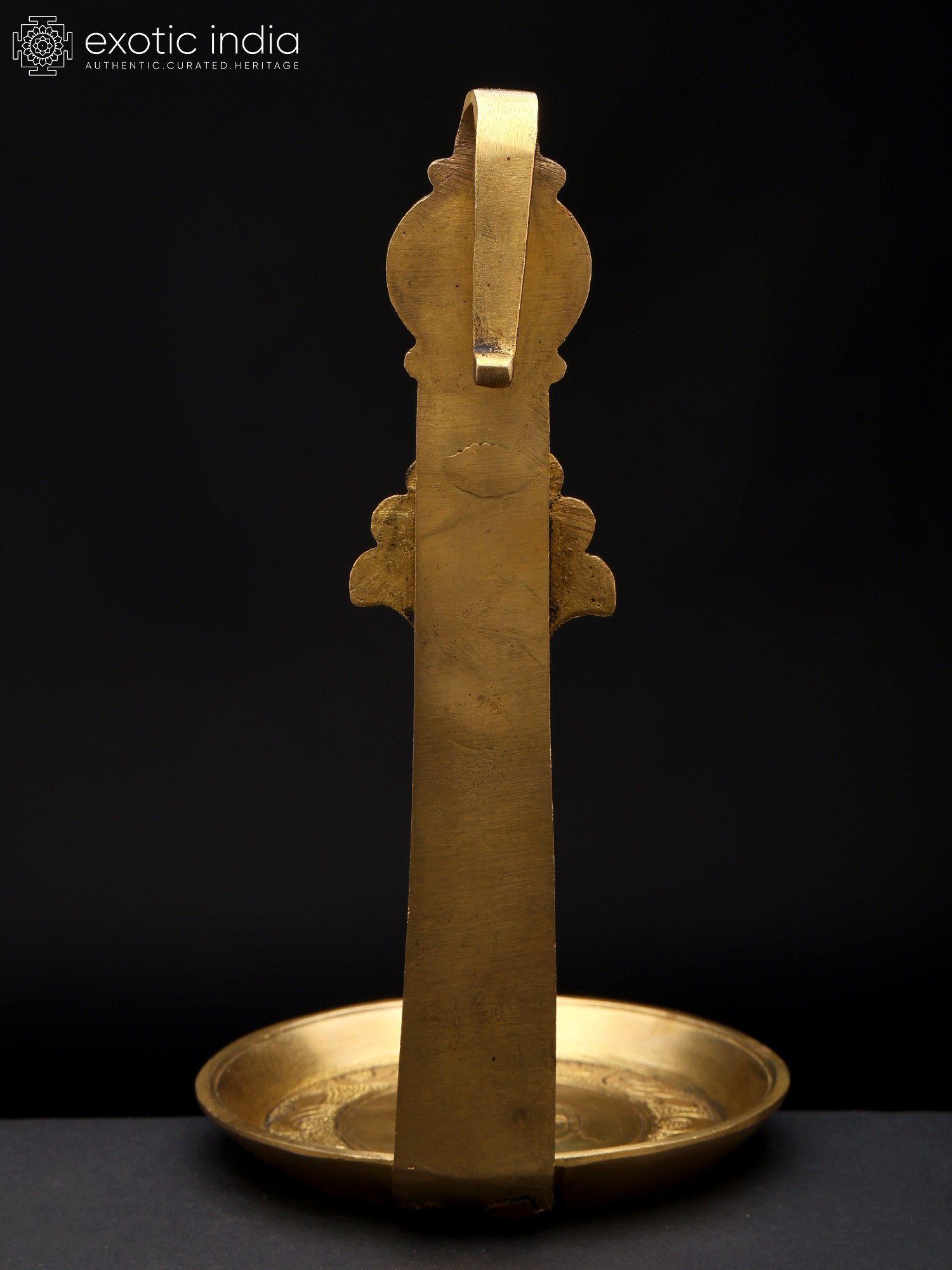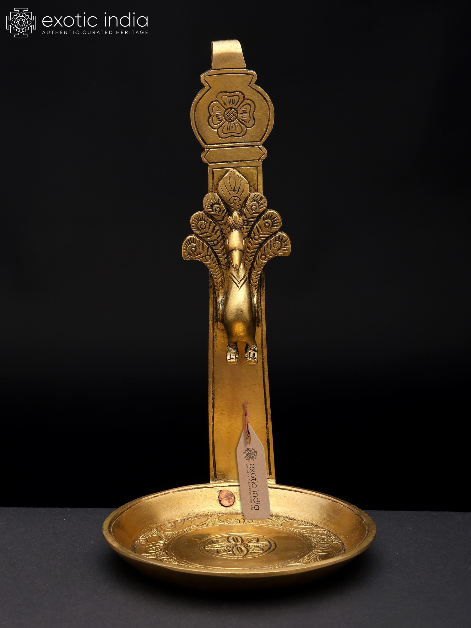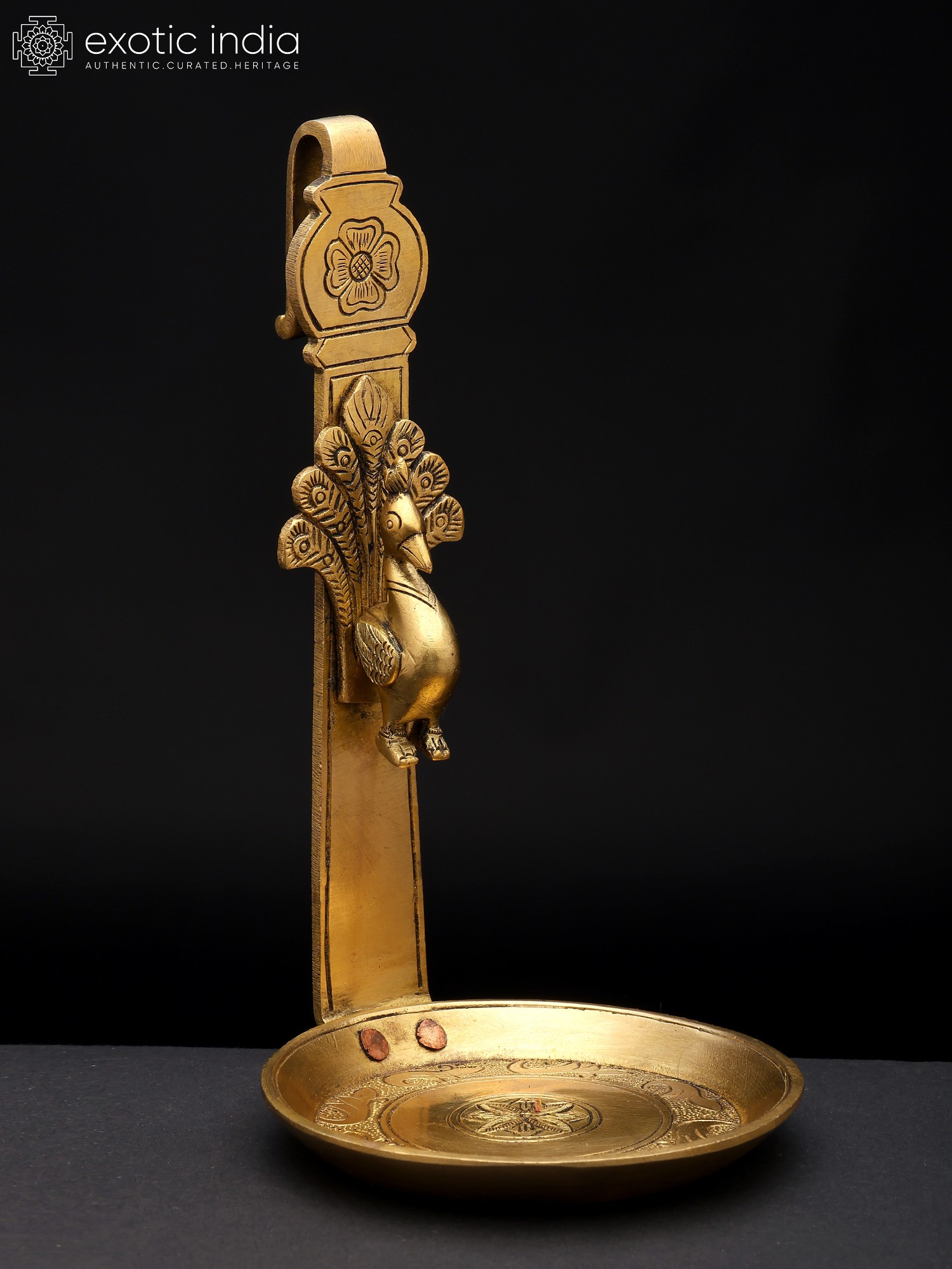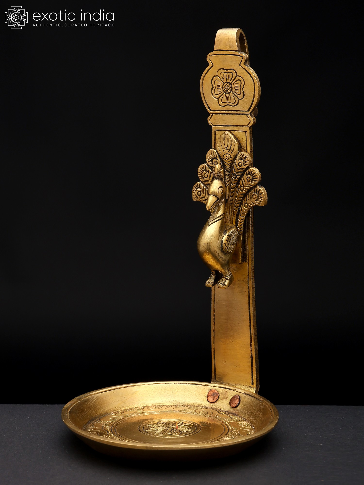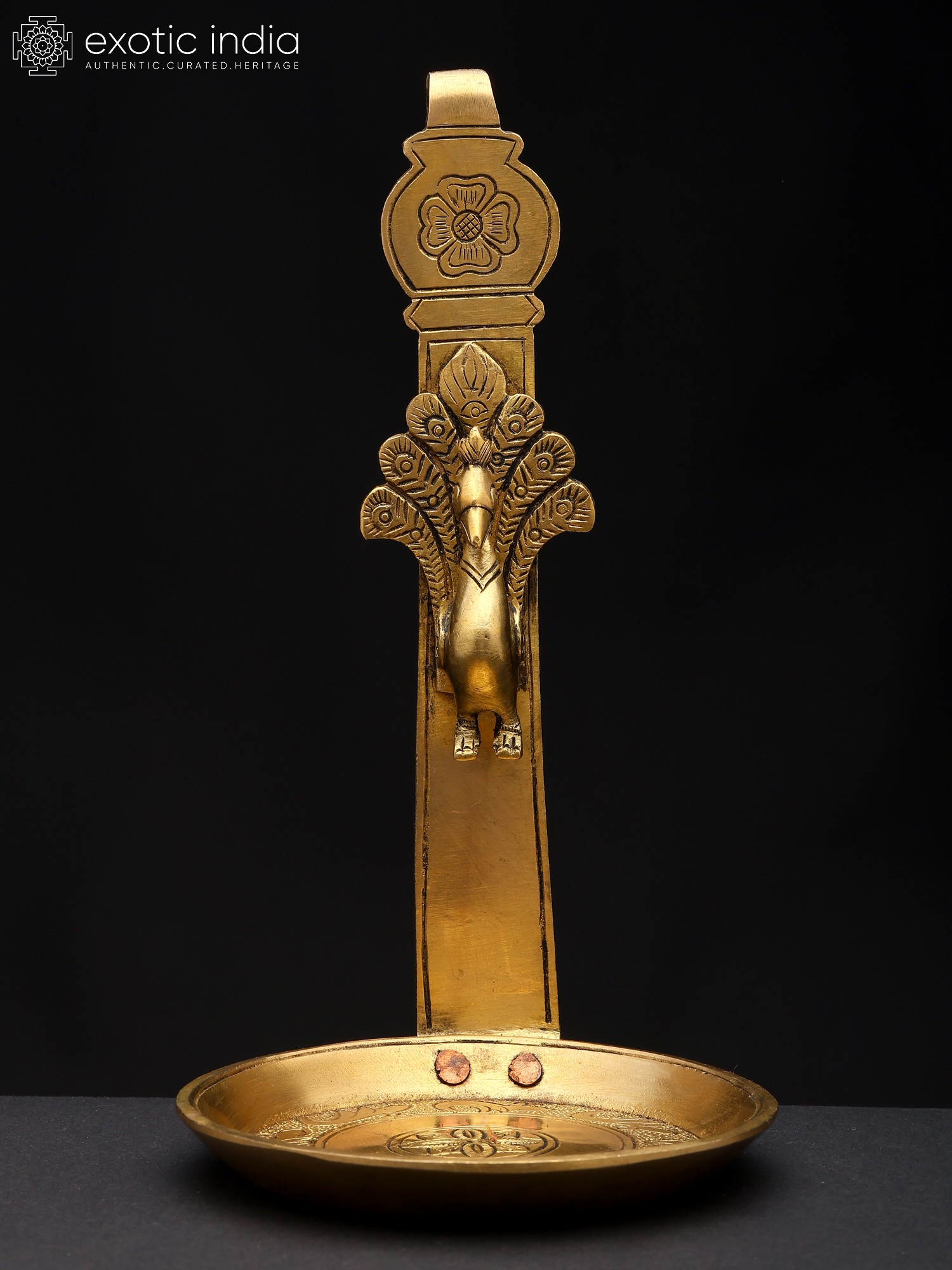 This lamp is ideally suited for use in puja rooms, meditation spaces, or as a decorative accent in any living area. Its traditional design and the auspicious symbolism of the peacock make it a fitting addition to religious ceremonies and daily rituals. The gentle flicker of a flame in this lamp can create an atmosphere of tranquility and spiritual connection. Beyond its functional purpose, the lamp serves as a stunning piece of art, a conversation starter that reflects a deep appreciation for Indian craftsmanship and cultural narratives. It is an object that not only illuminates physical spaces but also enriches the spiritual and aesthetic ambiance of its surroundings.