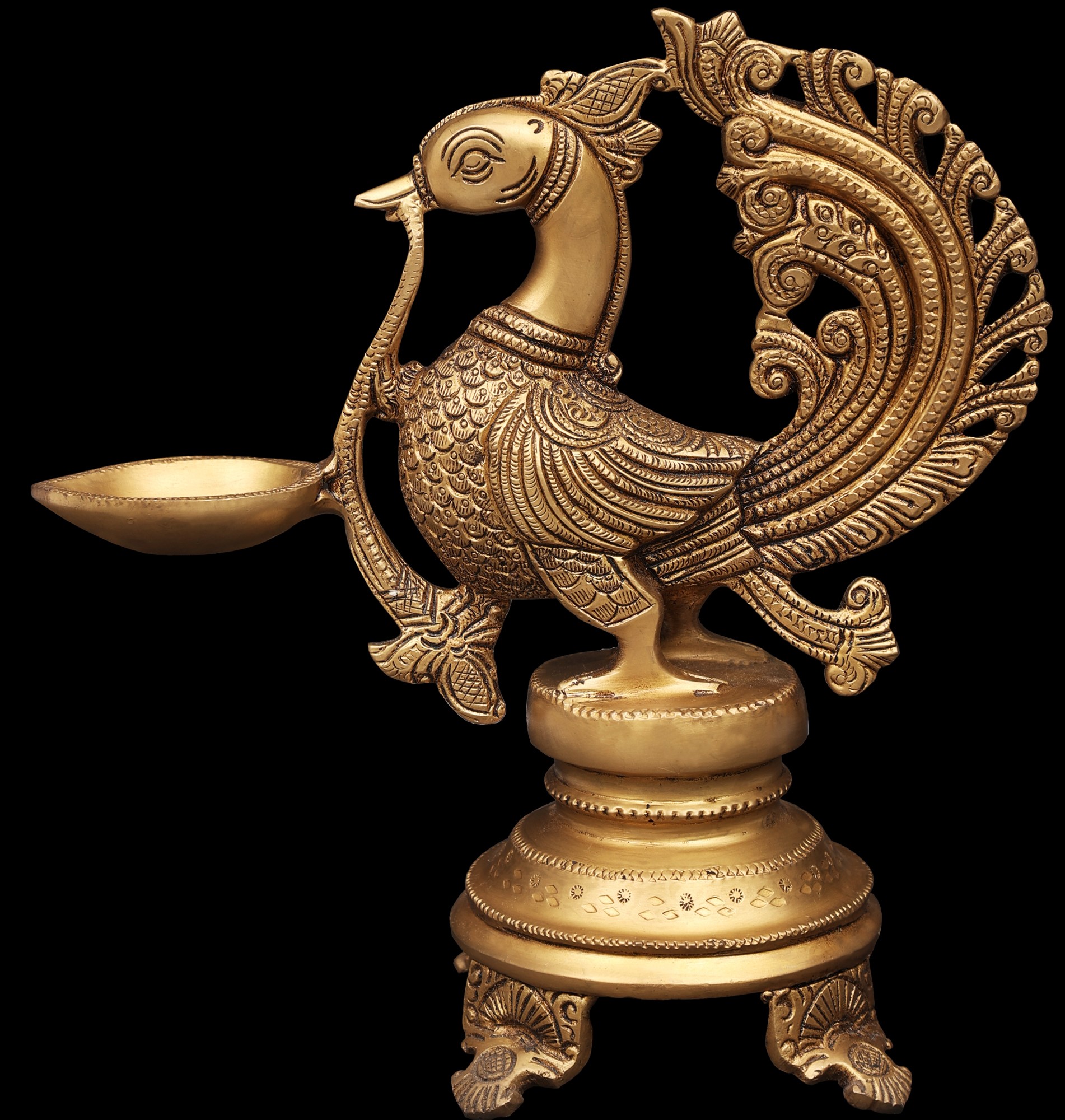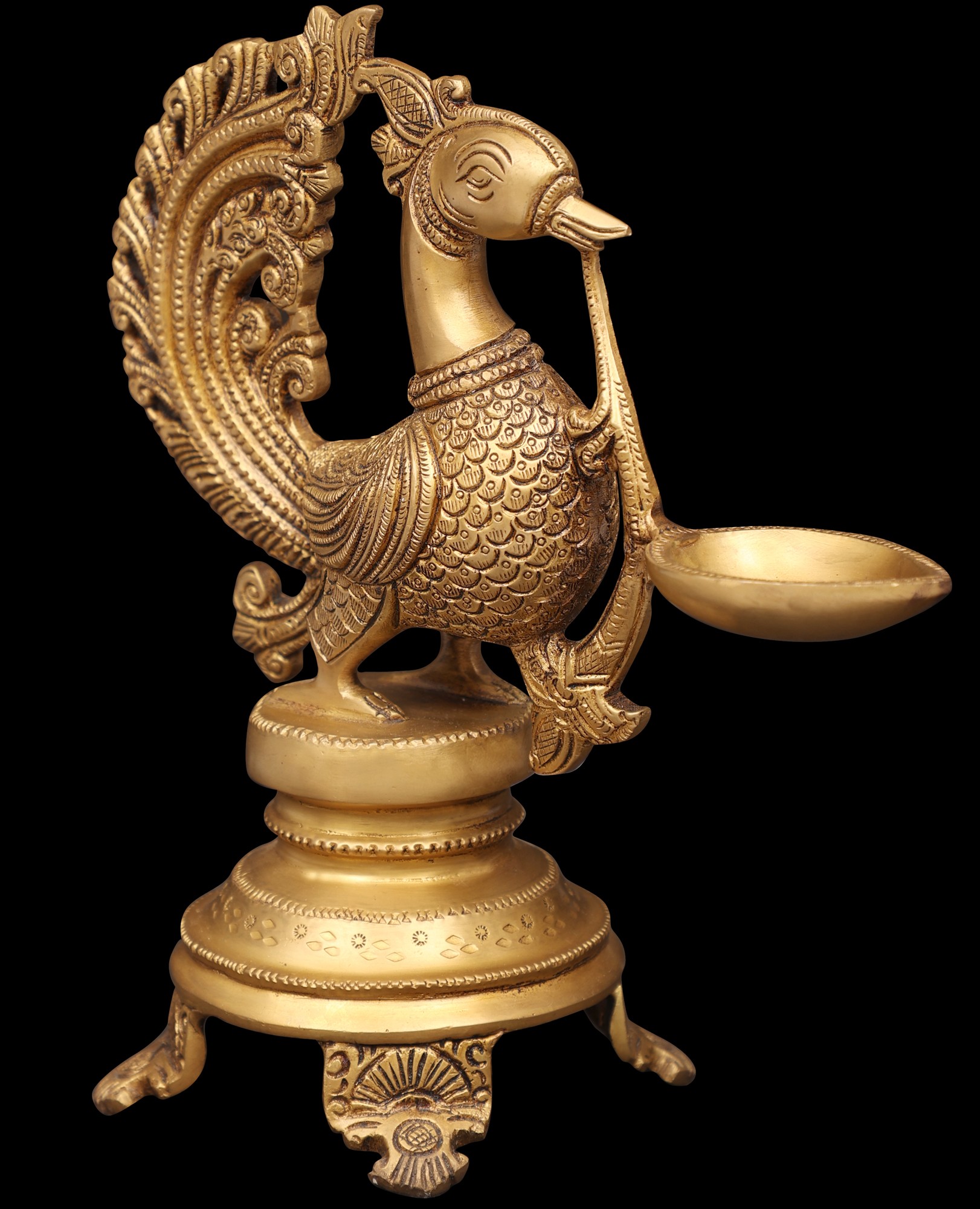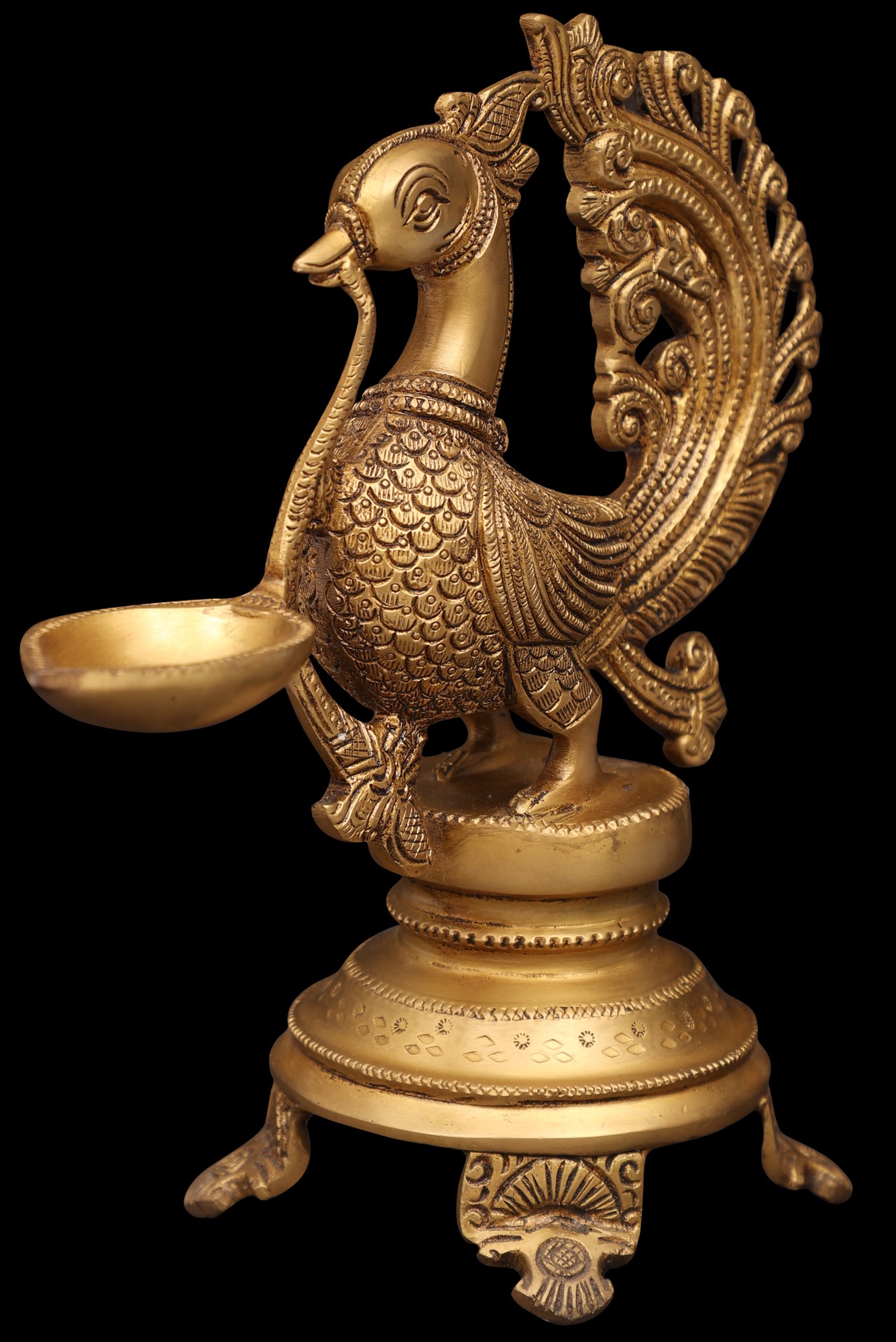 When a devotee's prayers are granted, he or she typically presents a light to the god in question, which is known as dev danam. A votive offering is shaped like a lamp. It is recommended to associate the lamp with some spiritual imagery to boost its auspiciousness and to complete the lamp's identification as a heavenly vehicle for transmitting prayers. This brass statue with a single lamp and a crown embellished with a peacock picture is said to be a perfect Dev Deepam. It is used not just as a sacrifice, but also to supply the deities with the warmth of a light. It is believed that lighting the Mayil Deepam or peacock lamp can bring the heavenly blessings of the god.