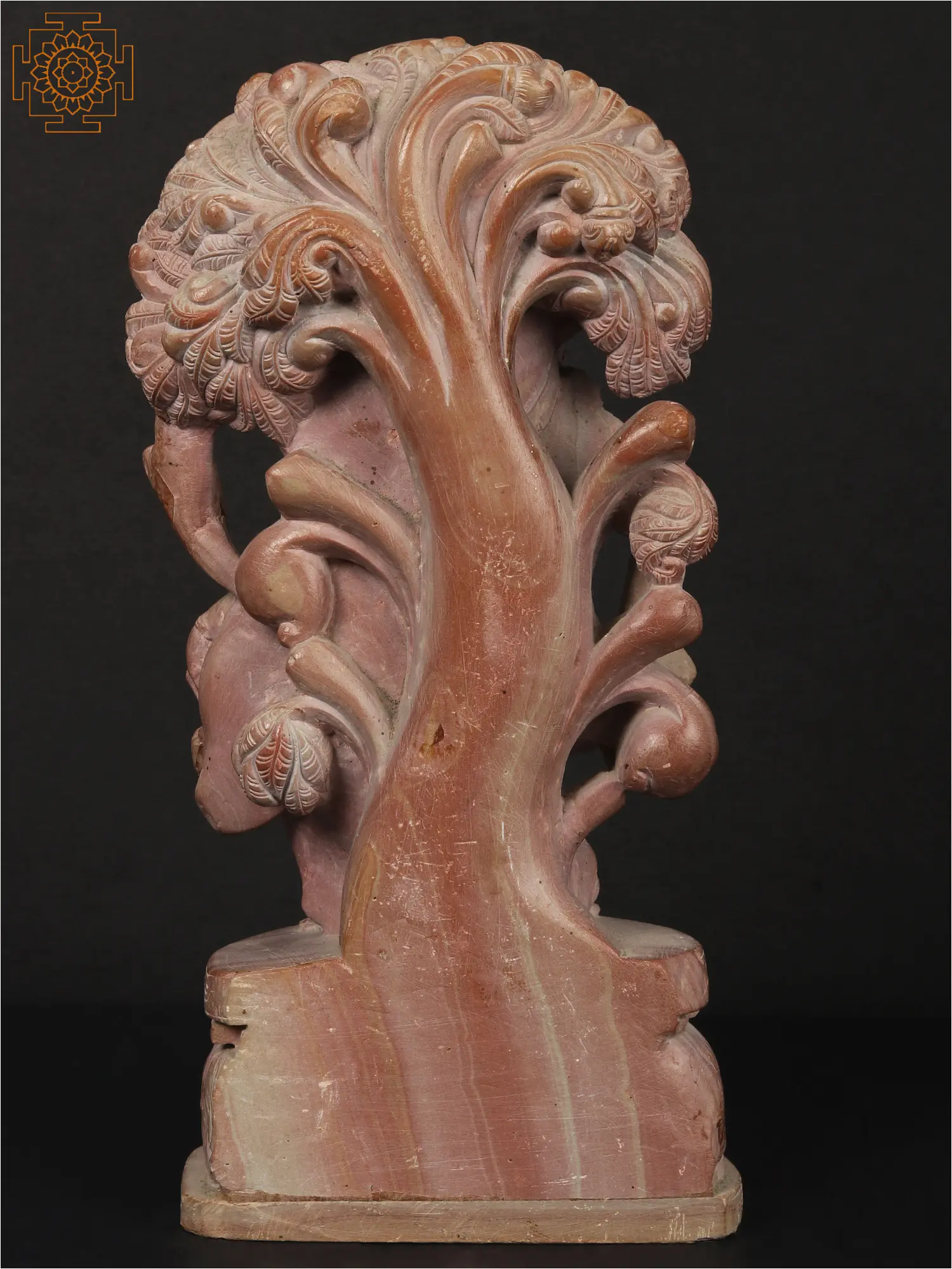 This pinkstone Radha-Krishna sculpture depicts the Vrindavan lovers under the kadamba tree (its blossoms are reputed to enhance romance). As always, He plays on His flute. She places an arm around Him whilst He plays, Her head swaying with the music.