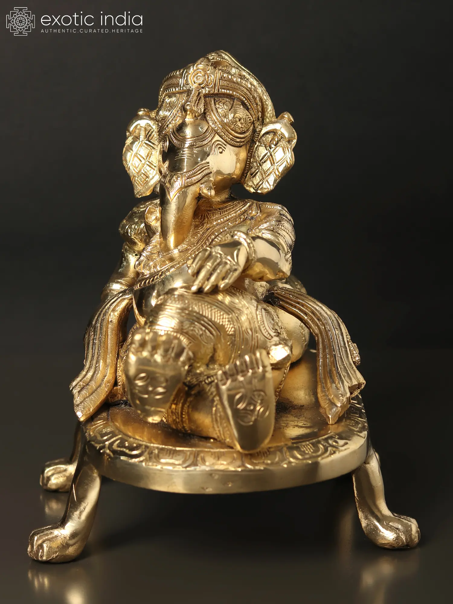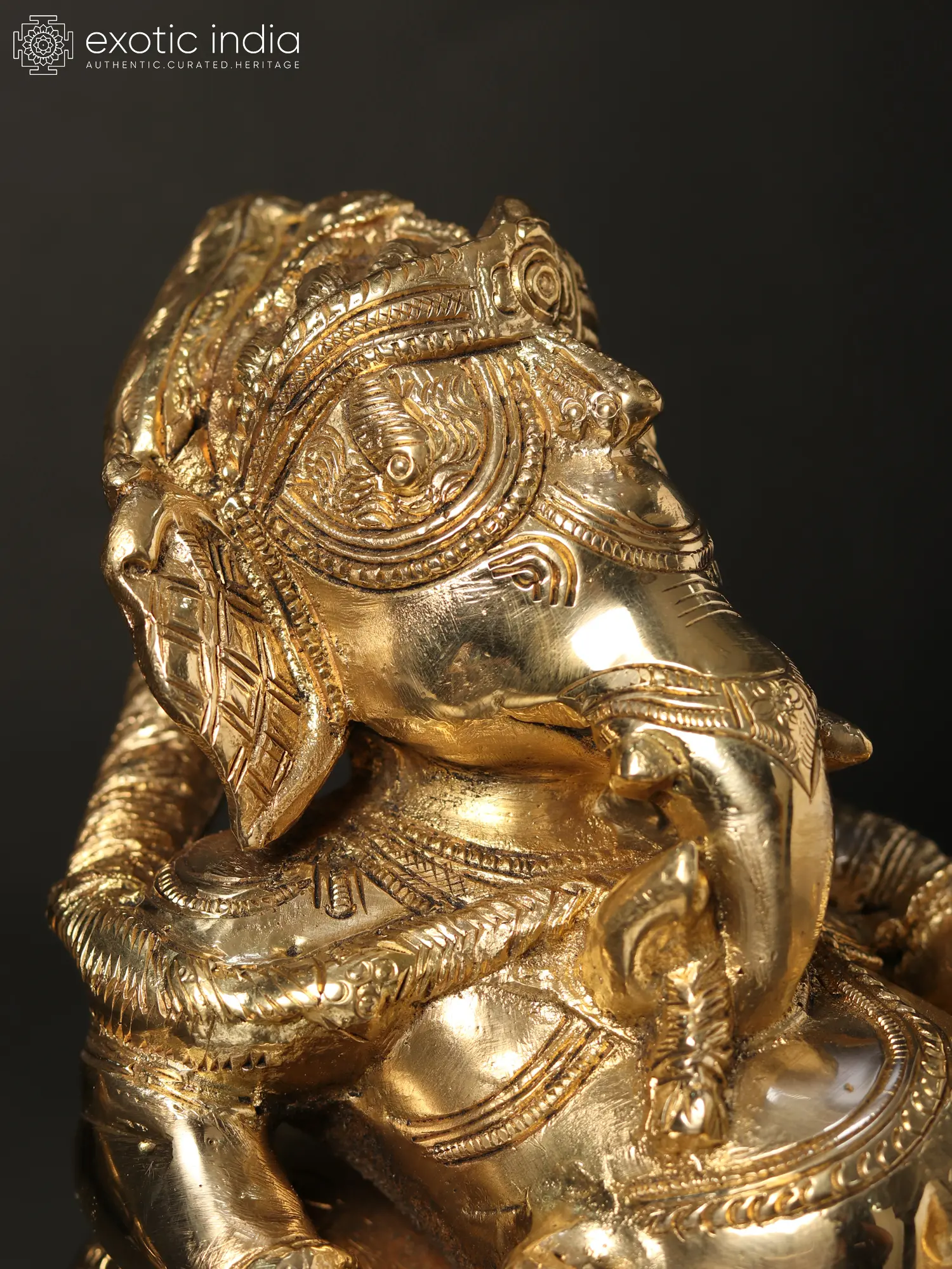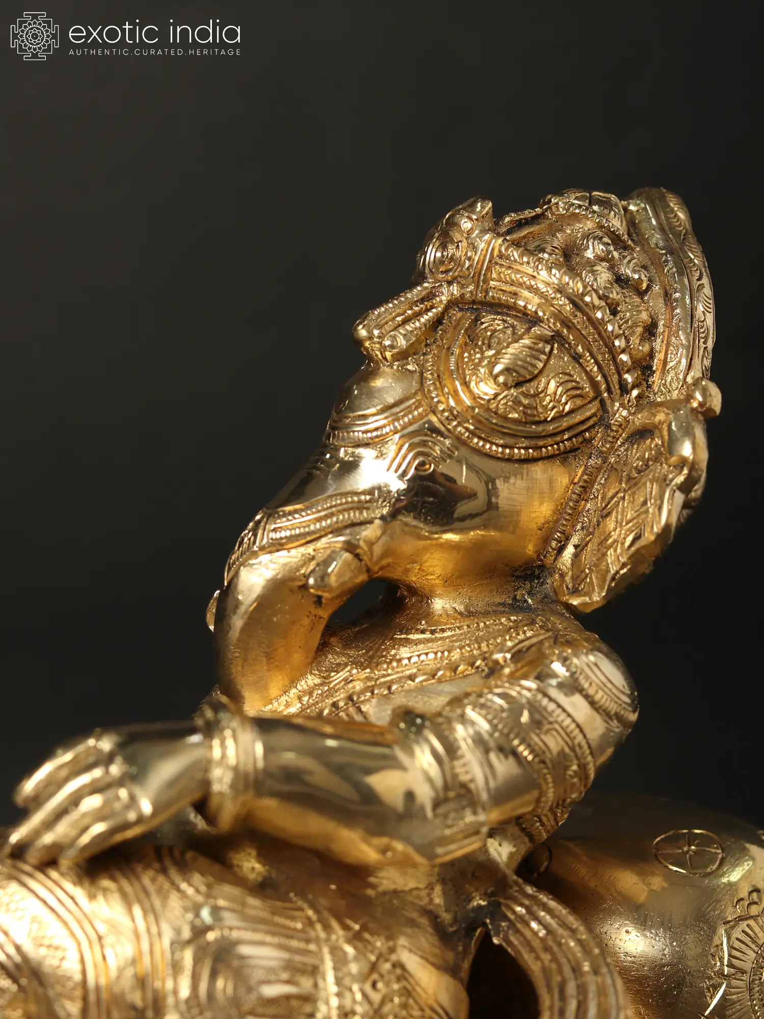 In the tranquil embrace of this Brass statue, Ganesha, also known as Vinayaka, the harbinger of Success, rests in serene repose, a mesmerising embodiment of divine tranquillity. His legs lie flat, with the left foot gently cradling the right, an expression of absolute relaxation. Adorned in regal opulence, celestial robes cascade gracefully around him, adorned with ornate jewellery that gleams like stardust. Atop his divine visage rests a resplendent Mukut (Pitambar), a symbol of his celestial sovereignty. This form of Ganesha, a sentinel of serenity, watches over us with benevolent eyes. Worshipping this ethereal form bestows blessings of inner peace and harmony, a gateway to a life suffused with divine grace.