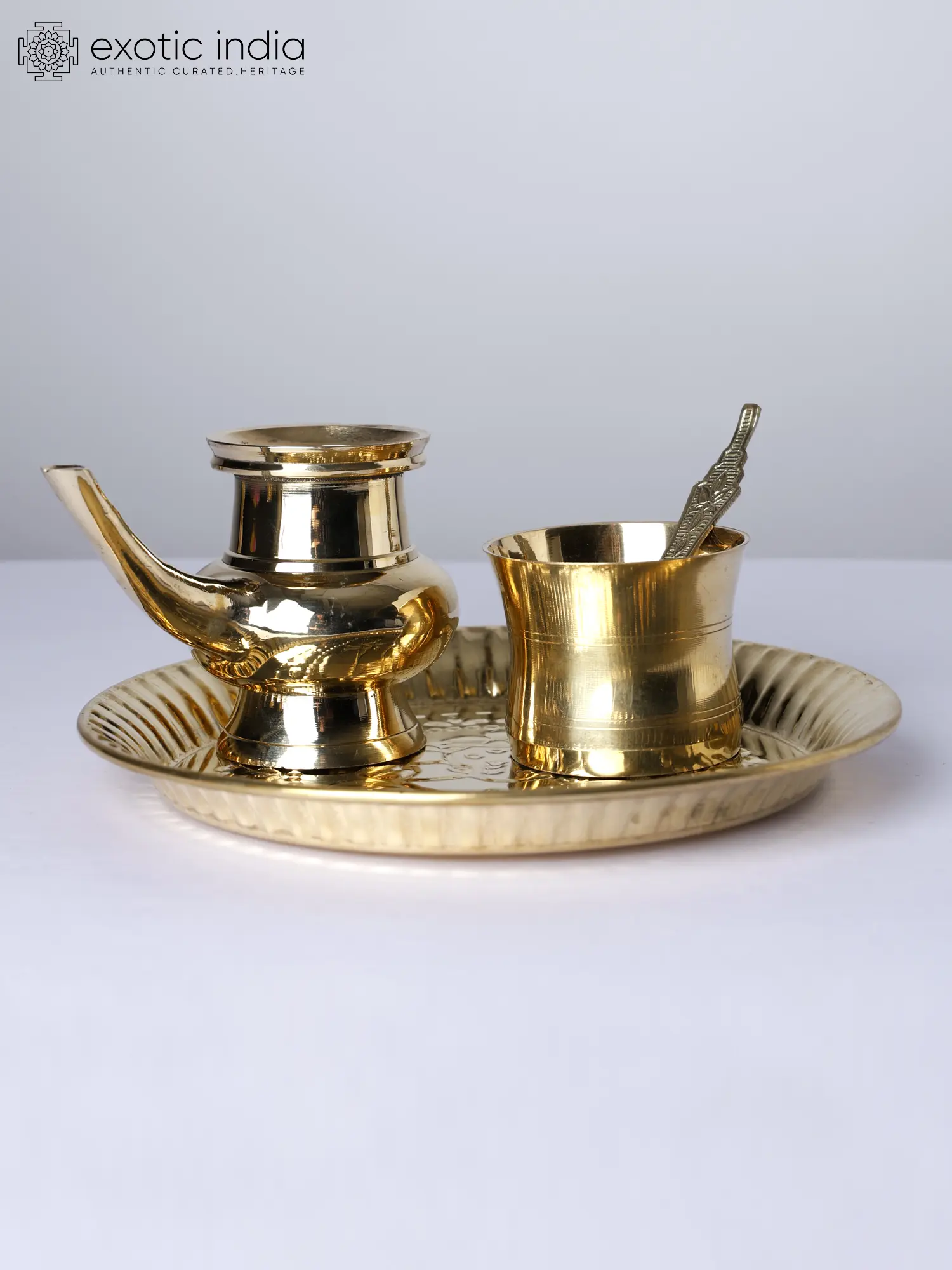 This enchanting “Puja Thali Set” is a celestial ode to spirituality and tradition. Made from lustrous brass, each piece resonates with the divine blessings. This sacred set features a radiant thali embellished with depiction of Lord Ganesha (the harbinger of prosperity and remover of obstacles), accompanied by a holy pitcher (Kalash), a gleaming glass, and a delicate spoon, symbolizing purity and devotion.