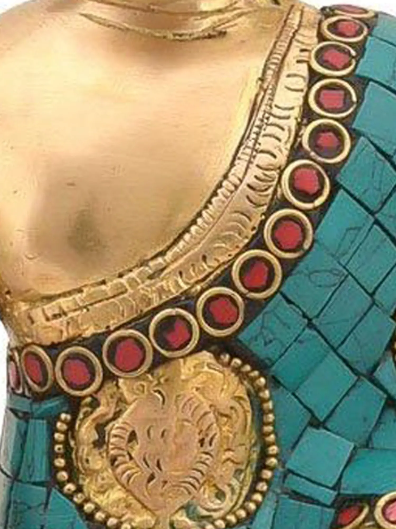 This exquisite brass statue captures the serene essence of Shakyamuni Buddha, the awakened one, in a meditative pose. Handcrafted with meticulous attention to detail in India, this artwork embodies a profound sense of peace and spiritual wisdom. The rich brass lends a warm glow to the figure, highlighting the intricate craftsmanship that went into its creation. The Buddha is depicted seated in the lotus position, a posture universally recognized for its connection to meditation and spiritual practice. His eyes are gently closed, symbolizing inner contemplation and detachment from the material world. The subtle curves of his body and the peaceful expression on his face evoke a sense of profound tranquility, inviting viewers to find their own inner stillness. ––––––––––