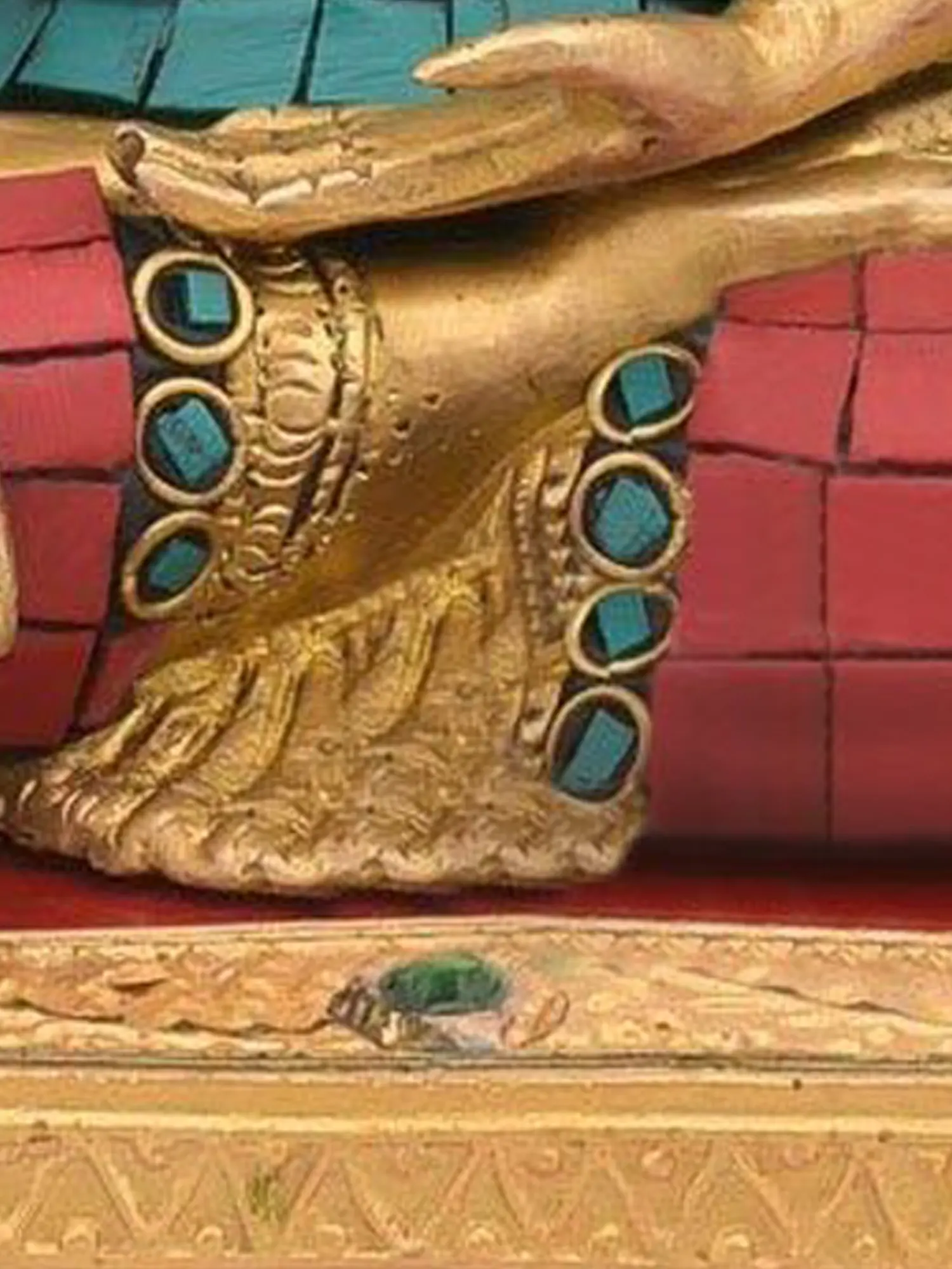Adding another layer of spiritual significance, the robes of Shakyamuni Buddha are adorned with the auspicious symbols of the Ashtamangala, the eight traditional symbols of good fortune in Indian religions. These symbols are not merely decorative but carry deep meaning. They often include the lotus flower (purity and enlightenment), the conch shell (the far-reaching sound of the Dharma), the endless knot (the interweaving of wisdom and compassion), the victory banner (victory over ignorance and suffering), the wheel of Dharma (the Buddha's teachings), the parasol (protection from suffering), the pair of golden fish (fertility and freedom from fear), and the treasure vase (abundance and fulfillment). Their presence on the Buddha's robes signifies the totality of his enlightenment and the universal blessings he bestows upon all beings. The vibrant turquoise and red hues of the robe, combined with the richly detailed gold motifs, create a visually stunning representation of these sacred symbols. ––––––––––