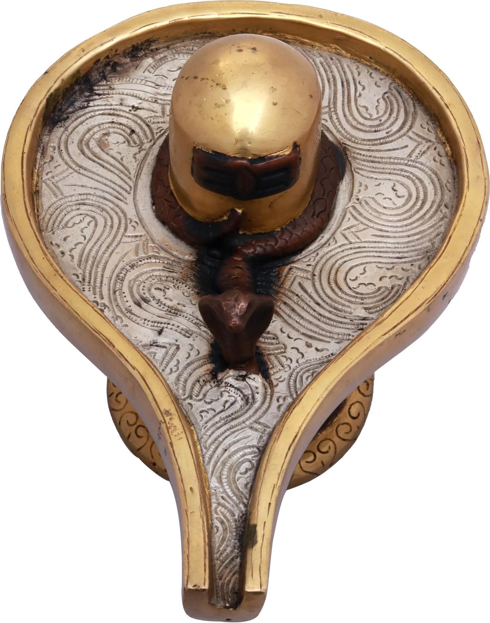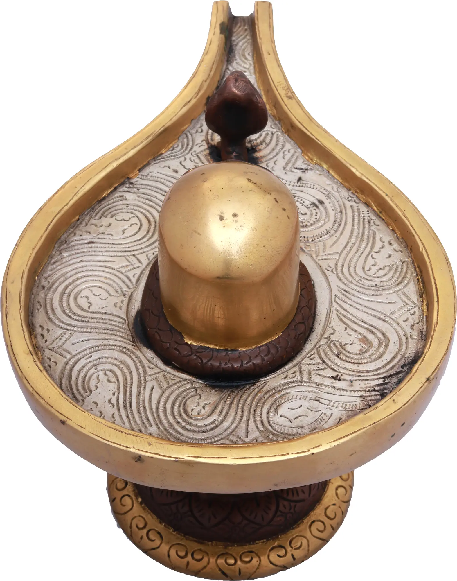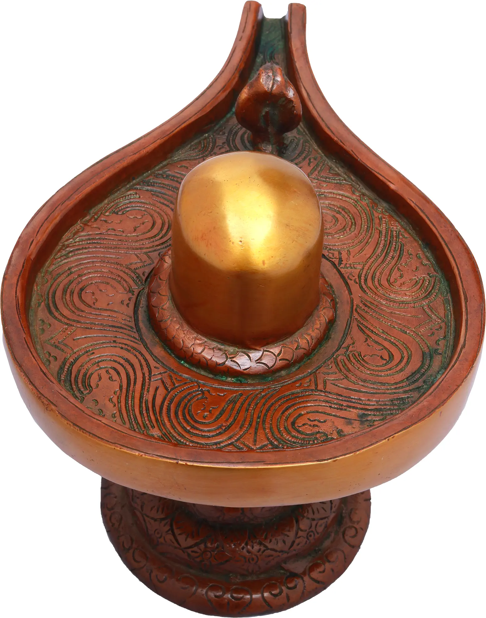 The Shiva Linga represents Lord Shiva and is connected to creation. This brass version of the Shiva Linga adheres to the traditional iconography of the Shiva Linga but is embellished with some designs of flora and fauna and also the Tri-Pundra and Third Eye. The base is a triangular projection that aids in draining the offerings made to the Shiva Linga. The base or stand is fully decorated, lending a regal touch to the Shiva Linga. With all its symbolism, this Shiva Linga is a masterful homage to Lord Shiva's power of creation.