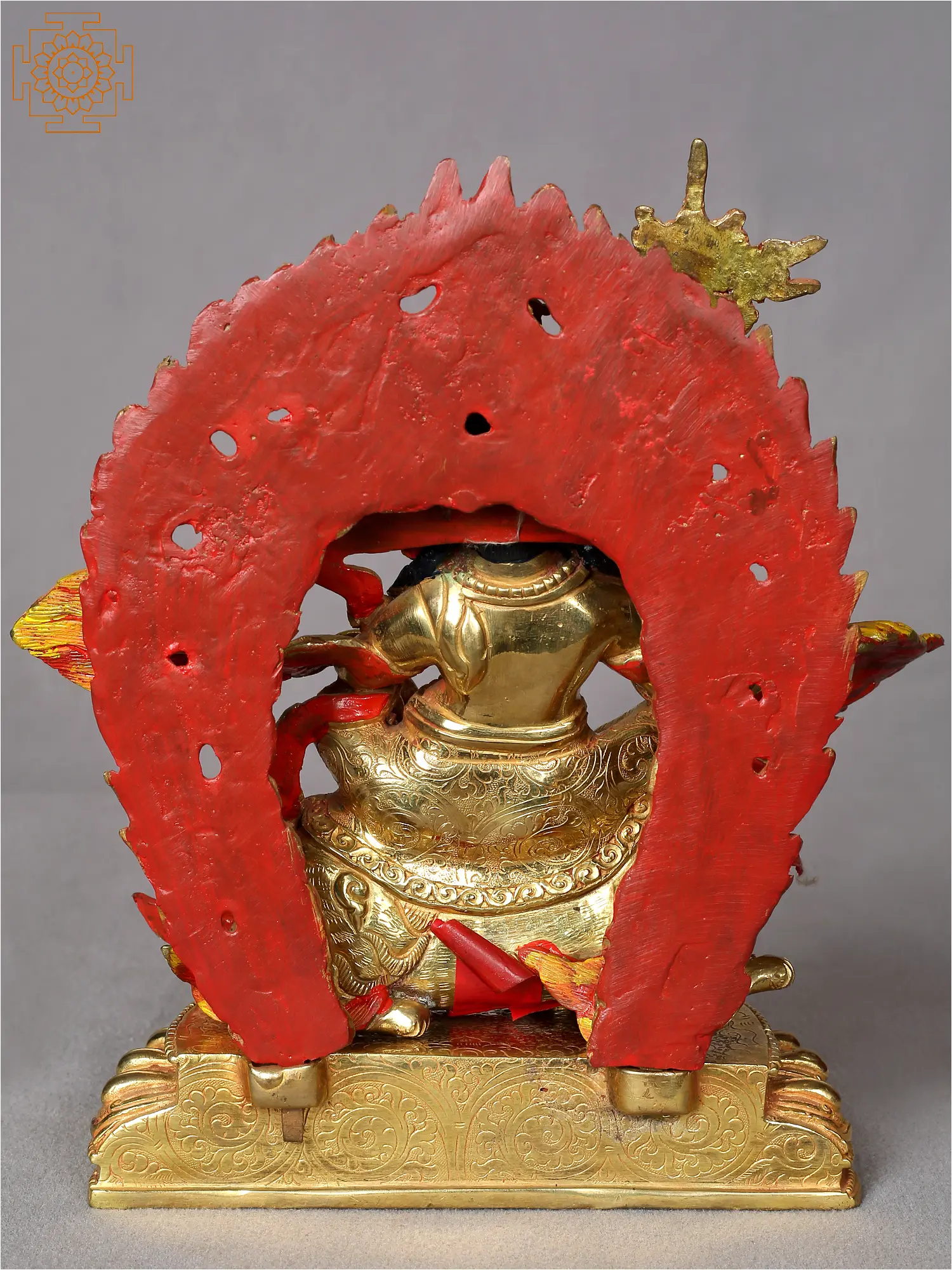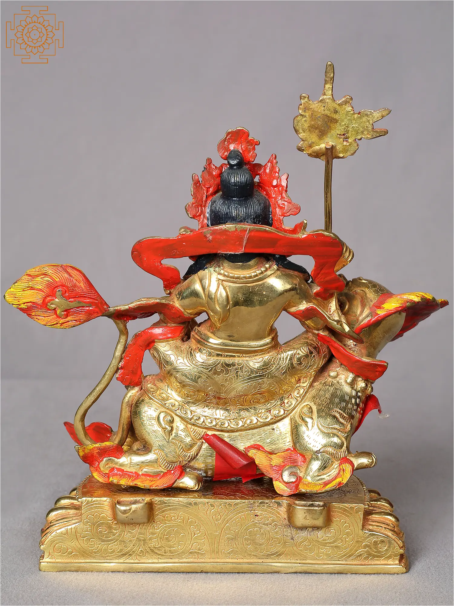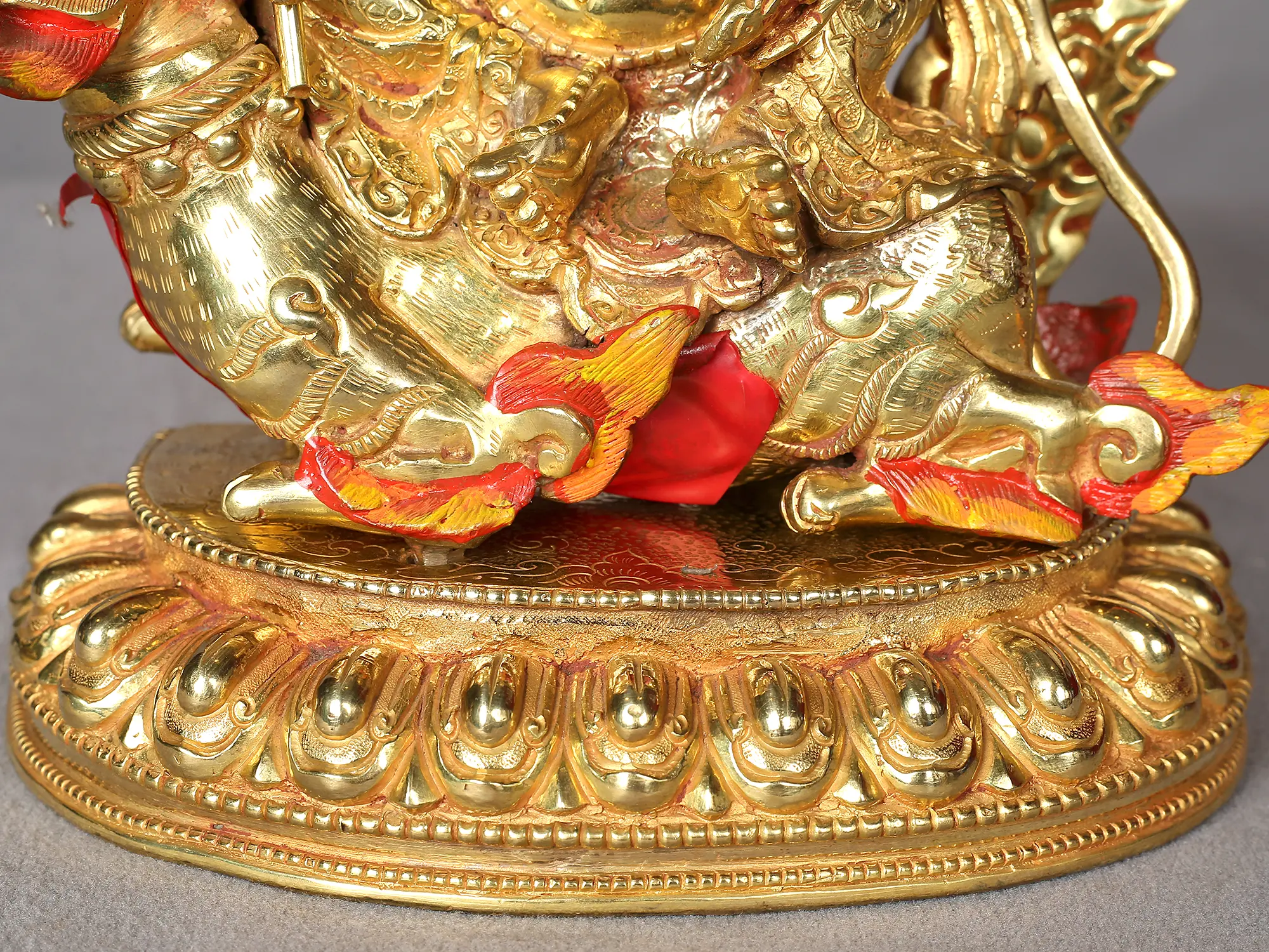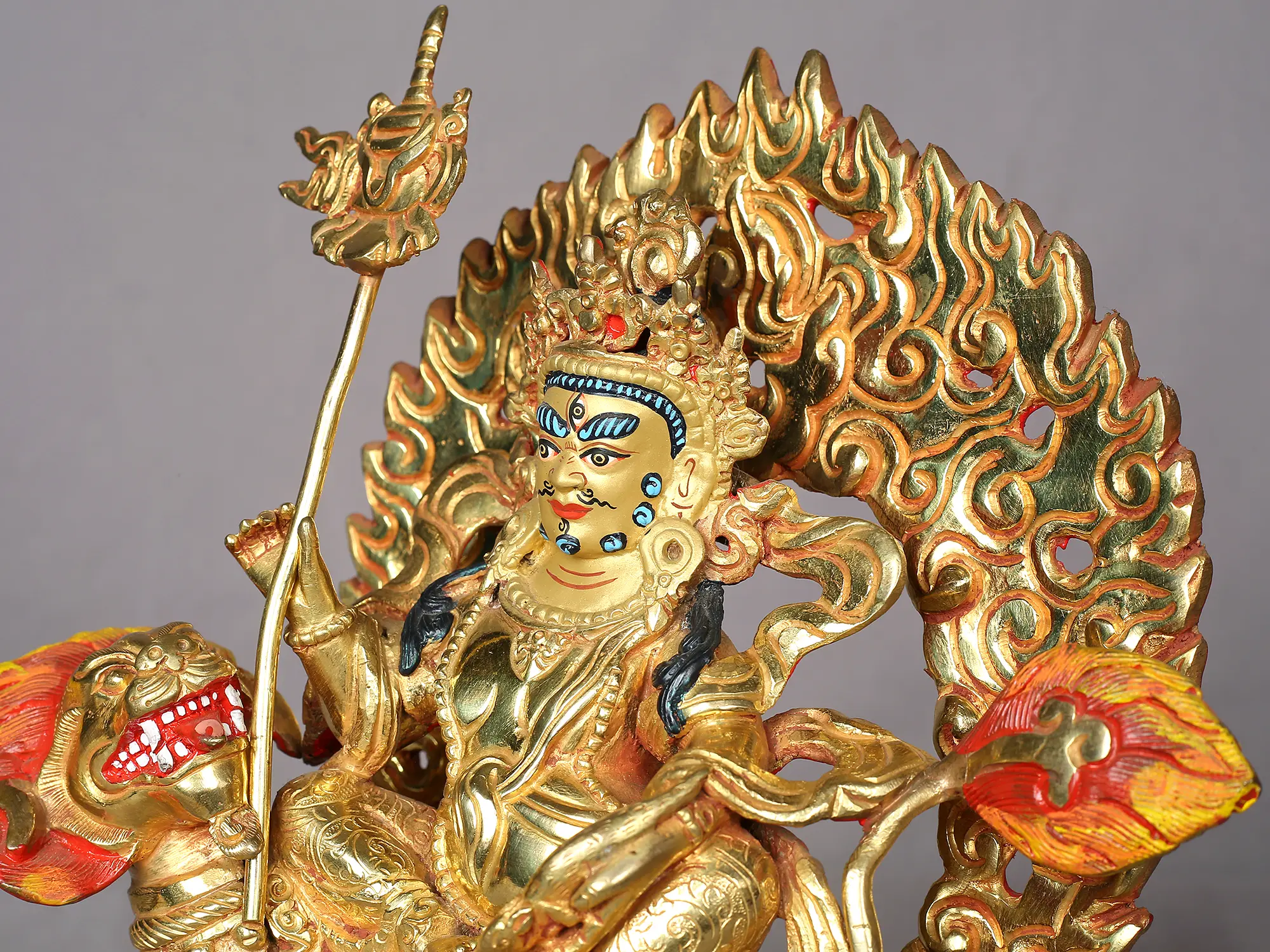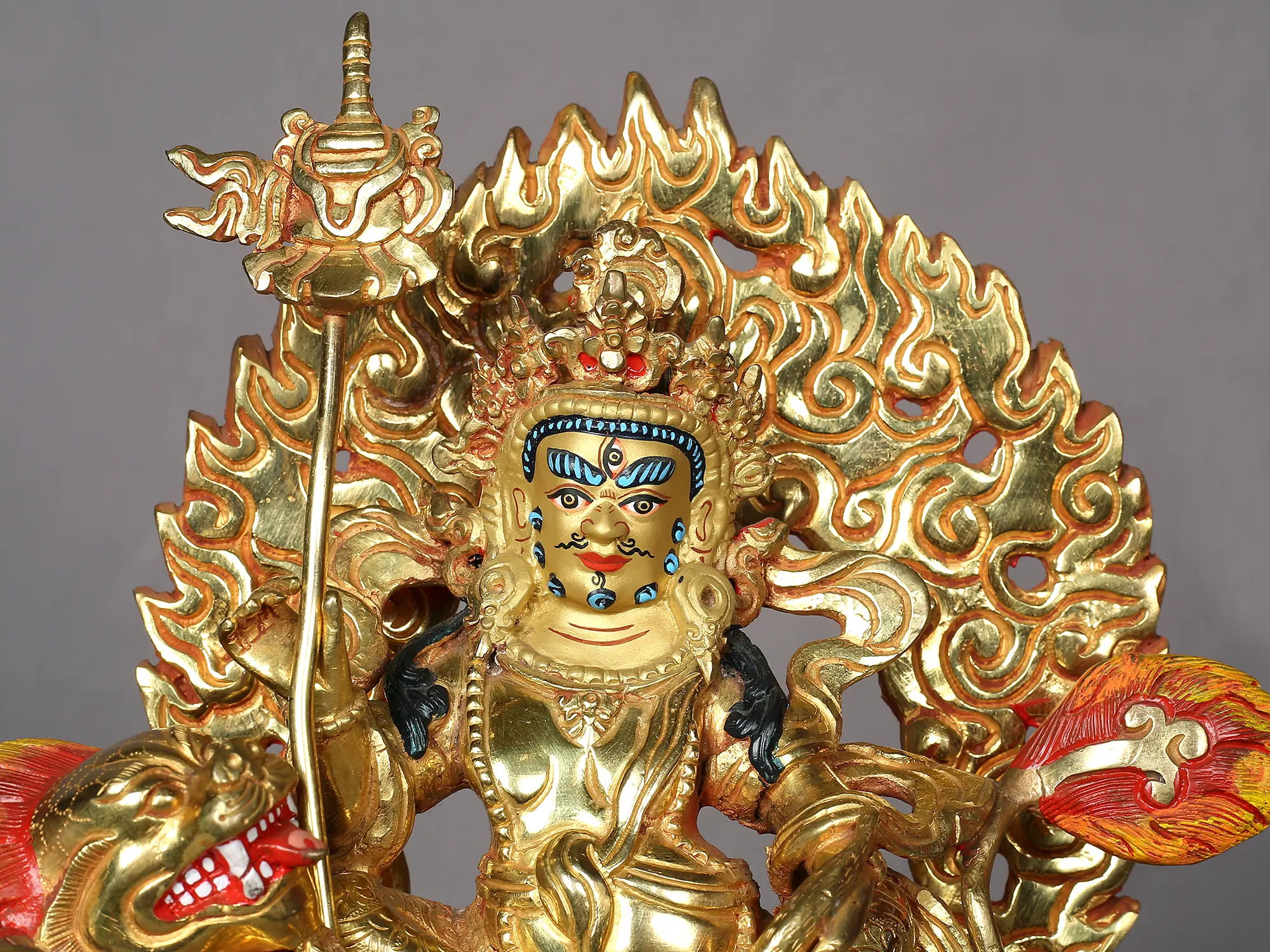 Buddhism's powerful deity Kubera or Vaishravana, who rules over the Northern region, is revered by followers for both worldly and spiritual richness. This Kubera statue made of copper and gold depicts him in his wrathful form as a formidable defender of his devotees against the evil forces and the gloom of ignorance. The golden finish of the icon, whose beauty is heightened by the application of finer details, contrasts strikingly with the eye-catching outlines of his facial features. The heavenliness of Kubera, who is mounted on a lion and is also known as Simha-Kubera, is symbolized by the jewel-spitting mongoose and victory staff in his hand.