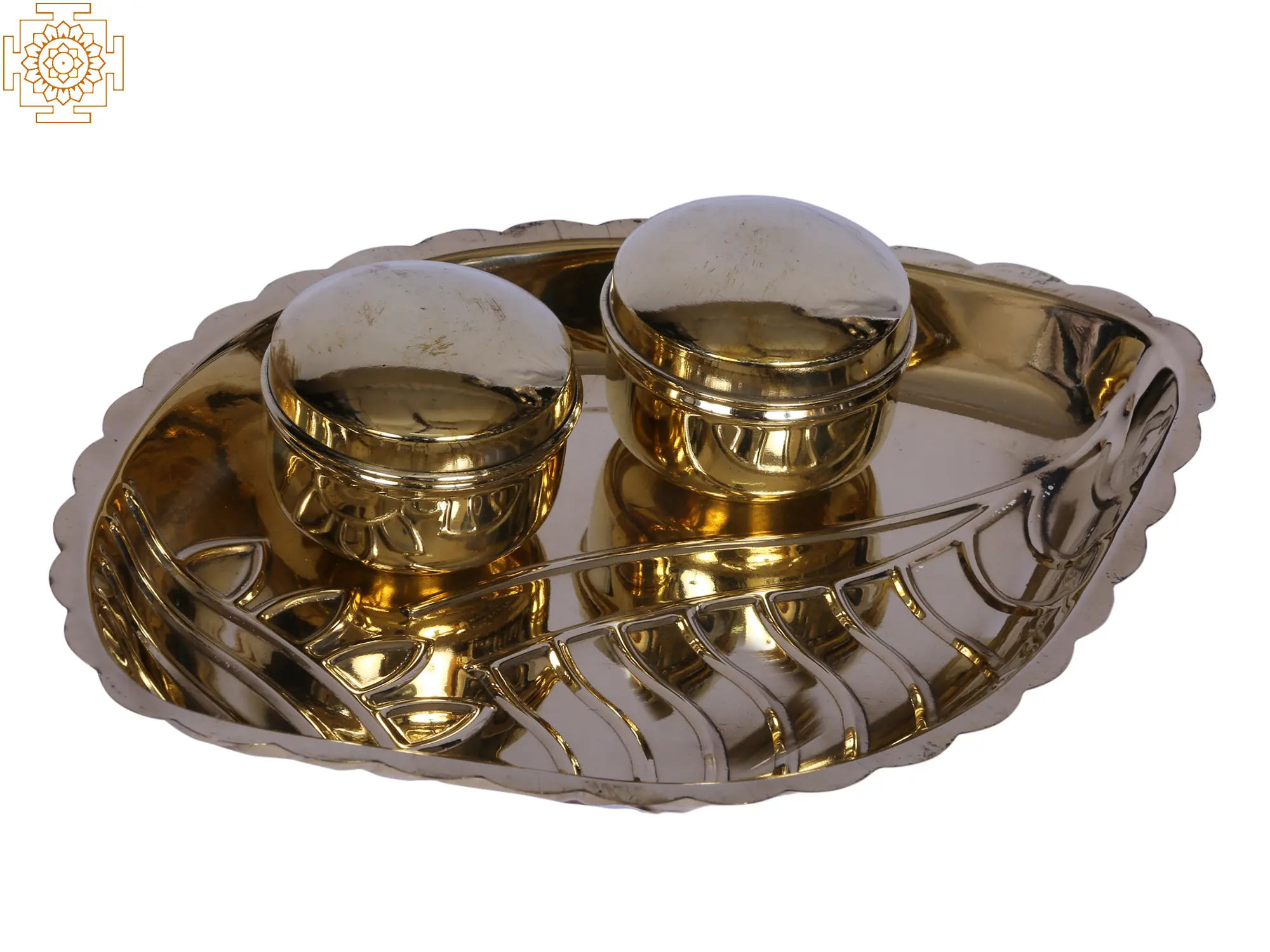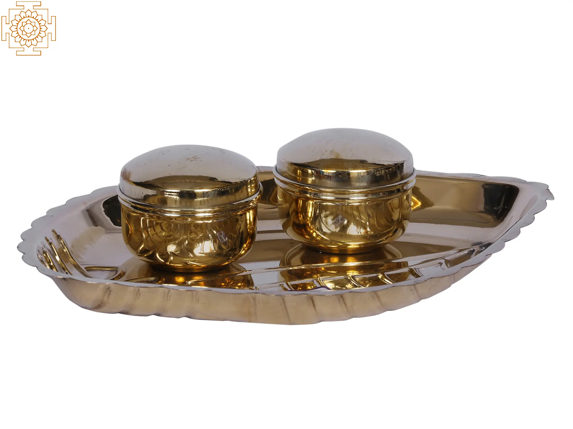 This lovely Sindoor or Roli puja box with a leaf-like plate houses two little containers, also known as Sindoor Patra, which emanate elegance and sanctity. The Sindoor or Roli, which is frequently utilized in Hindu ceremonies, is required to be kept in cleansed boxes or tiny receptacles that are appropriately equipped to store it. The boxes also come with a cover to keep the contents safe. This ritual object is made of brass, a metal known for its strength and associated with good fortune. This container is additionally adorned with a gleaming golden tint, which adds to its regal aspect and makes it a perfect complement to spiritual practices.