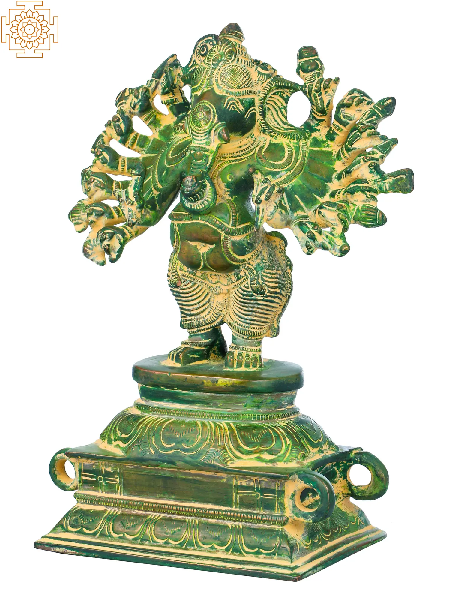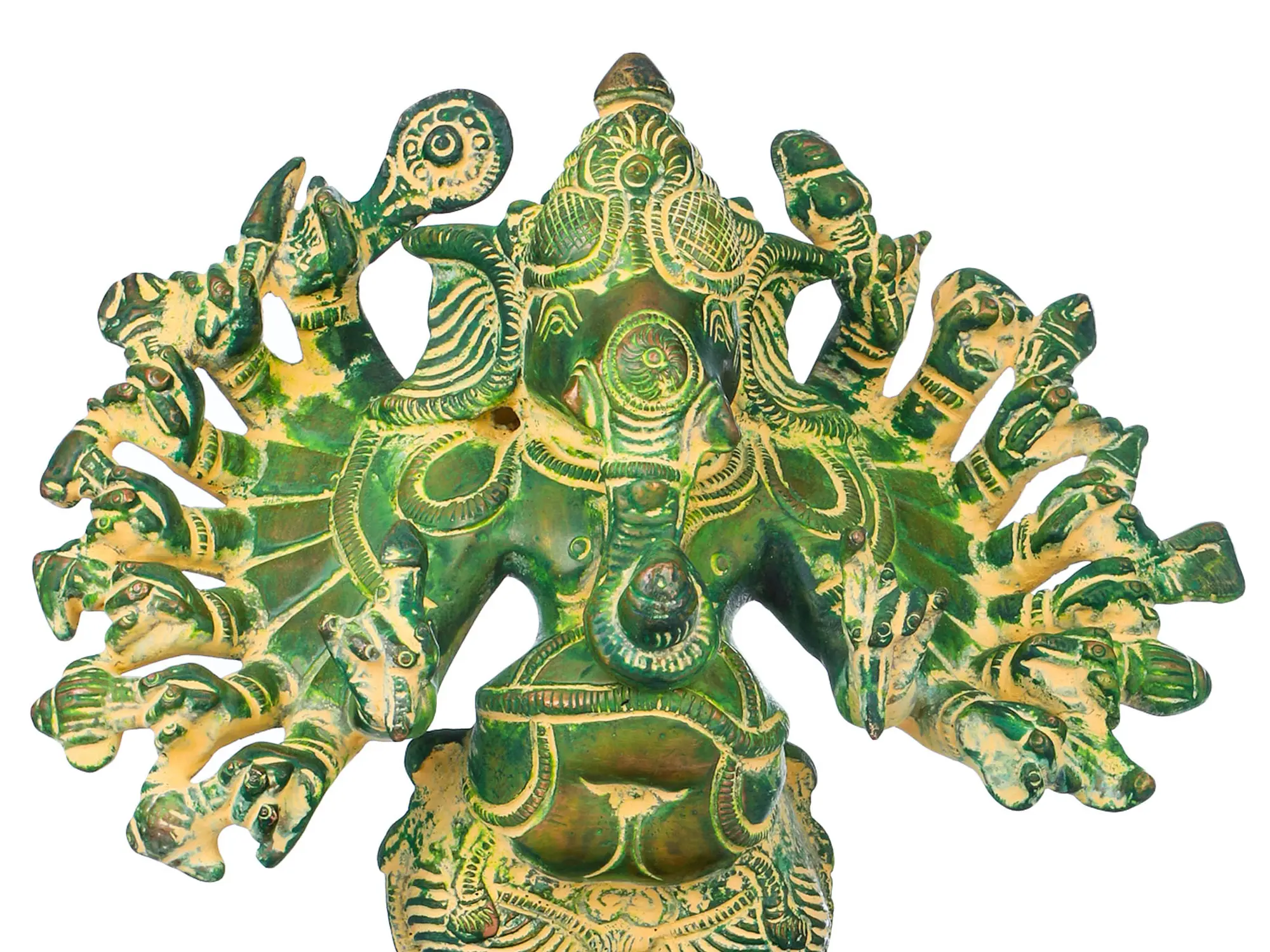 Celebrate the power and might of Lord Ganesha in his sixteen-armed Vira-Ganesha form with our magnificent brass sculpture. This handmade artwork from India captures the fierce and protective aspect of Ganesha, symbolising the philosophy of courage, strength, and the removal of obstacles. As you explore the sculpture, you'll be awed by the intricacies of Ganesha's form, the sixteen arms, each wielding a symbol of protection, and the symbolism of his role as the warrior god. This sculpture is more than just a piece of art; it's a reminder of Ganesha's might and his ability to vanquish adversities. Display this powerful artwork in your space as a symbol of courage and strength, encouraging you to overcome obstacles with unwavering resolve and faith.