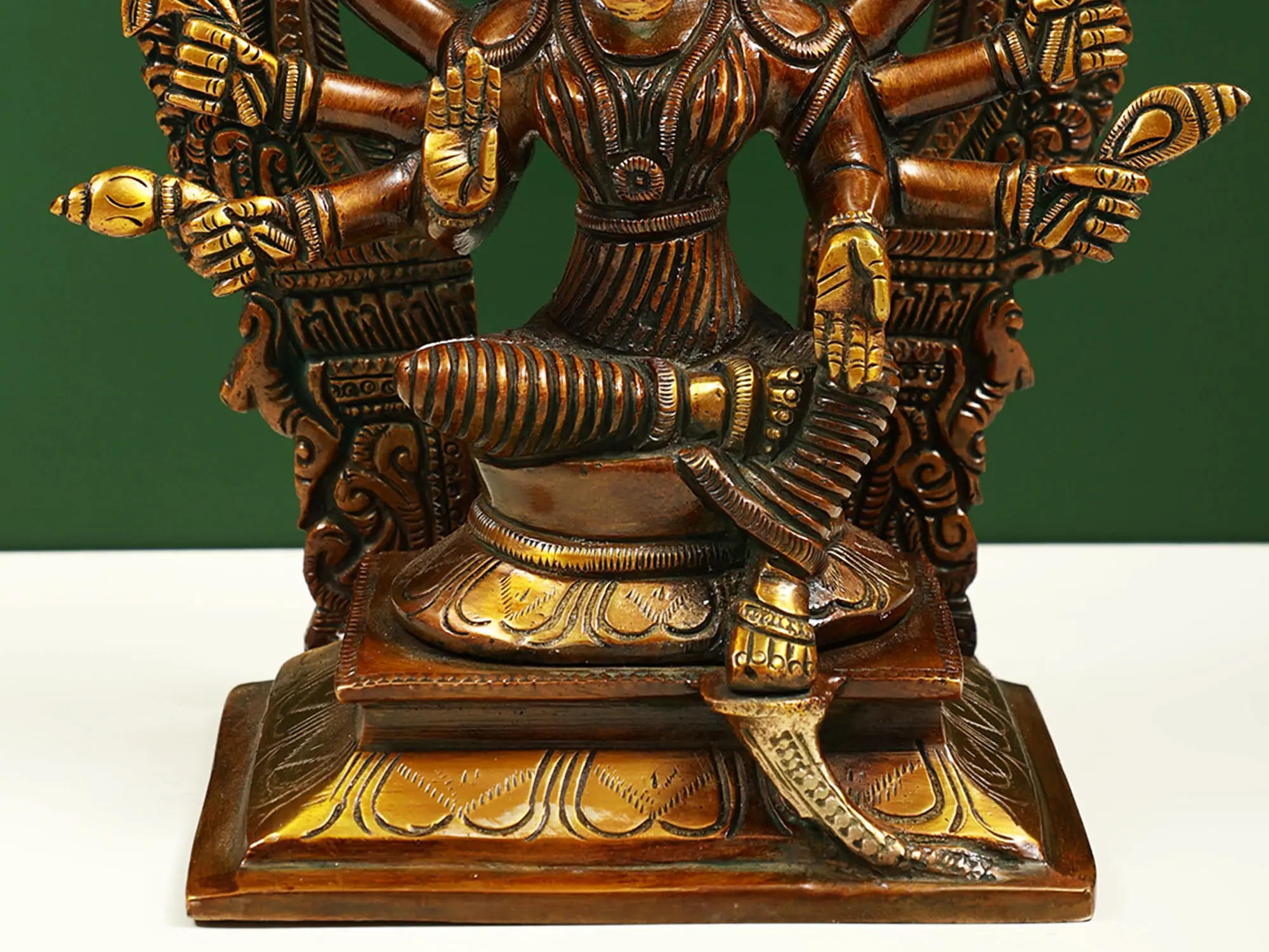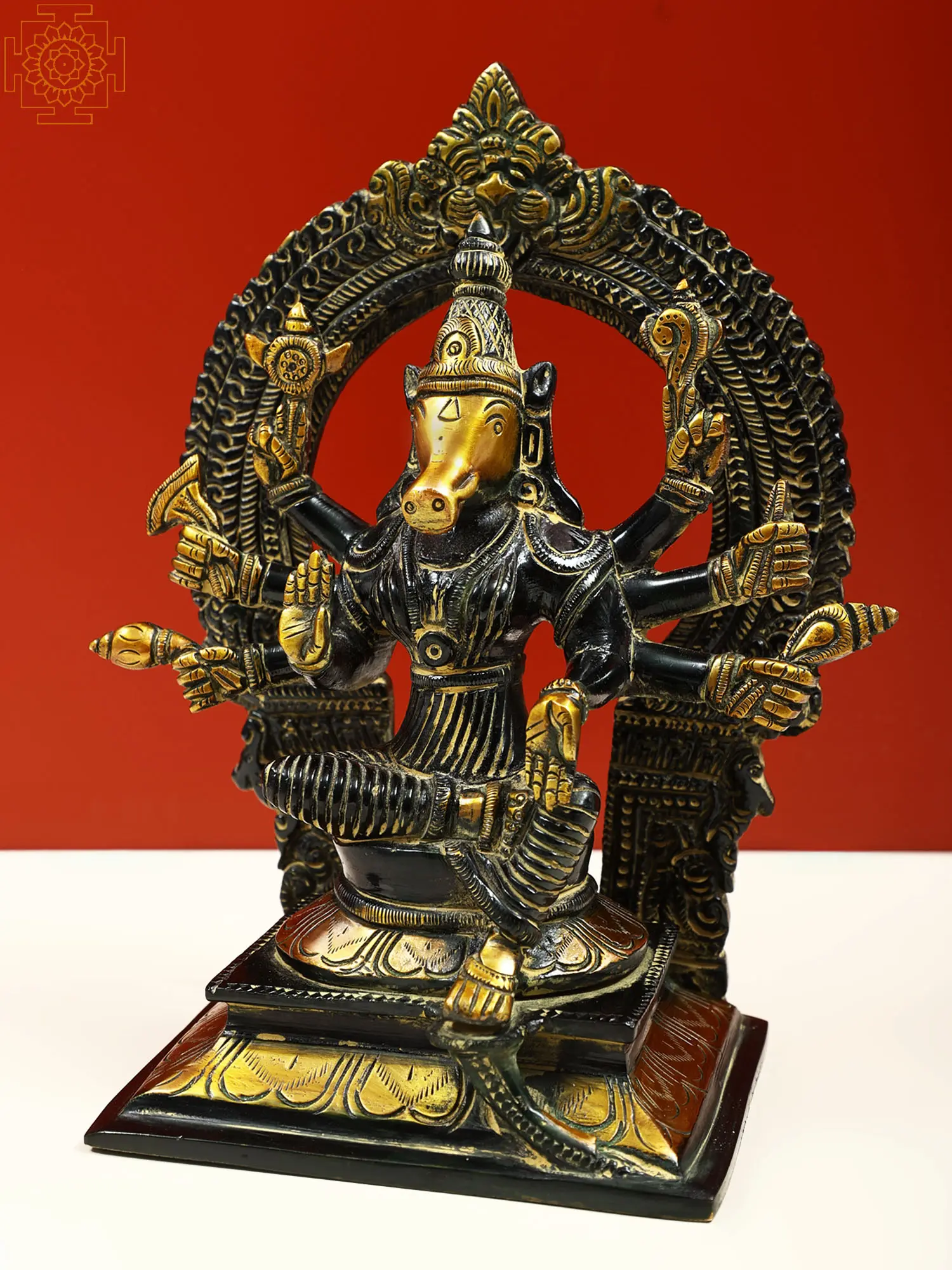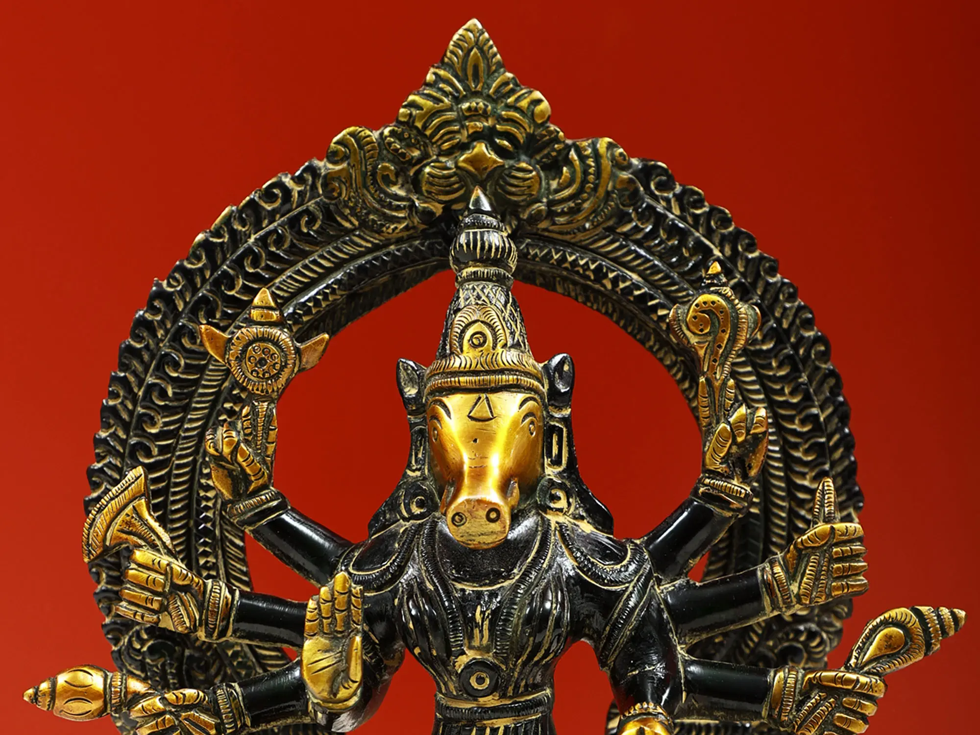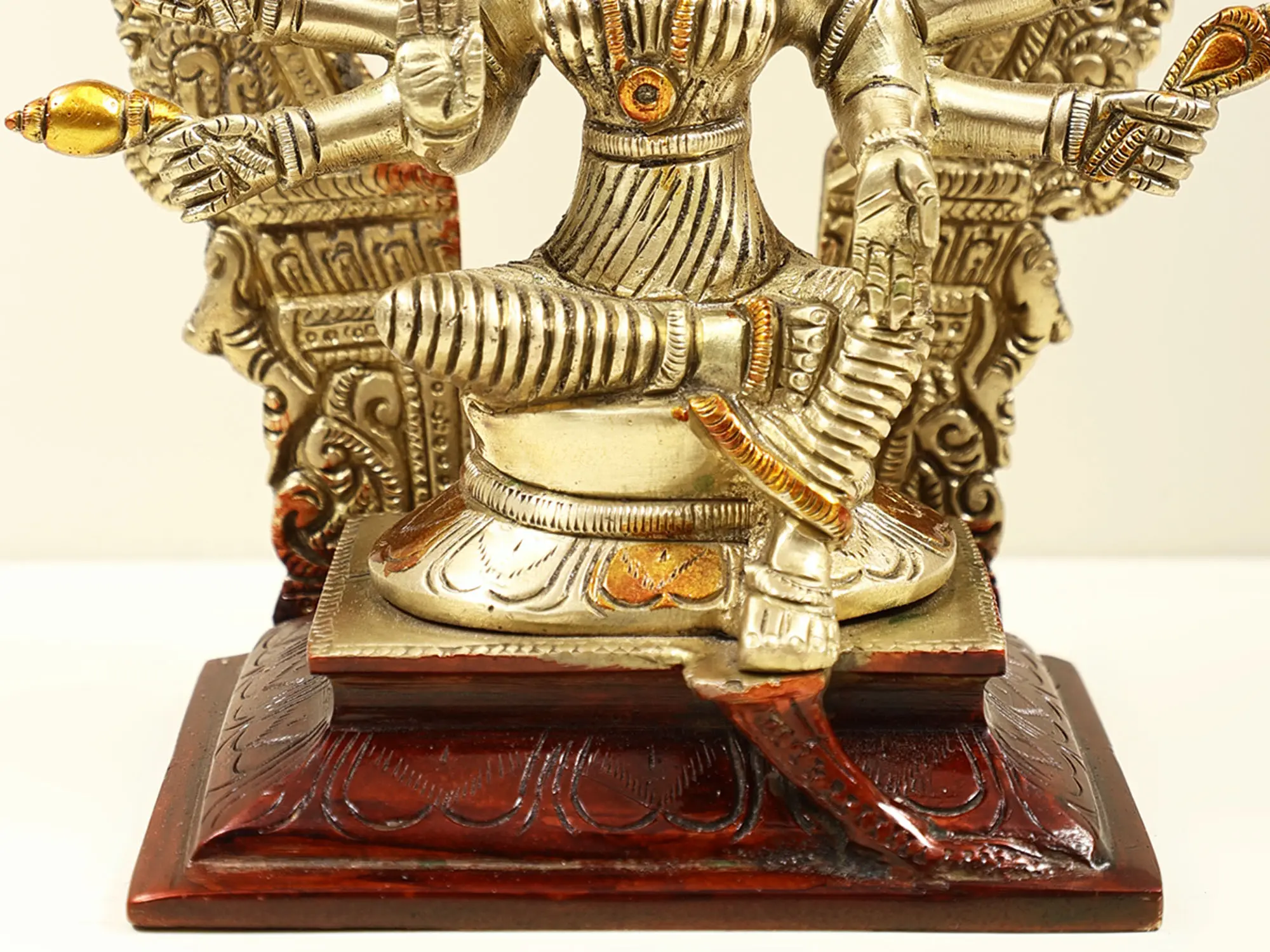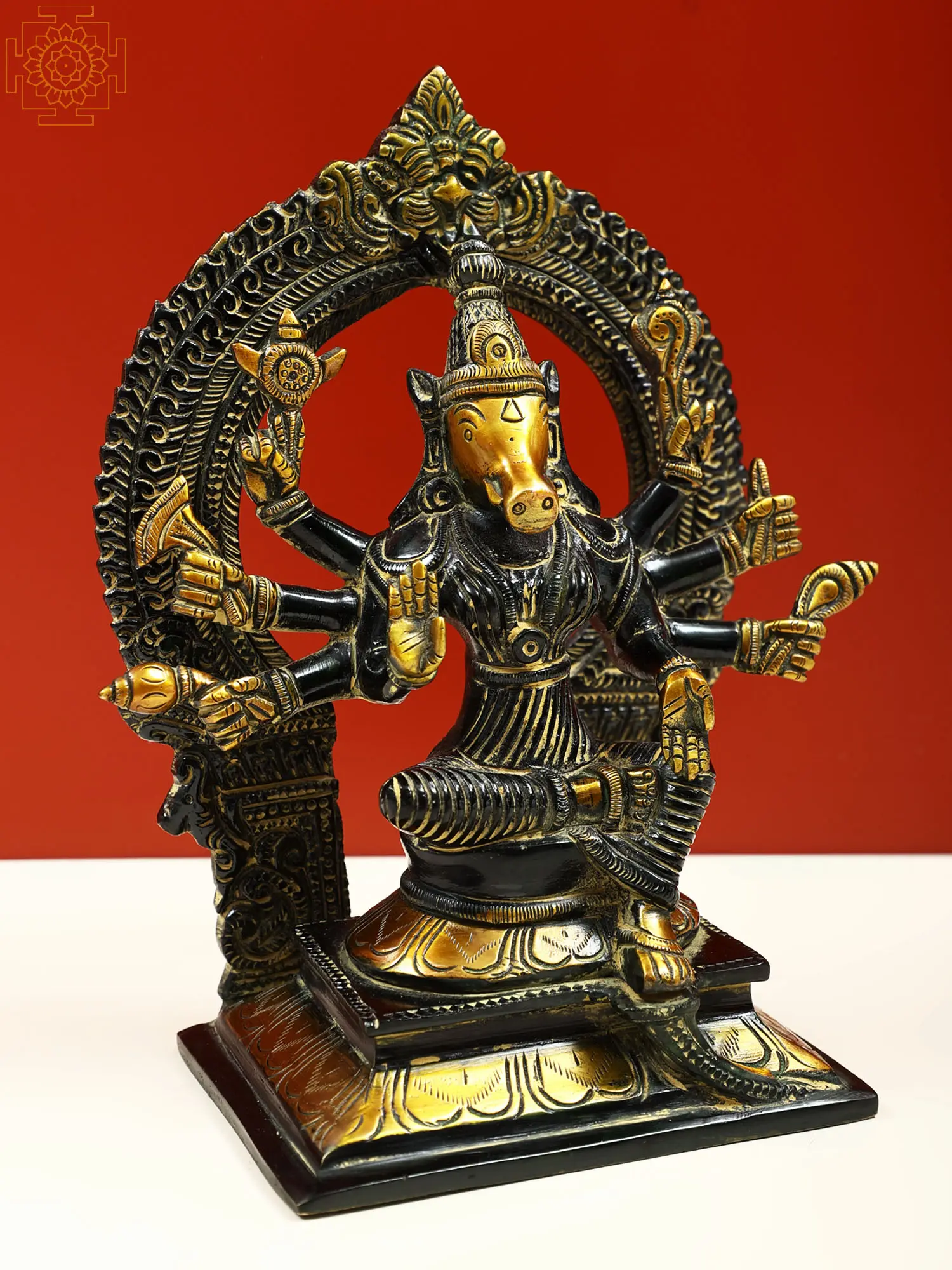 Maa Varahi is the commander of Devi Durga’s divine army of goddesses and the Shakti of Vishnu’s Varaha (boar) avatar. In Hindu Tantra, devotees revered her to attain strength, wisdom, and spiritual upliftment. This small brass statue presents her potent form as an Ashtabhuja (eight-armed) Matrika (mother). Devi Varahi sits on a lotus throne, in the posture of royal ease, surrounded by a Kirtimukha prabhavali, symbolizing the prowess of the great mother goddess.