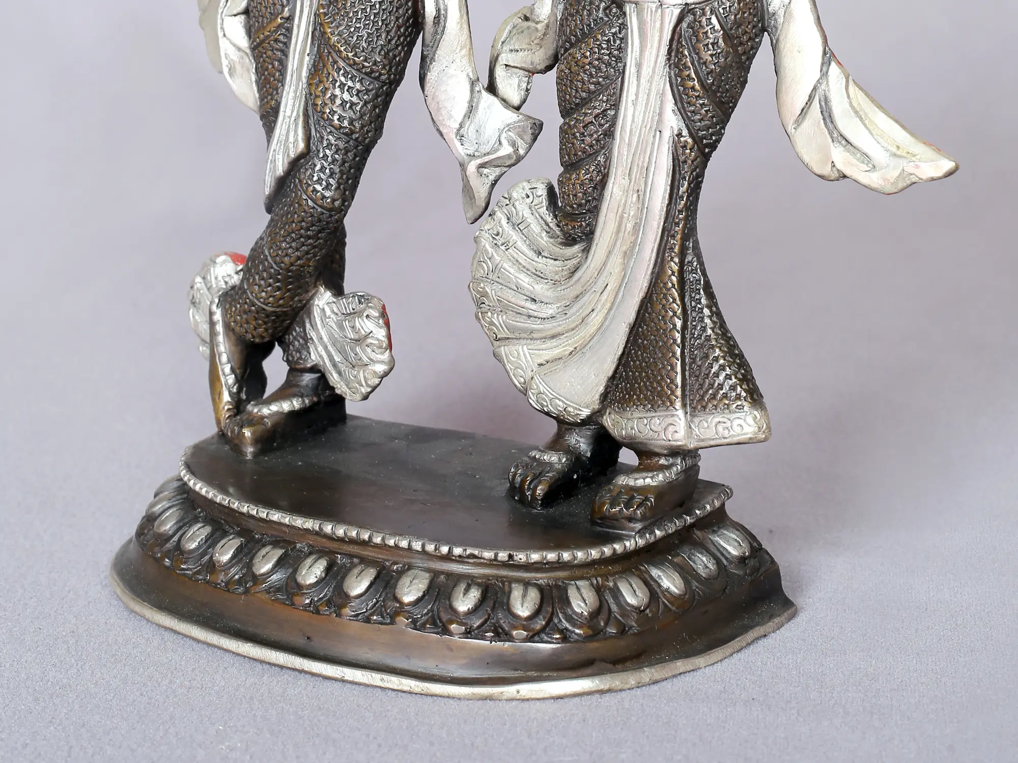 This exquisite statue captures the eternal love and divine play of Radha and Krishna, the beloved figures of Hindu mythology. Crafted in Nepal, a land steeped in spiritual artistry, this piece is a testament to the enduring devotion that surrounds this iconic divine couple. The intricate detailing and the beautiful fusion of copper with silver plating elevate this sculpture into a work of devotional art, perfect for gracing any sacred space or as a cherished heirloom.