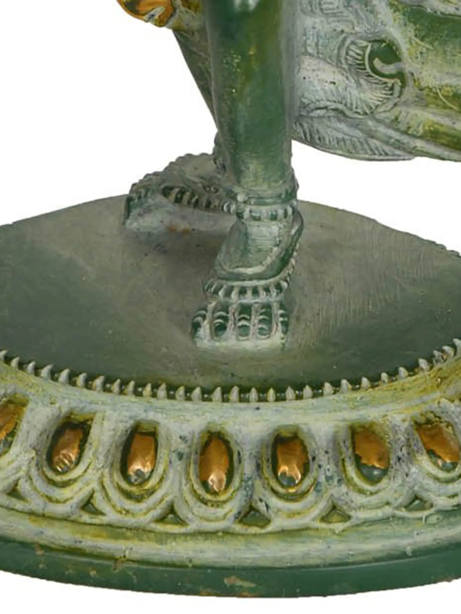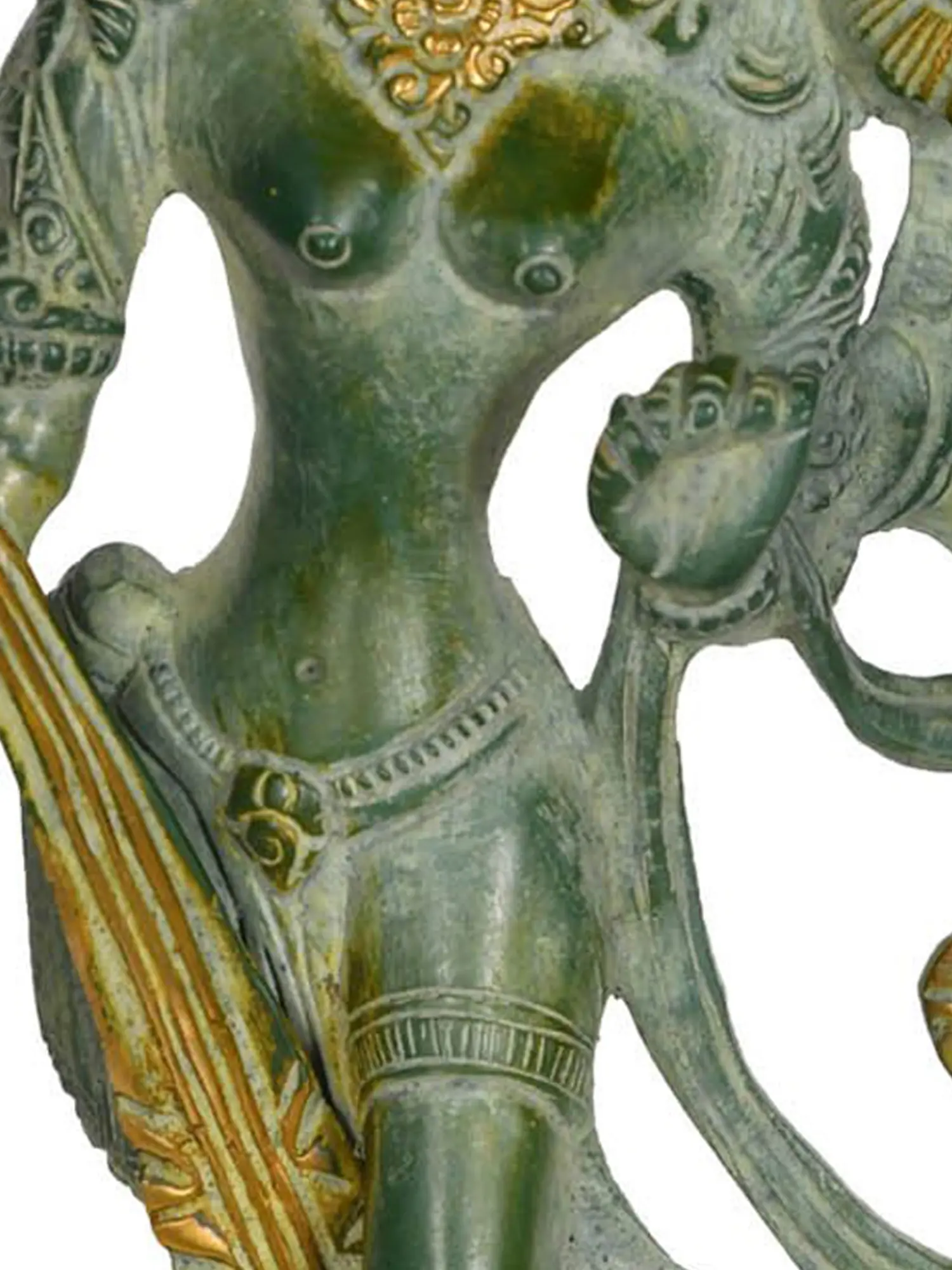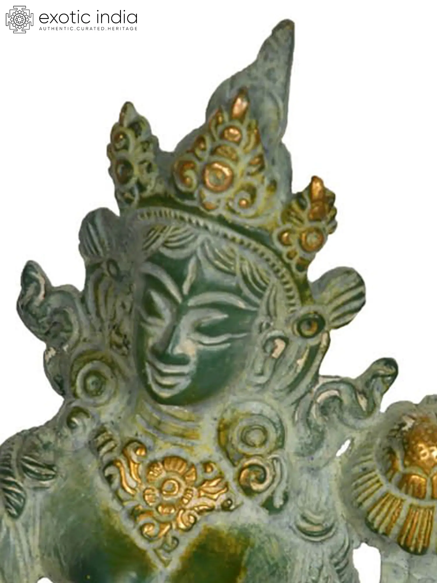 Crafted with meticulous detail in India, this brass statue is a testament to the enduring tradition of Indian craftsmanship. The use of brass, a durable and lustrous metal, lends a timeless quality to the artwork, symbolizing permanence and spiritual richness. The green patina, often achieved through natural aging or intentional treatment, evokes the verdant aspect of Tara, symbolizing her life-giving and nurturing qualities, much like the lush foliage that supports all life. The golden accents, strategically placed on her crown, jewelry, and the lotus she holds, highlight her divine status and her radiant inner light. Each fold of her garment, the delicate ornamentation, and the serene expression on her face are rendered with an artist's keen eye, inviting contemplation and devotion. The posture of Tara in this sculpture is significant. Her left leg is slightly bent, and her right leg is extended, giving the impression of gentle movement. This stance is often interpreted as Tara stepping forward to offer assistance or as her readiness to respond to prayers. In her left hand, she may hold the stem of a lotus, symbolizing purity, growth, and her ability to rise above the mundane world. Her right hand is often depicted in the *varada mudra*, the gesture of giving or boon-granting, extending outward in an offering of blessings and protection. The intricate crown and adornments further signify her royal lineage and her role as a spiritual queen, guiding devotees on the path to liberation. ––––––––––