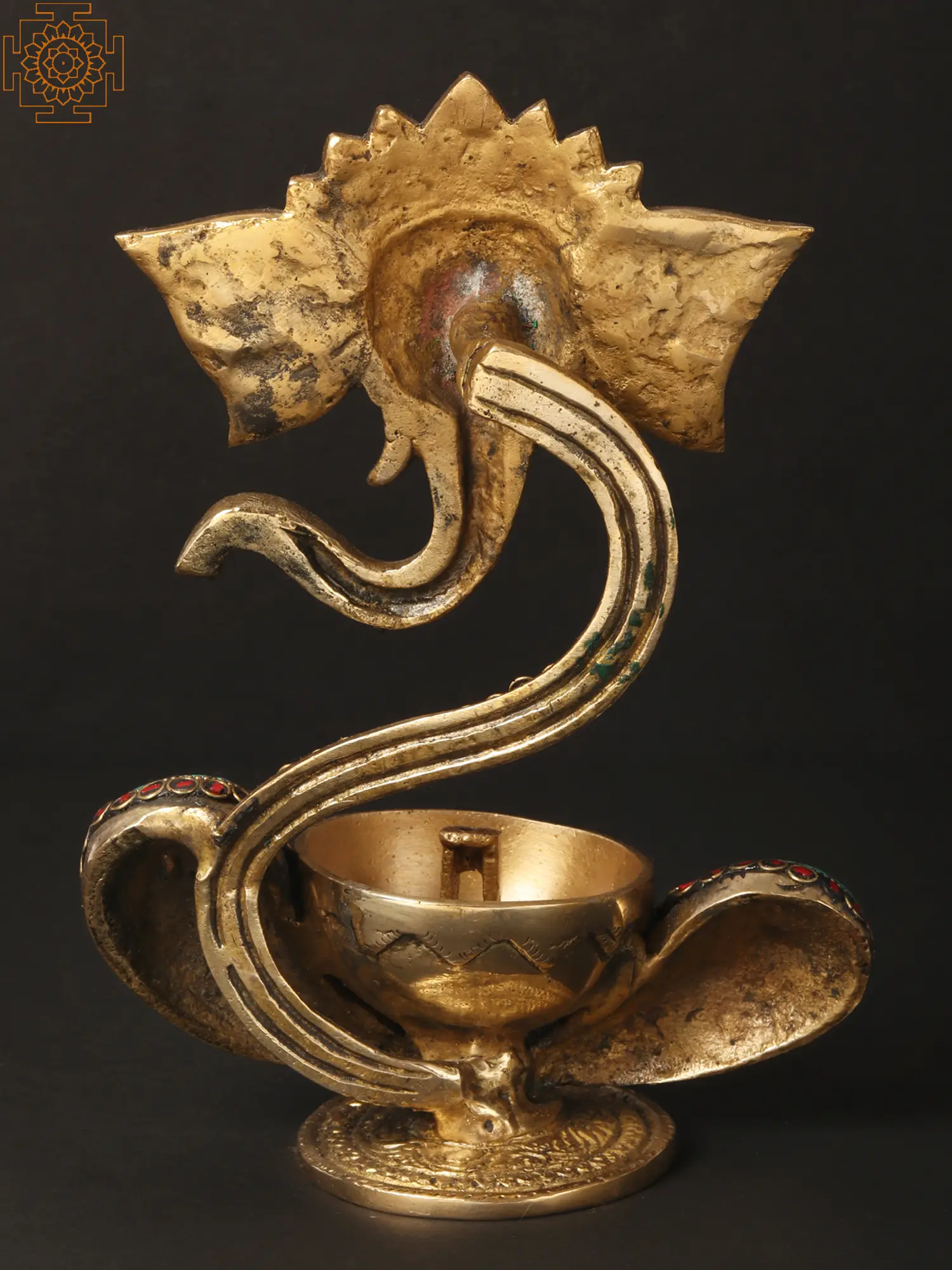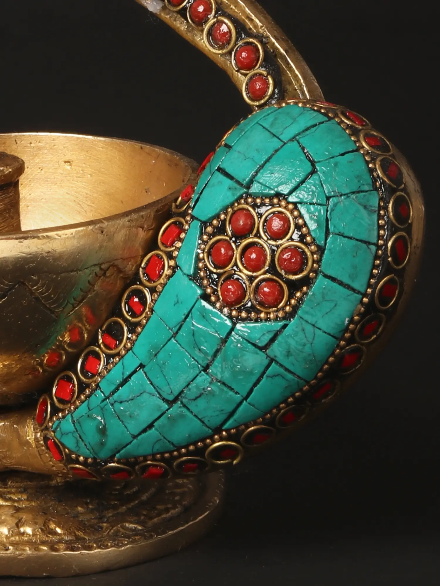 This magnificent brass oil lamp depicts Lord Ganesha as Prajvalit or in the form of a flame. This brass piece was created through the casting technique and then stamped with semi-precious stone inlay work to give it a royal appearance. The shine of the turquoise and red stones creates a beautiful color play of contrast colors. The turquoise and red colors are also royal colors. The representation of Ganesha in this piece is symbolic of prosperity and the lamp at the center is the Atma Diya. It is a combination that represents the meeting of Atma with Parmatma. Lighting this lamp in the evening or in a meditational space will definitely attract blessings of the deity and help in elevating the mood of the space.