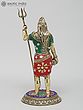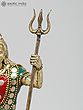 This magnificent brass statue captures the essence of Lord Shiva, the supreme deity in Hinduism, revered as the destroyer of evil and the transformer of the universe. Standing at an impressive height, this sculpture is a testament to the intricate artistry and spiritual devotion that permeates Indian craftsmanship. Lord Shiva, also known as Mahadev, the Great God, is depicted here in a pose that exudes both immense power and profound serenity. His iconic Trishul, a trident symbolizing the three aspects of consciousness (consciousness, unconsciousness, and subconsciousness) or the three gunas (Sattva, Rajas, and Tamas), is held firmly in his hand, ready to dispel ignorance and protect righteousness. The statue showcases a remarkable level of detail. Lord Shiva's divine form is adorned with a dhoti, intricately wrapped and further embellished with what appears to be a celestial garment. This garment is a vibrant tapestry of color and texture, featuring rich red and green hues, intricately decorated with fine beadwork and interspersed with gleaming circular motifs that catch the light. This visual splendor is further enhanced by exquisite inlay work, bringing a jewel-like quality to the sculpture and highlighting the divine aura of Mahadev. The base of the statue is equally ornate, a circular platform designed with vibrant, inlaid stones in shades of blue and green, surrounded by a richly patterned brass border that speaks of the earthly realm from which this divine presence emerges.