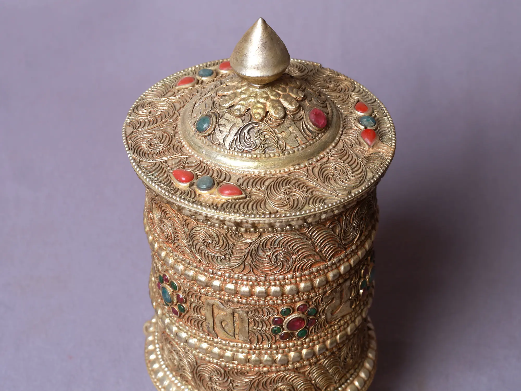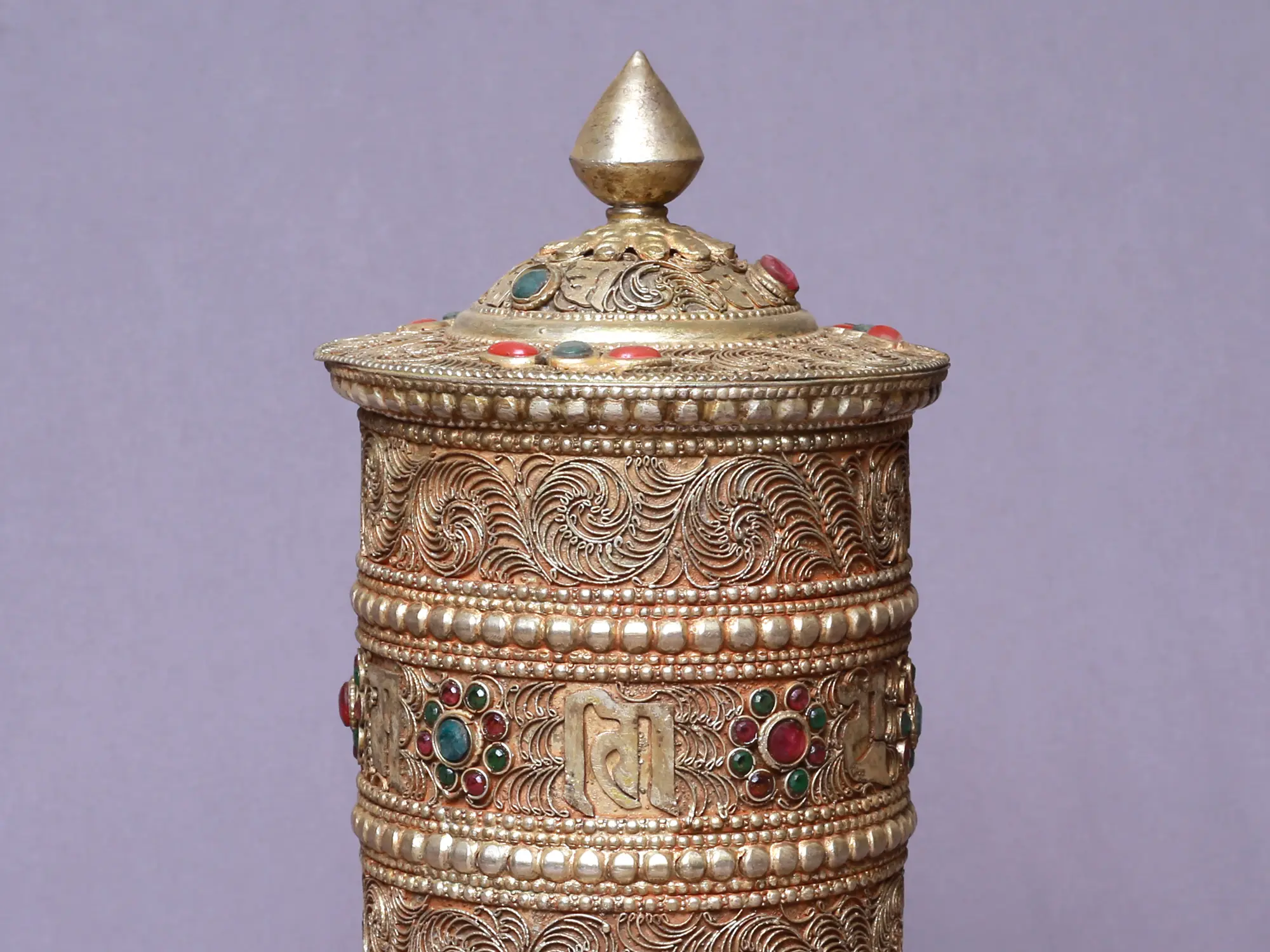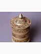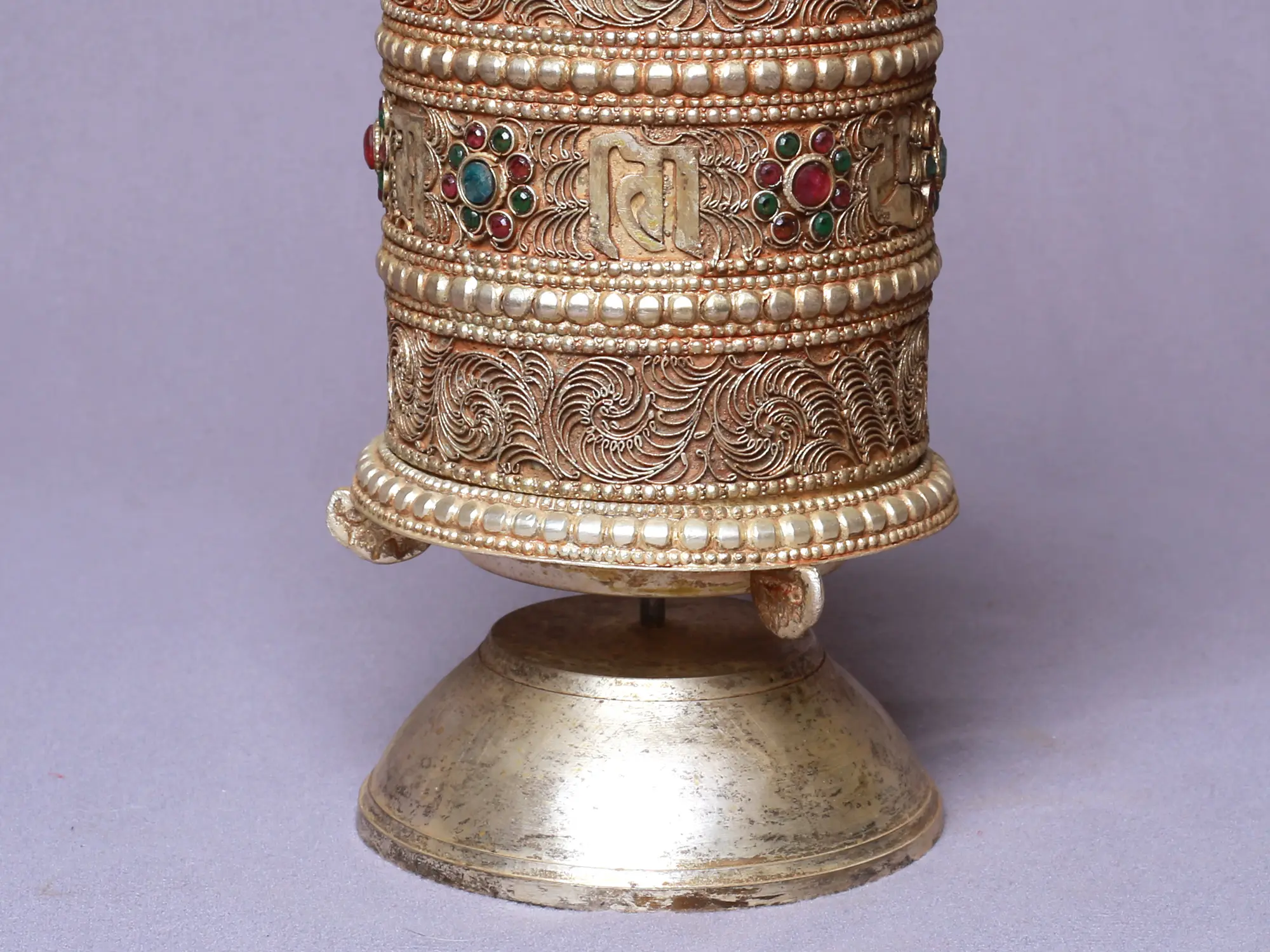 The Three Lines Siku Extra Fine Silver Plated Prayer Wheel is a valuable and intricately crafted piece that is a representation of spirituality and wisdom that comes with total meditative practices. This prayer wheel is carved with exquisite patterns and plated with extra fine silver, creating a stunning visual appeal. With a touch of serene coral and green crystals, it radiates spiritual energy and beauty. The three lines of mantra carved onto the wheel can aid in performing meditative practices with focus, serving as a vehicle for invoking blessings and enlightenment. This prayer wheel is a treasured possession for those seeking a deeper connection with the divine and a transformative spiritual journey.