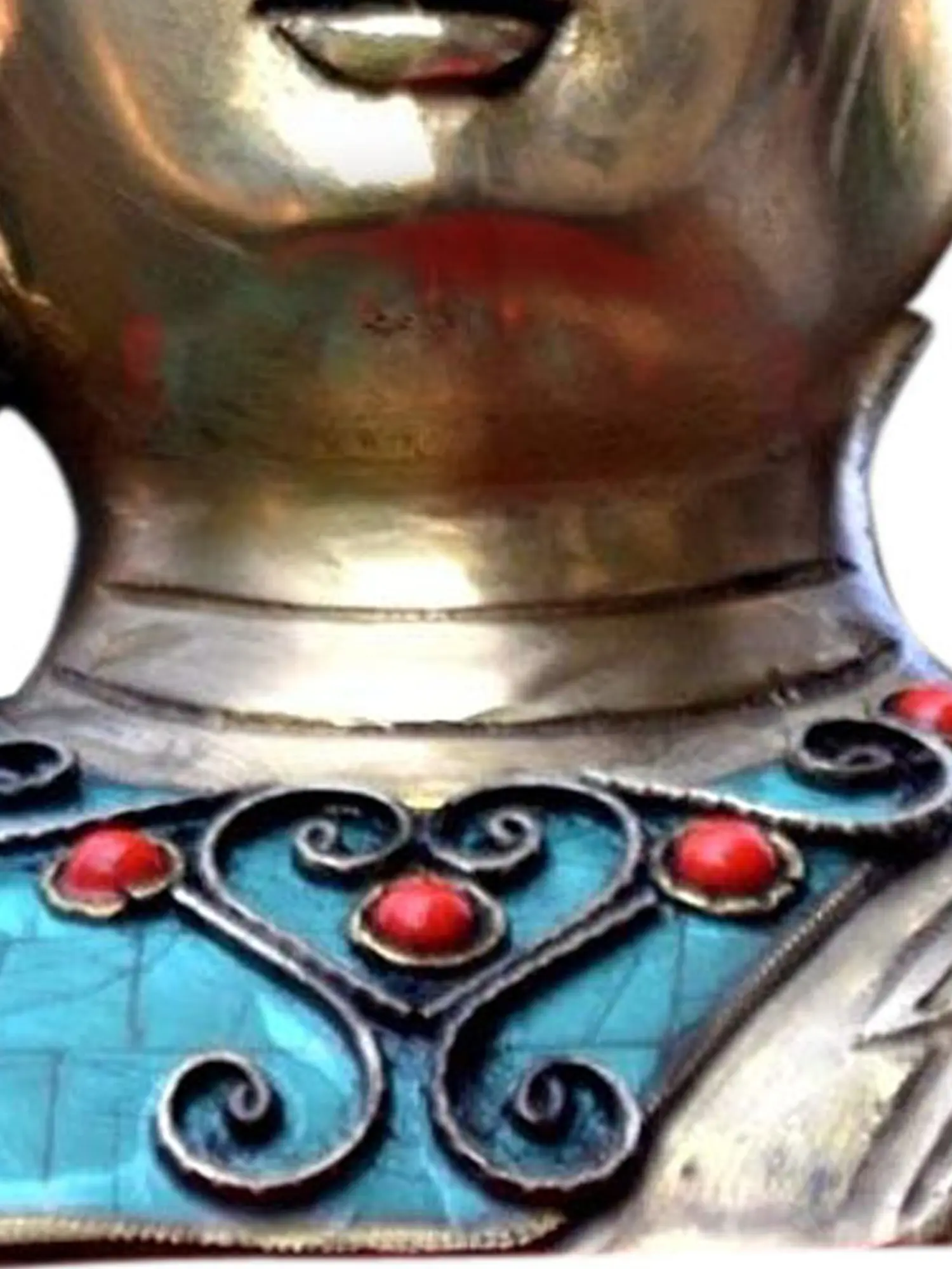 The forehead features a prominent red inlay, likely a representation of the Urna, a mark of Buddha's spiritual vision, said to possess clairvoyant powers. The intricate details adorning the robe, with its turquoise-like inlay and striking red accents, add a regal touch, reminiscent of the rich artistic traditions of Tibetan Buddhism. These decorative elements are not merely ornamental; they are imbued with symbolism, reflecting the multifaceted nature of the path to enlightenment and the adornments of awakened beings. The urna, for instance, is often depicted as a radiant jewel or a swirling vortex of light, symbolizing ultimate wisdom. The robes themselves, often depicted in vibrant hues in Tibetan art, signify the renunciation of worldly possessions and the embrace of a spiritual life.