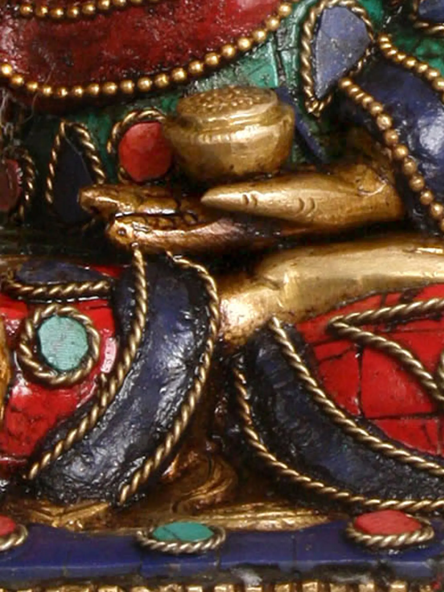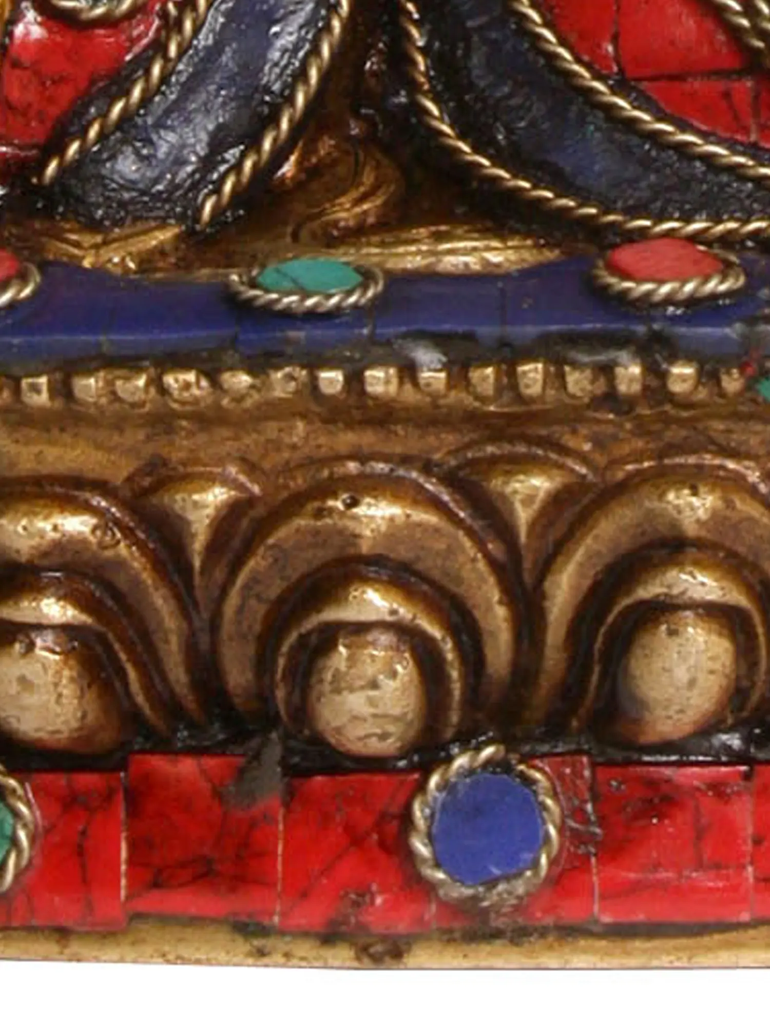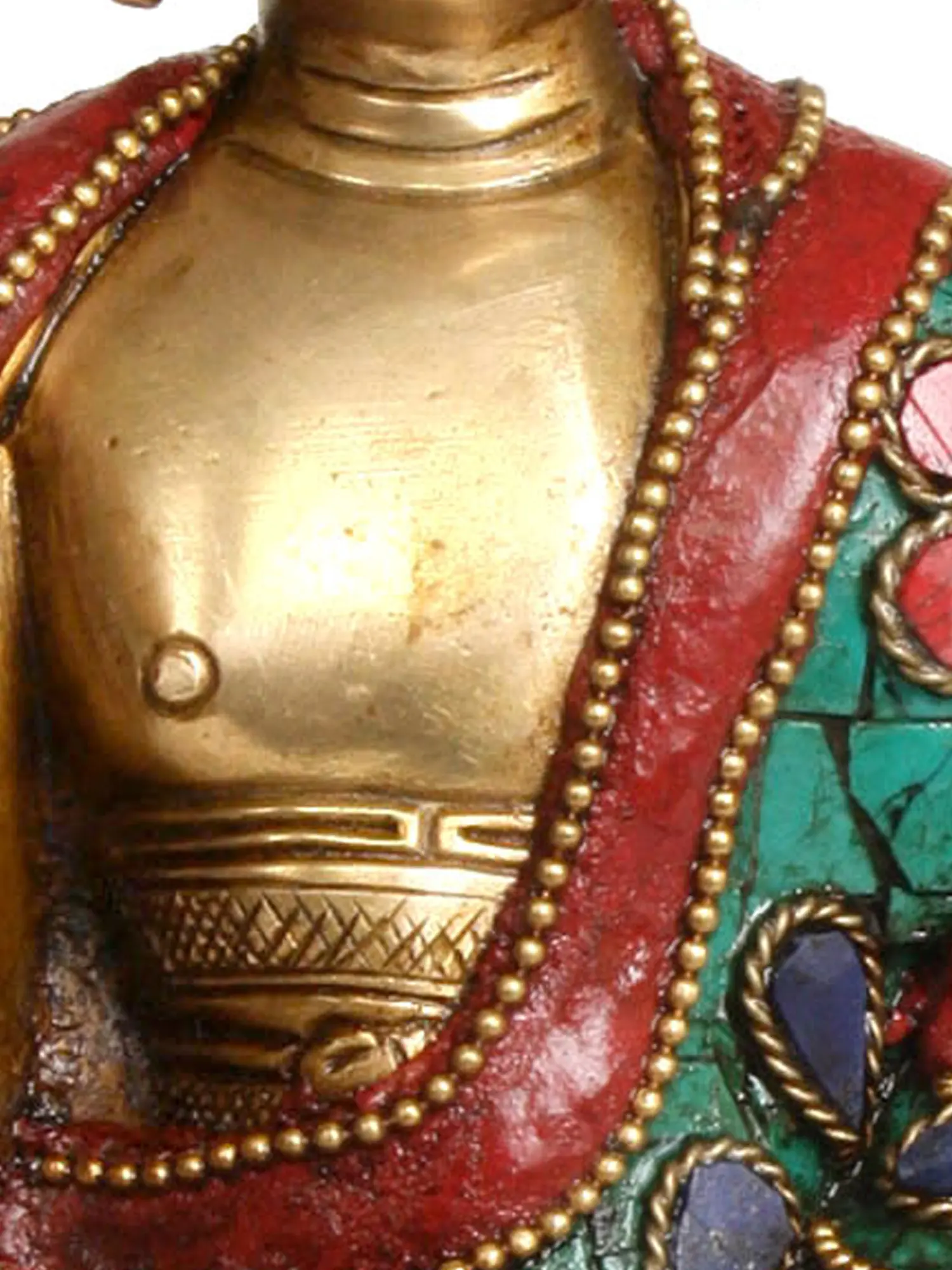 Handmade in India, this statue is a testament to the skill and dedication of traditional artisans. The use of brass, a material with a rich history in religious iconography, lends a timeless quality and a warm, inviting sheen to the figure. The intricate inlay work, featuring vibrant stones that evoke the colors of nature and spiritual energy, adds a unique and captivating dimension to the piece. The red, blue, and green stones are not merely decorative; they are often associated with protective energies, wisdom, and vitality in various cultural and spiritual traditions. The detailed rendering of the Buddha's robes, adorned with delicate beadwork, further emphasizes the artistry and reverence with which this sacred image has been created. This statue is more than just an object; it is a conduit for devotion, a reminder of the path to liberation, and a beautiful expression of Indian artistic heritage.