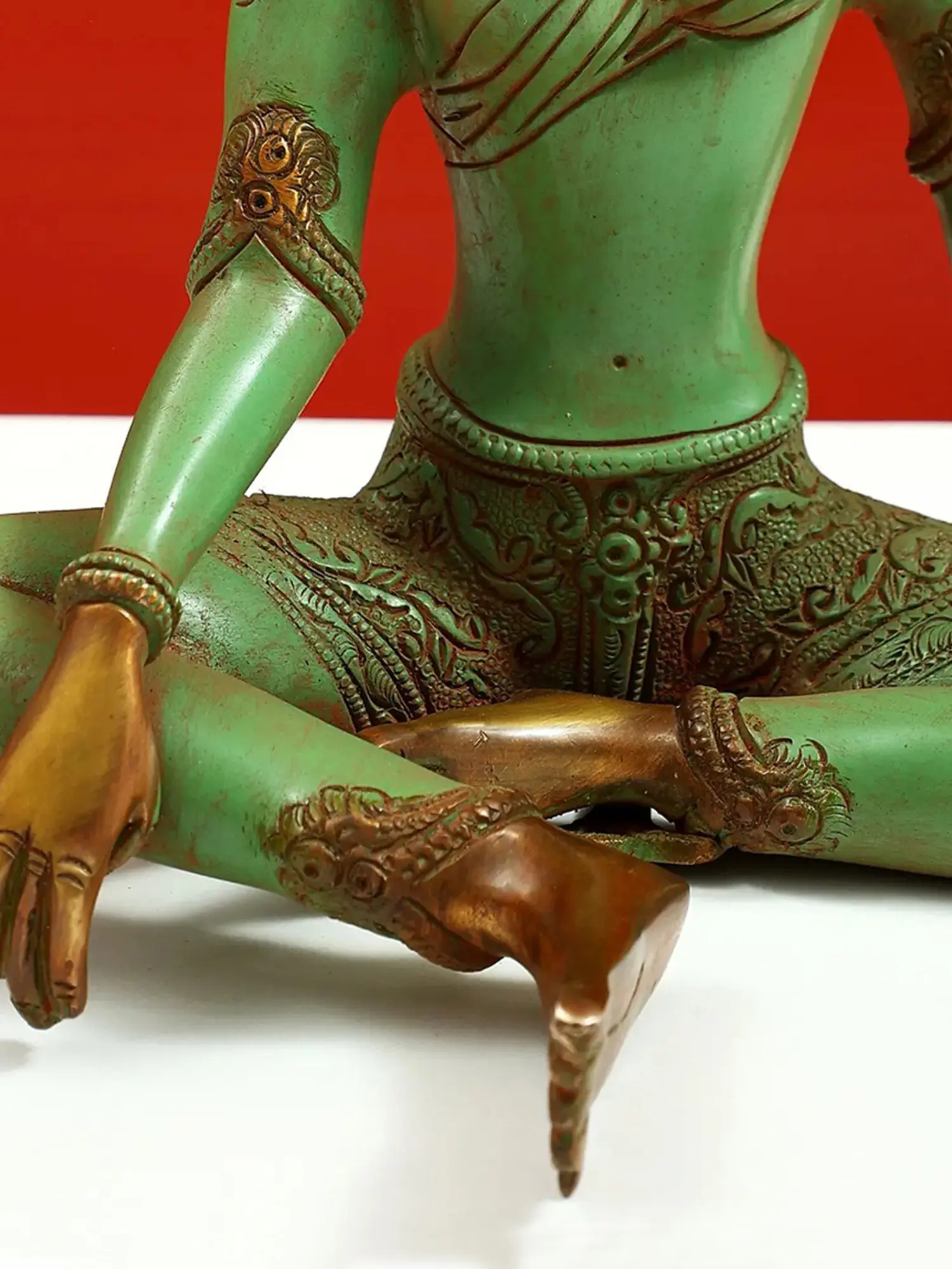 Immerse yourself in the compassionate and protective energy of Green Tara with our finely crafted brass sculpture. Handmade with deep reverence in India, this artwork embodies the essence of compassion, guidance, and protection, central to Tibetan Buddhist philosophy. As you study this sculpture, you'll appreciate the intricate details that convey Green Tara's serene countenance and the symbolism in every aspect of her form. Green Tara's role as the swift savior and compassionate guide is central to Tibetan Buddhist philosophy, and this sculpture serves as a constant reminder of her loving presence and the path to spiritual liberation.