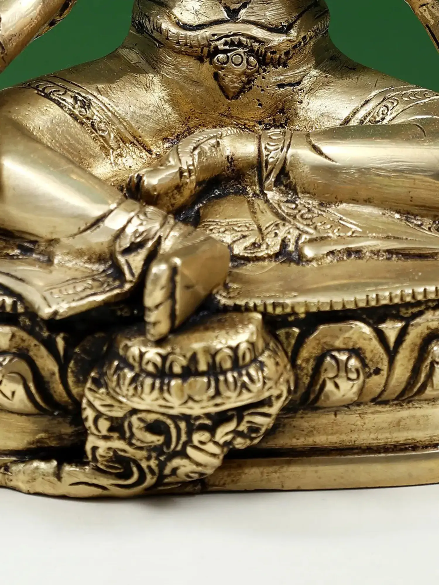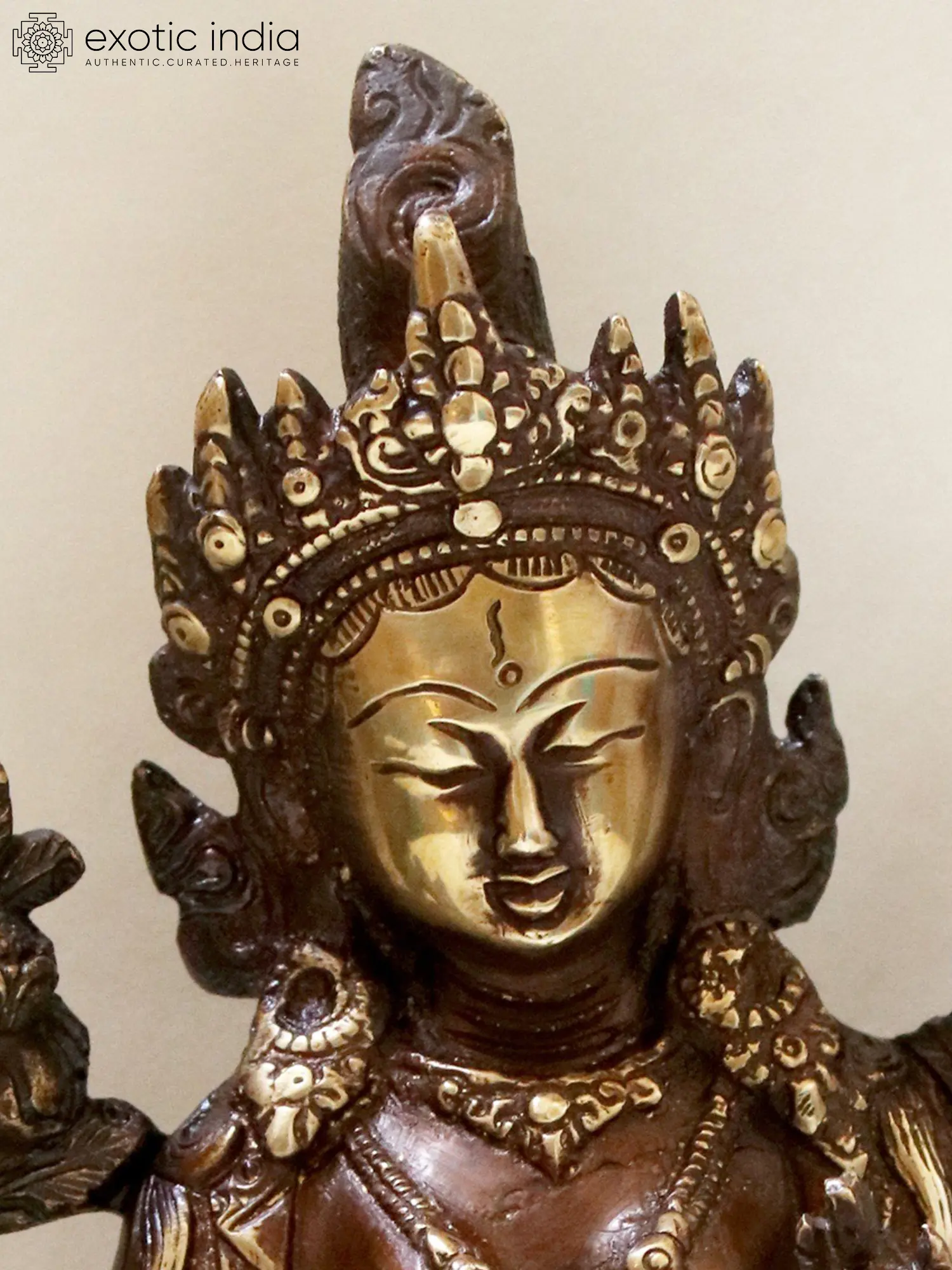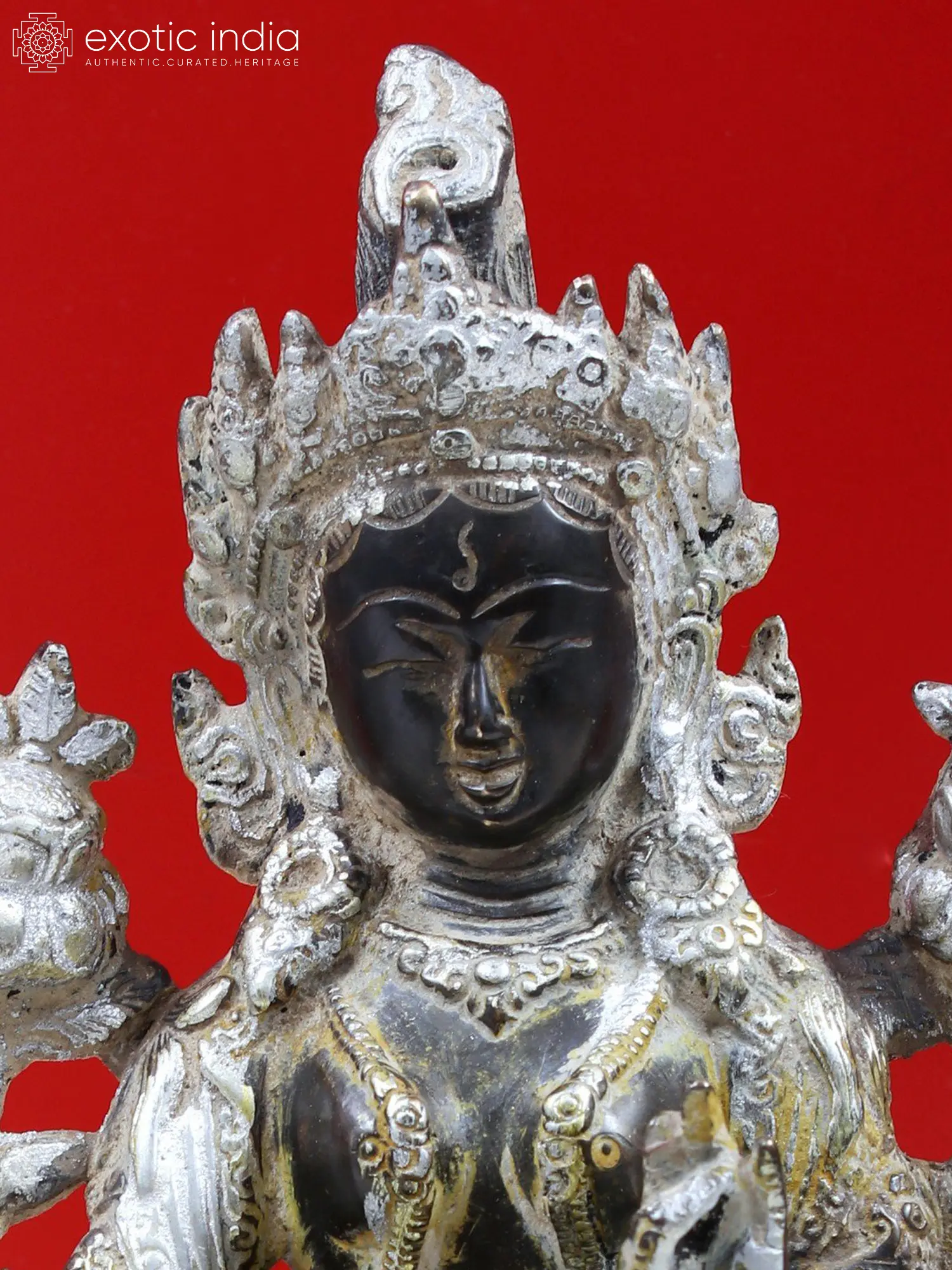 The brass embodiment of Green Tara, the Tibetan Buddhist deity who bestows salvation, is a captivating work of art. Painted with an antique black and silver finish, it exudes timeless elegance. Green Tara, with her compassionate gaze, is adorned with grace. She holds delicate lotus buds, symbols of purity and enlightenment. Her serene countenance and gentle demeanor offer solace and protection to those who seek her aid. This exquisite statue not only represents the divine feminine in Tibetan Buddhism but also serves as a visual testament to hope, compassion, and the ever-present possibility of liberation.