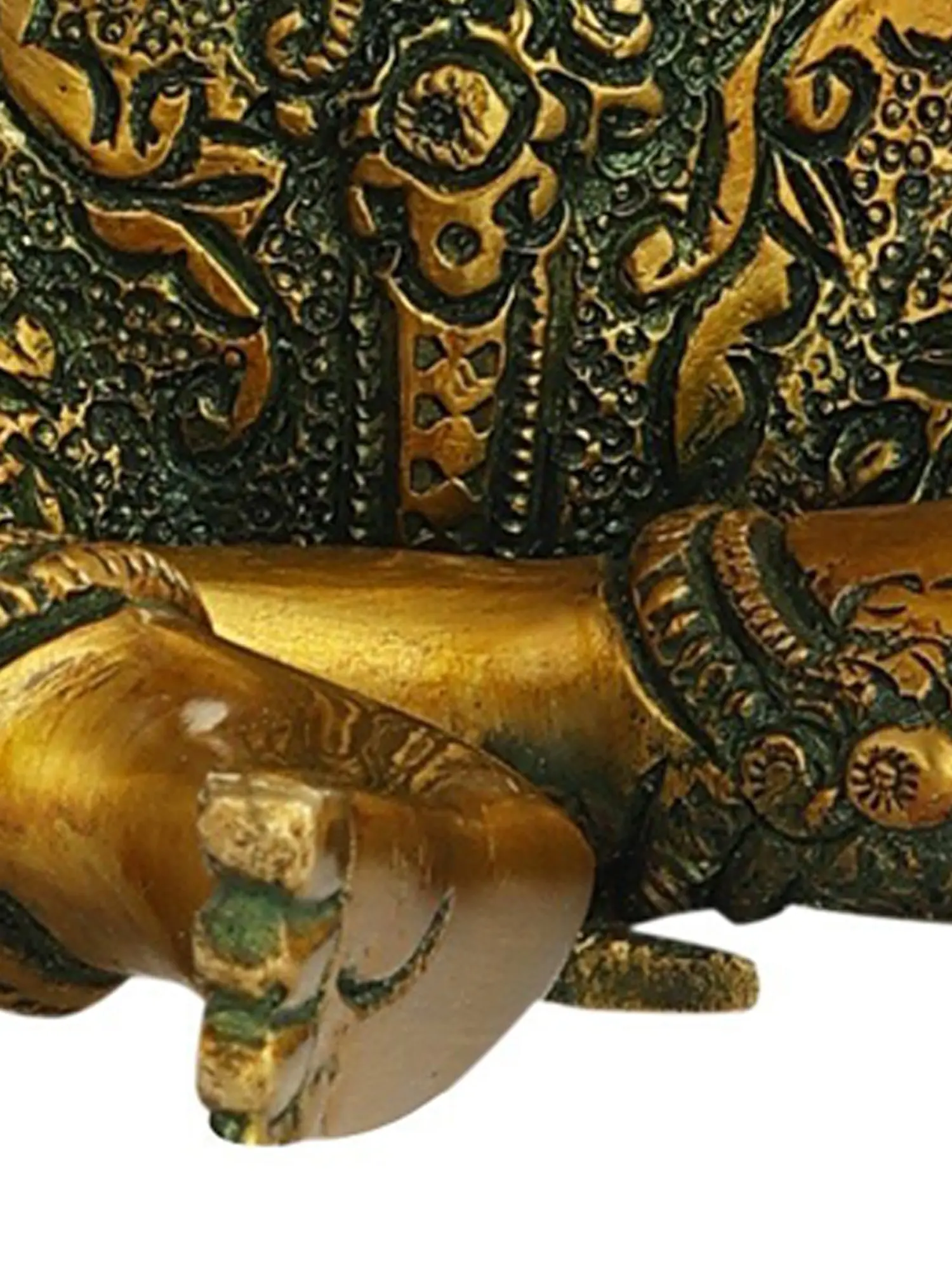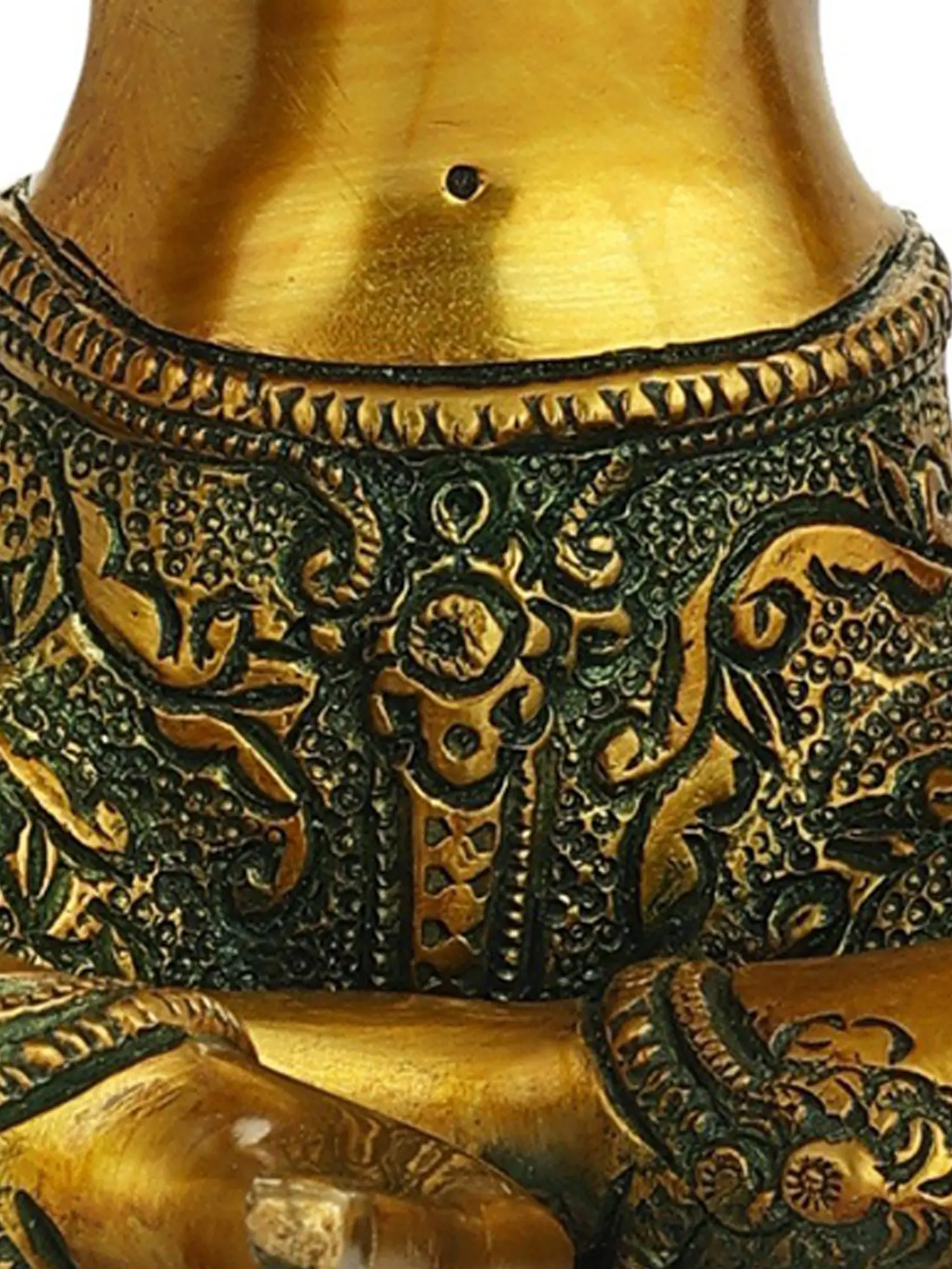 Meticulously handcrafted in India, this brass statue showcases the exceptional skill of traditional artisans. The detailed ornamentation adorning her garments, jewelry, and armbands speaks volumes about the dedication and artistry involved in its creation. The lustrous brass, finished with an antique patina, lends a timeless quality to the sculpture, enhancing its spiritual aura. Each curve and detail has been carefully rendered to bring forth the divine grace and power of Green Tara. The smooth, polished surface is a testament to the skilled hands that shaped this sacred object, making it a truly remarkable work of art.