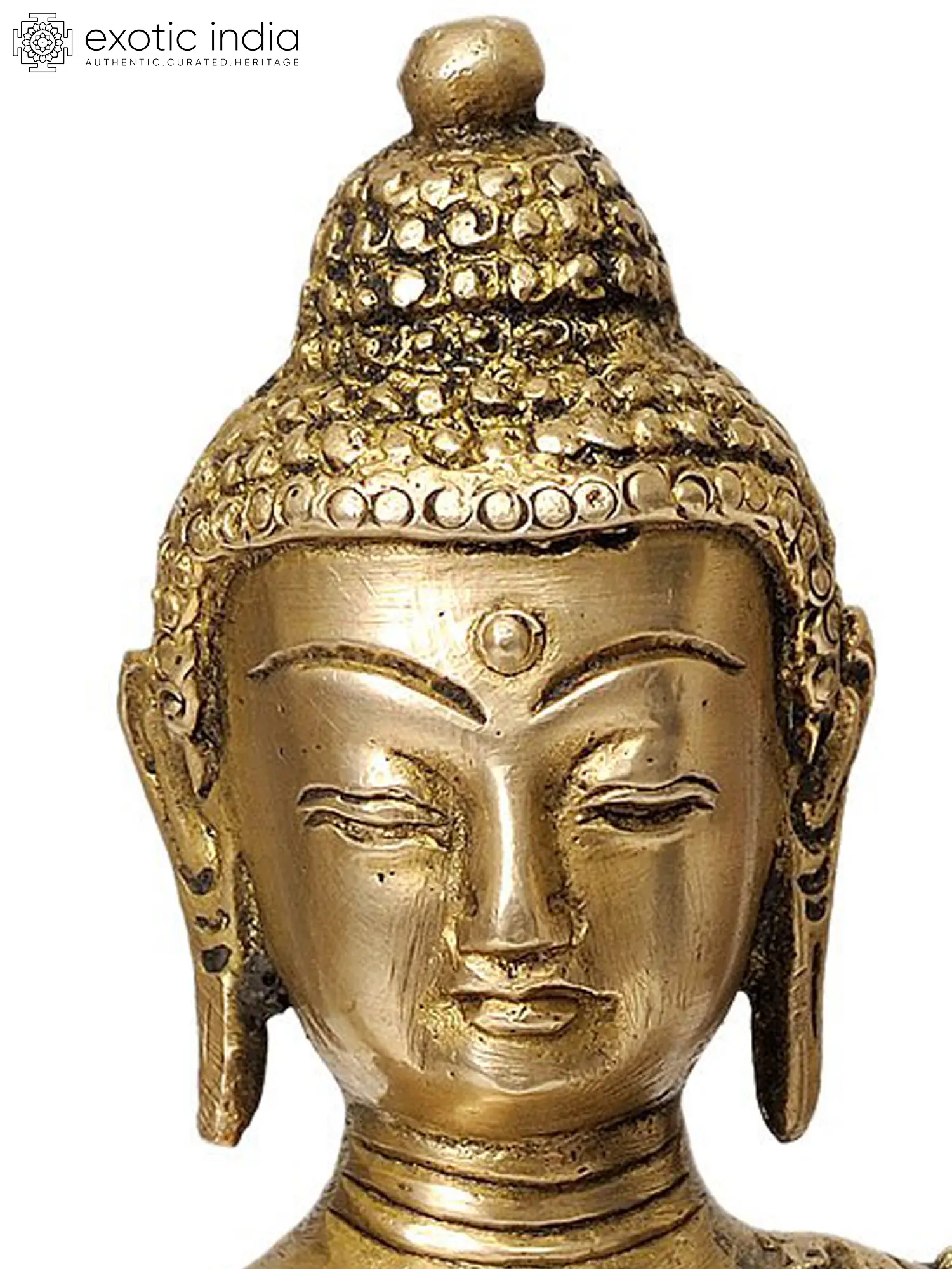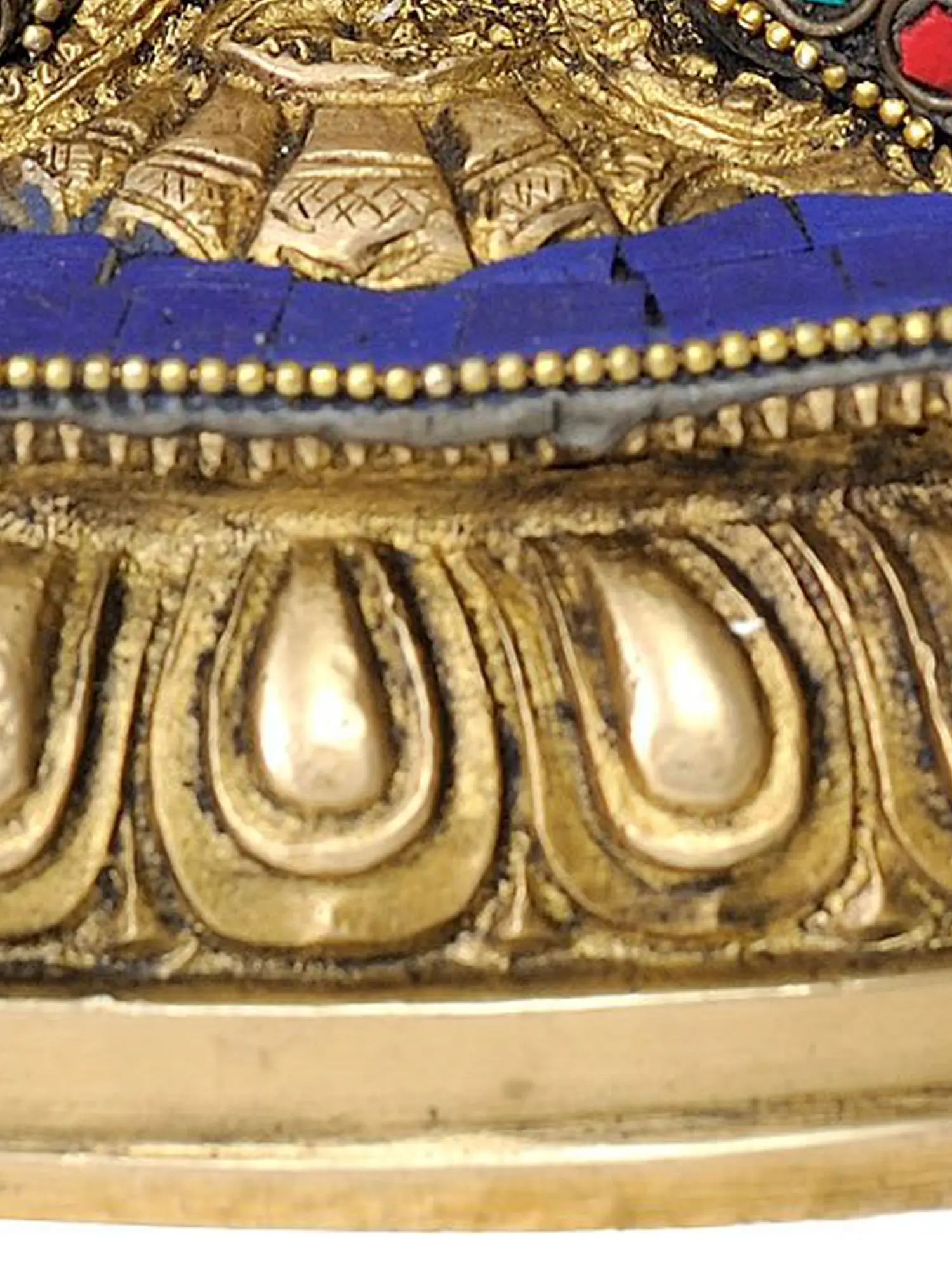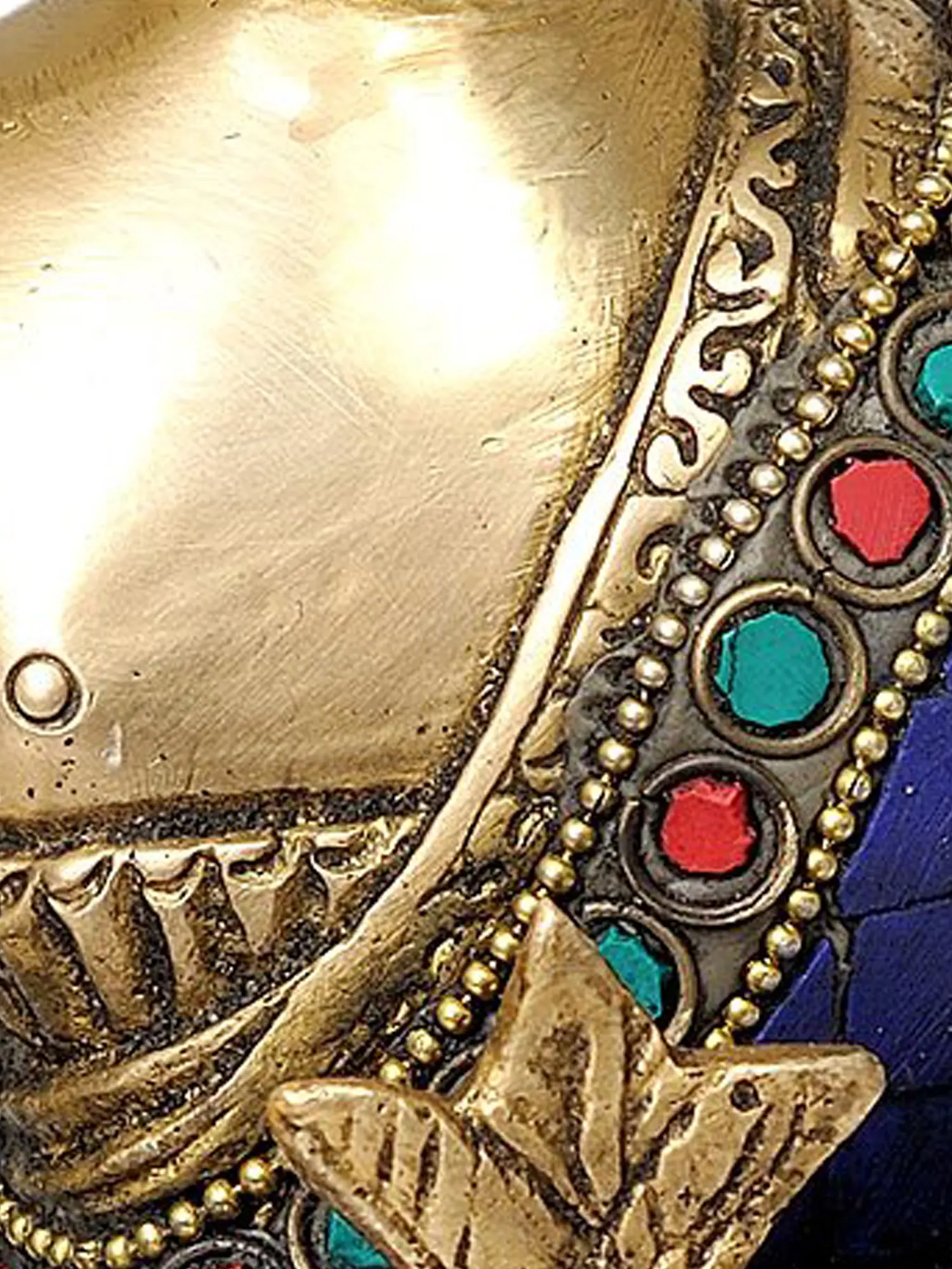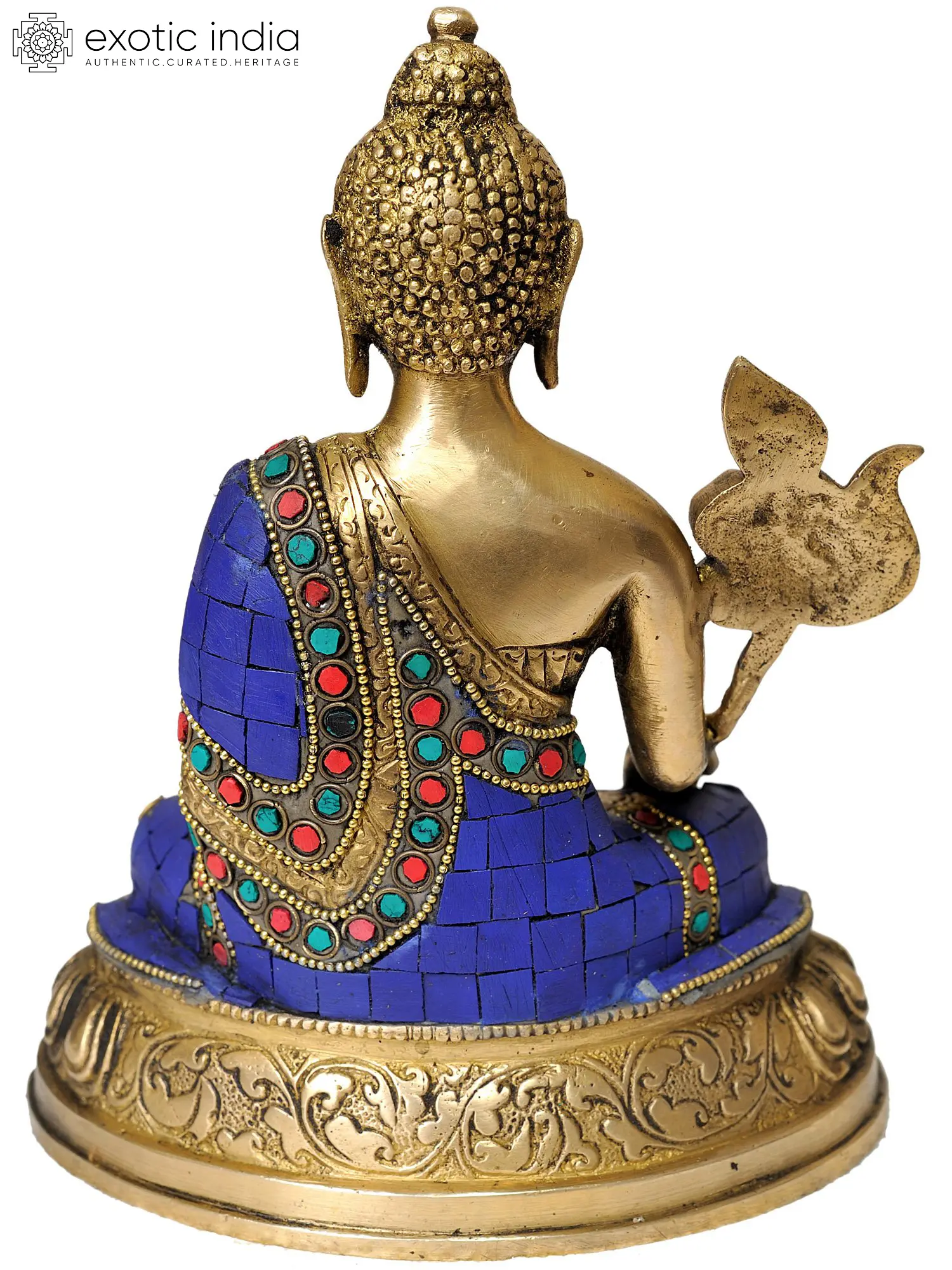 This exquisite brass statue depicts the Buddha of Healing, a revered figure in Tibetan Buddhism known for his profound compassion and ability to alleviate suffering. In this intricately crafted piece, the Buddha is shown seated in a meditative posture, radiating an aura of peace and serenity. His eyes are gently closed, conveying inner contemplation, while a faint, benevolent smile graces his lips. The statue is adorned with vibrant inlays of lapis lazuli, interspersed with red and green stones, symbolizing the precious jewels of enlightenment and the multifaceted nature of healing.