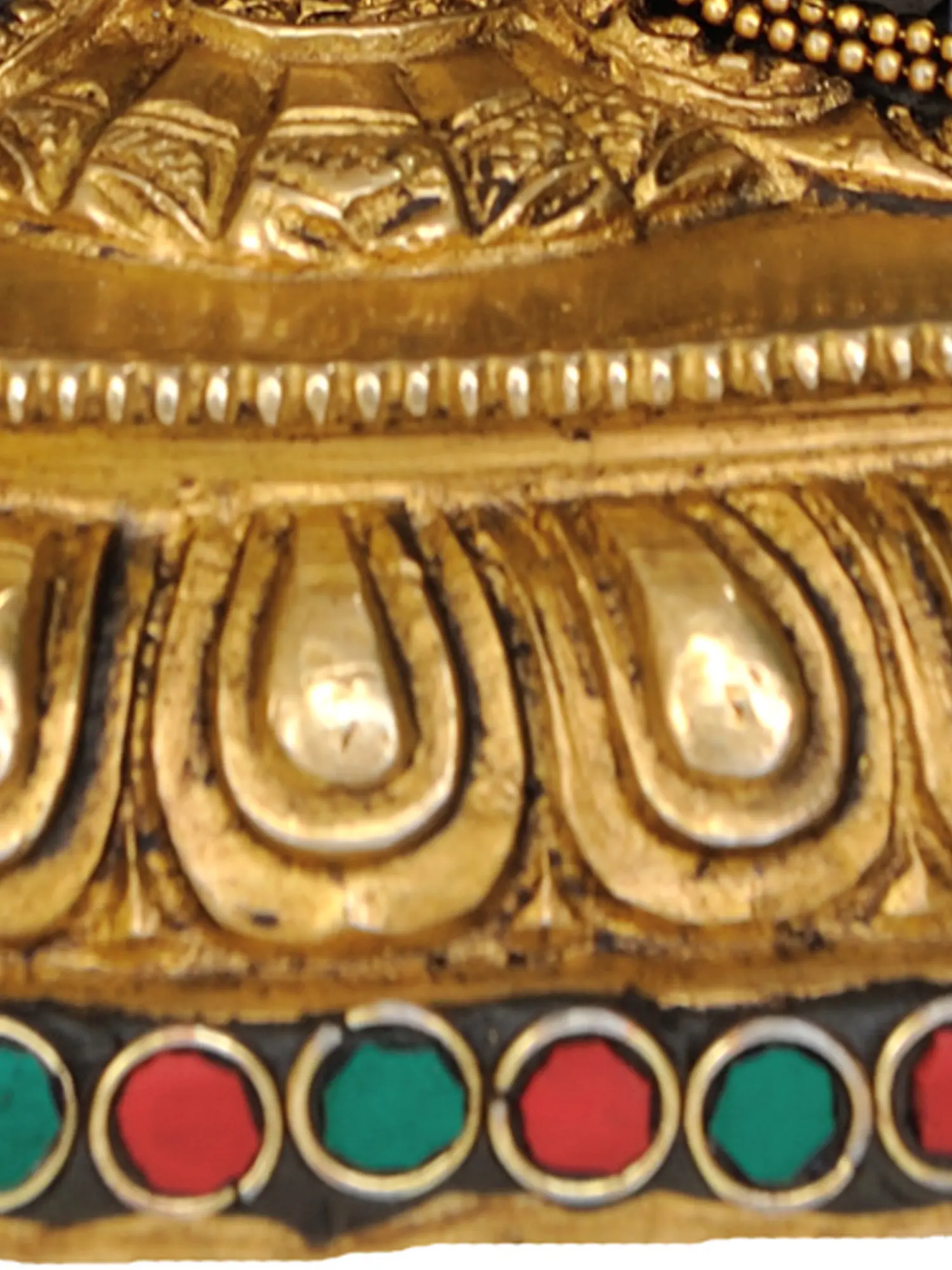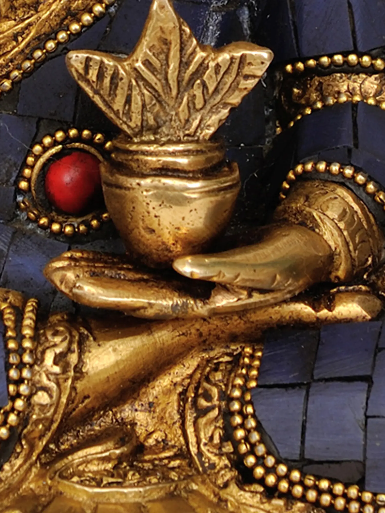 In his left hand, resting in his lap, Medicine Buddha holds a begging bowl overflowing with medicinal herbs. This symbolizes his boundless ability to provide healing remedies for all afflictions. His right hand is extended, palm upwards, in the gesture of *Varada Mudra*, the gesture of bestowing boons and blessings, or alternatively, in the *Abhaya Mudra*, signifying protection and fearlessness. In this representation, he also holds aloft a branch of the *Udumbara* flower, another potent symbol in Buddhism often associated with auspiciousness and the eventual enlightenment of beings. The intricate inlay work extends to the base of the statue, adorned with vibrant red and green stones, further enhancing its visual appeal and symbolic richness. Each element, from the posture to the attributes, is carefully rendered to convey the sacred power and benevolent energy of Medicine Buddha. ––––––––––––––––––