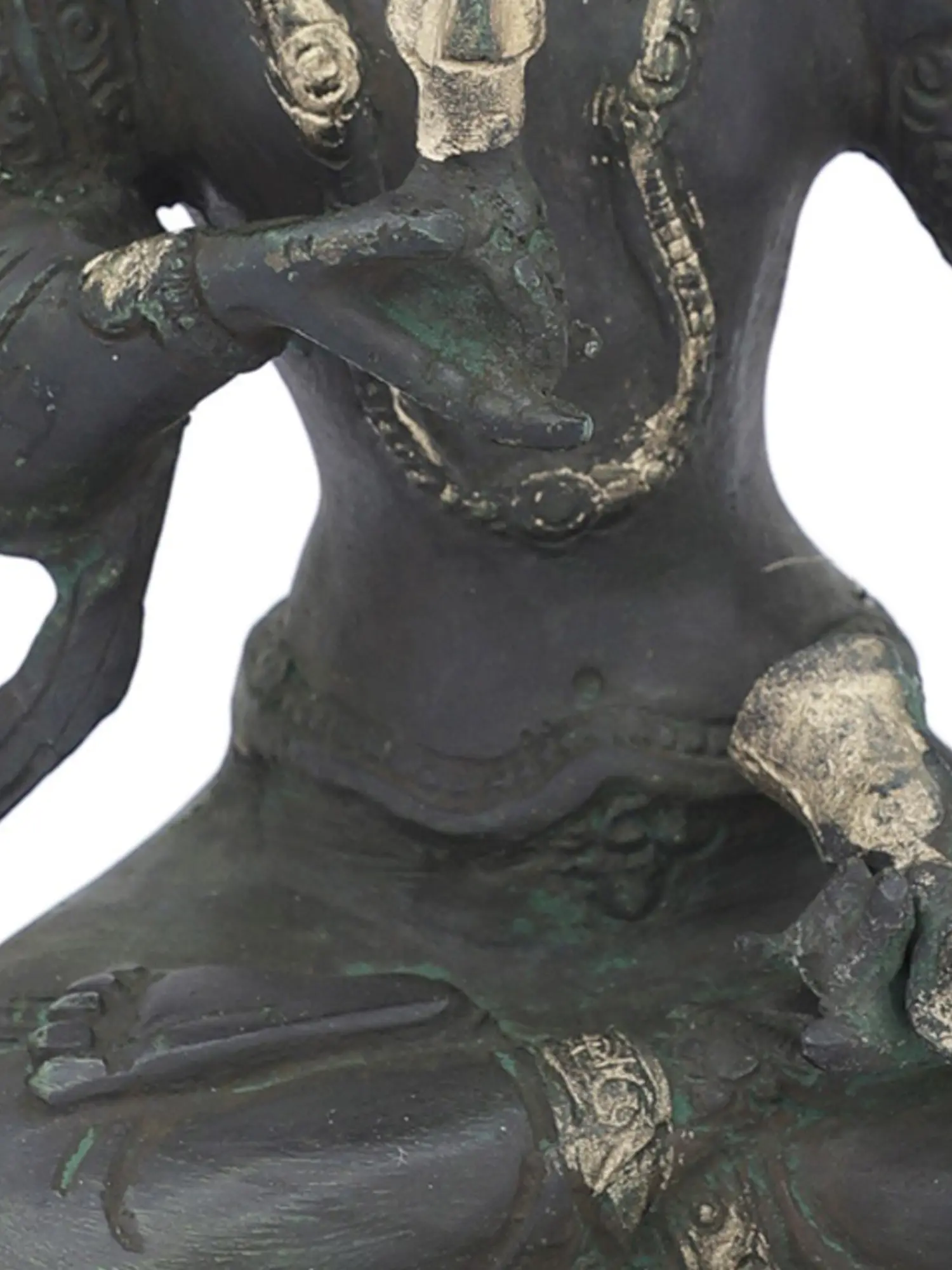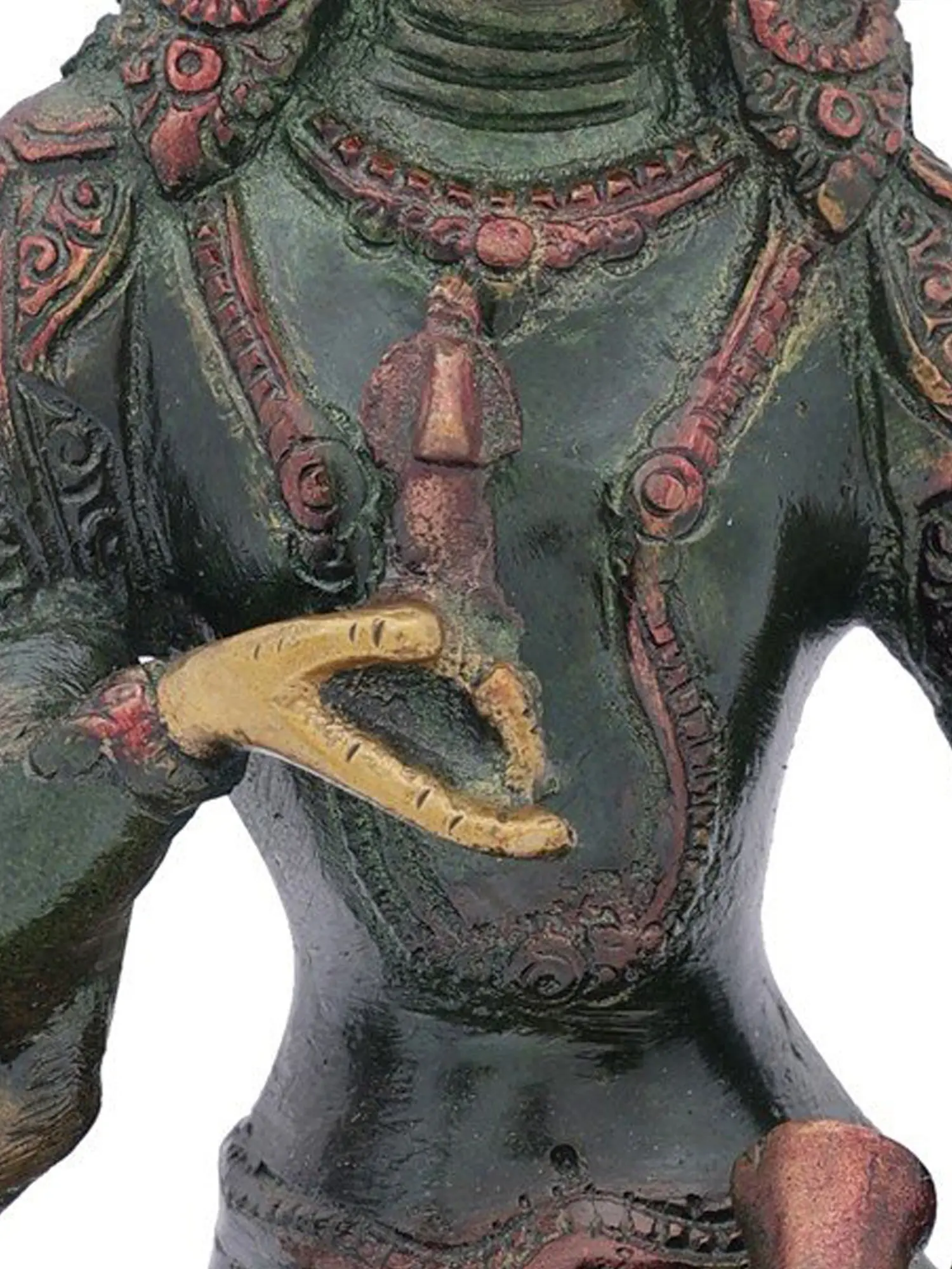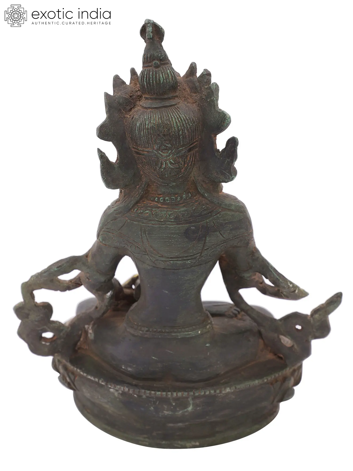 This Brass statue of Tibetan Buddhist Deity Vajrasattva radiates a divine aura with its gold and brown lacquer finish. Vajrasattva, a symbol of purity and spiritual transformation, stands majestically, holding a Vajra (thunderbolt) and a Bell, representing wisdom and compassion in perfect harmony. The Vajra and Bell in his hands signify the union of method and wisdom in the path to enlightenment. His serene countenance and resplendent presence inspire devotees on their journey towards spiritual cleansing and realization. This exquisite brass sculpture encapsulates the profound teachings of Vajrasattva, reminding us of the transformative power of inner purity and the fusion of wisdom and compassion.