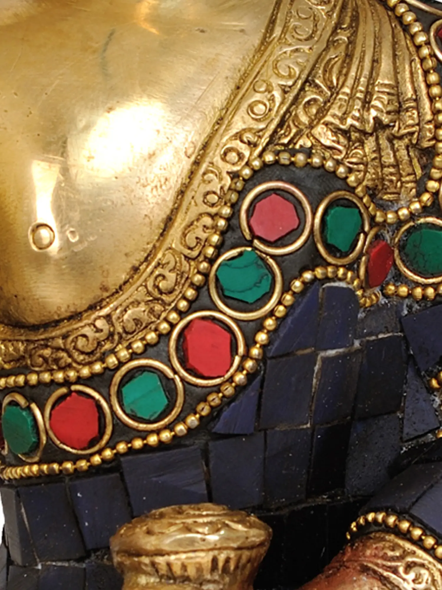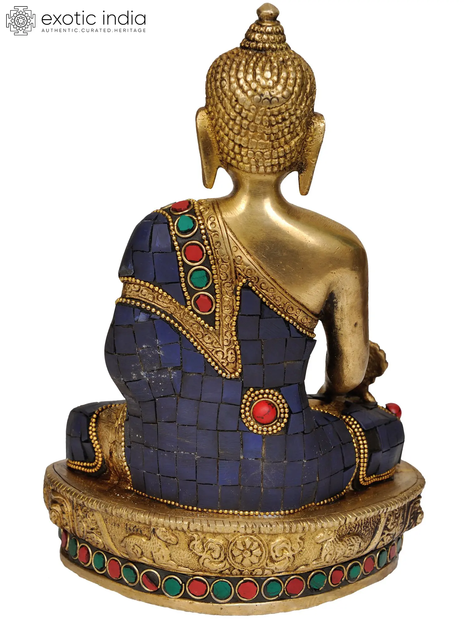 Crafted with meticulous detail in India, this handmade statue showcases the rich artistic traditions associated with Buddhist iconography. The primary material, brass, lends a warm, enduring glow to the deity, symbolizing purity and longevity. The intricate inlay work, featuring vibrant stones of deep blue, ruby red, and emerald green, adds a striking visual dimension. These colors are not merely decorative; they often hold symbolic meanings in Buddhist art. Blue can represent the vastness of the mind and the healing qualities of the sky, while red and green can symbolize compassion, vitality, and the flourishing of life. The Buddha is depicted in the characteristic lotus position (padmasana), signifying spiritual attainment and perfect balance. ––––––––––