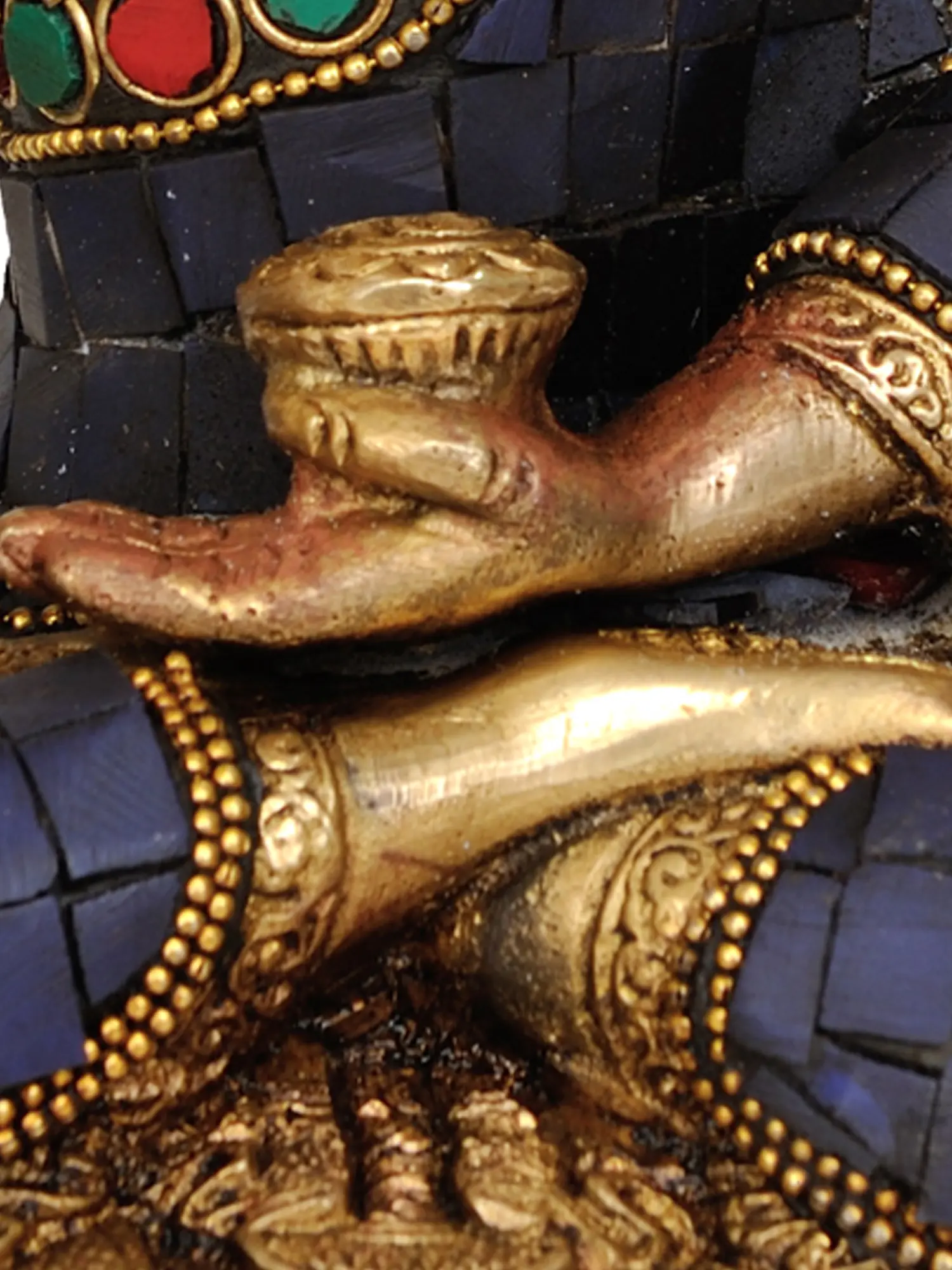 fruit, a potent medicine in Ayurvedic and Tibetan traditions, representing the cure for all ailments. His right hand is extended downwards, palm outward, in the gesture of