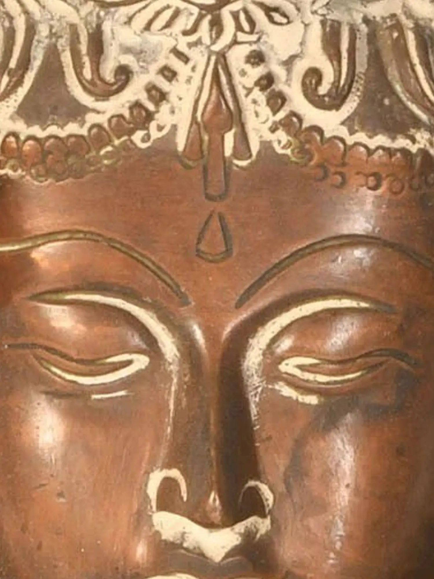 Tara is a prominent figure in Tibetan Buddhism, celebrated as a Bodhisattva of compassion and action. Legends tell of her arising from a tear shed by Avalokiteshvara, the Bodhisattva of Compassion, as he wept for the suffering of the world. Her form is often depicted as youthful and radiant, embodying active compassion and the power to overcome obstacles. She is known by many names and forms, each representing different aspects of her protective and liberating power, such as Green Tara, White Tara, Red Tara, and Yellow Tara. This mask, with its serene countenance, is a visual representation of her benevolent gaze, offering protection and guidance to all who seek her aid. The presence of the Dharma Chakra (Wheel of Law) on either side of her head further signifies her role in turning the wheel of the Dharma and leading beings towards enlightenment.