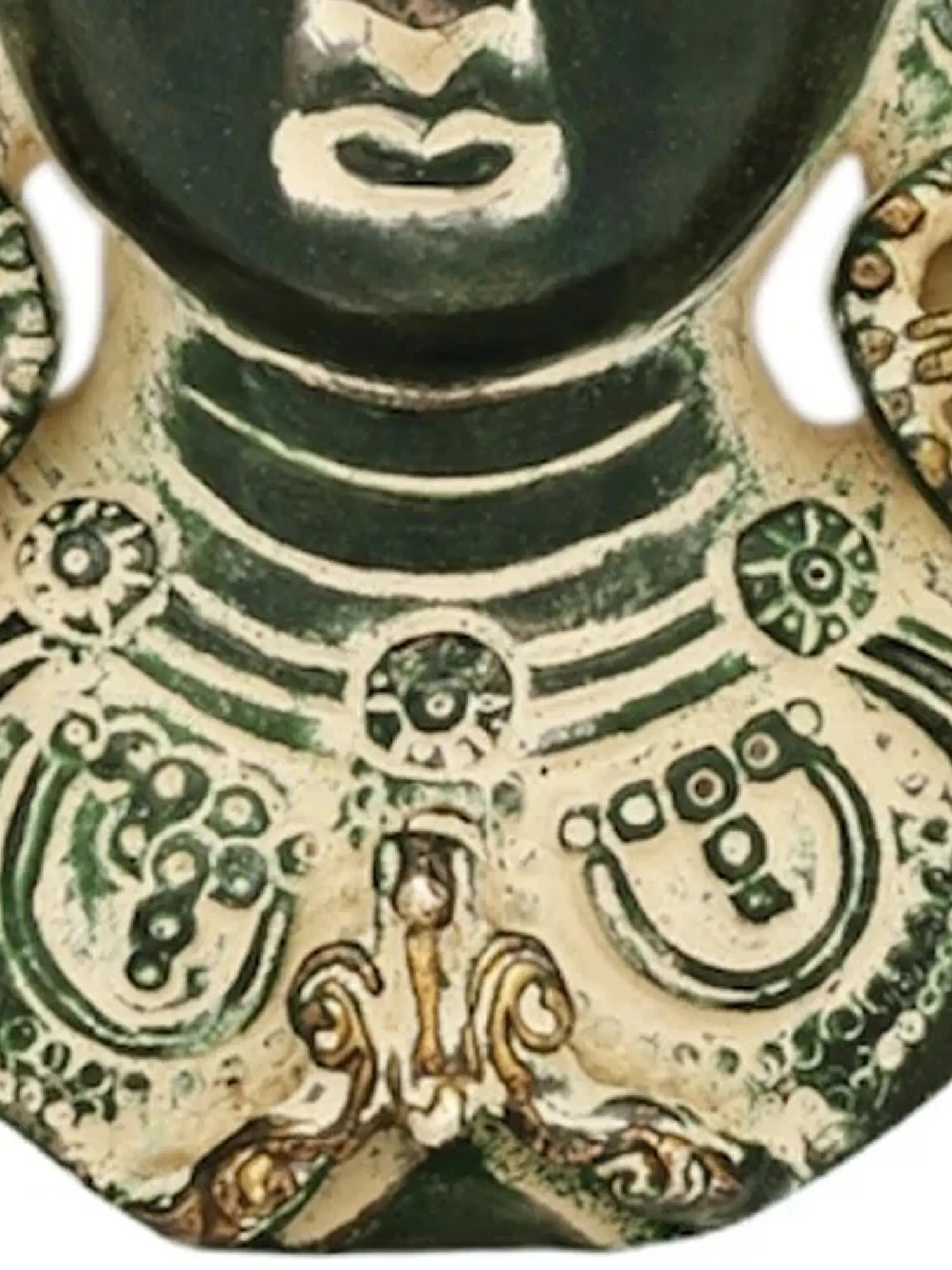 This captivating mask is meticulously handcrafted from brass, a material revered for its durability and ability to capture fine details. The artisan's skilled hands have brought forth a piece that is both robust and delicate, with each curve and contour expertly shaped. The rich patina achieved through the finishing process adds depth and character, highlighting the intricate carvings of her headdress and ornamentation. This mask is not merely a representation but a piece of art that carries the spirit of India within its metallic form. Its dimensions are thoughtfully sized to serve as a striking focal point on any wall, whether in a dedicated meditation room, a living space, or a study. The artistry ensures that each mask possesses a unique quality, making it a truly special piece for your collection.