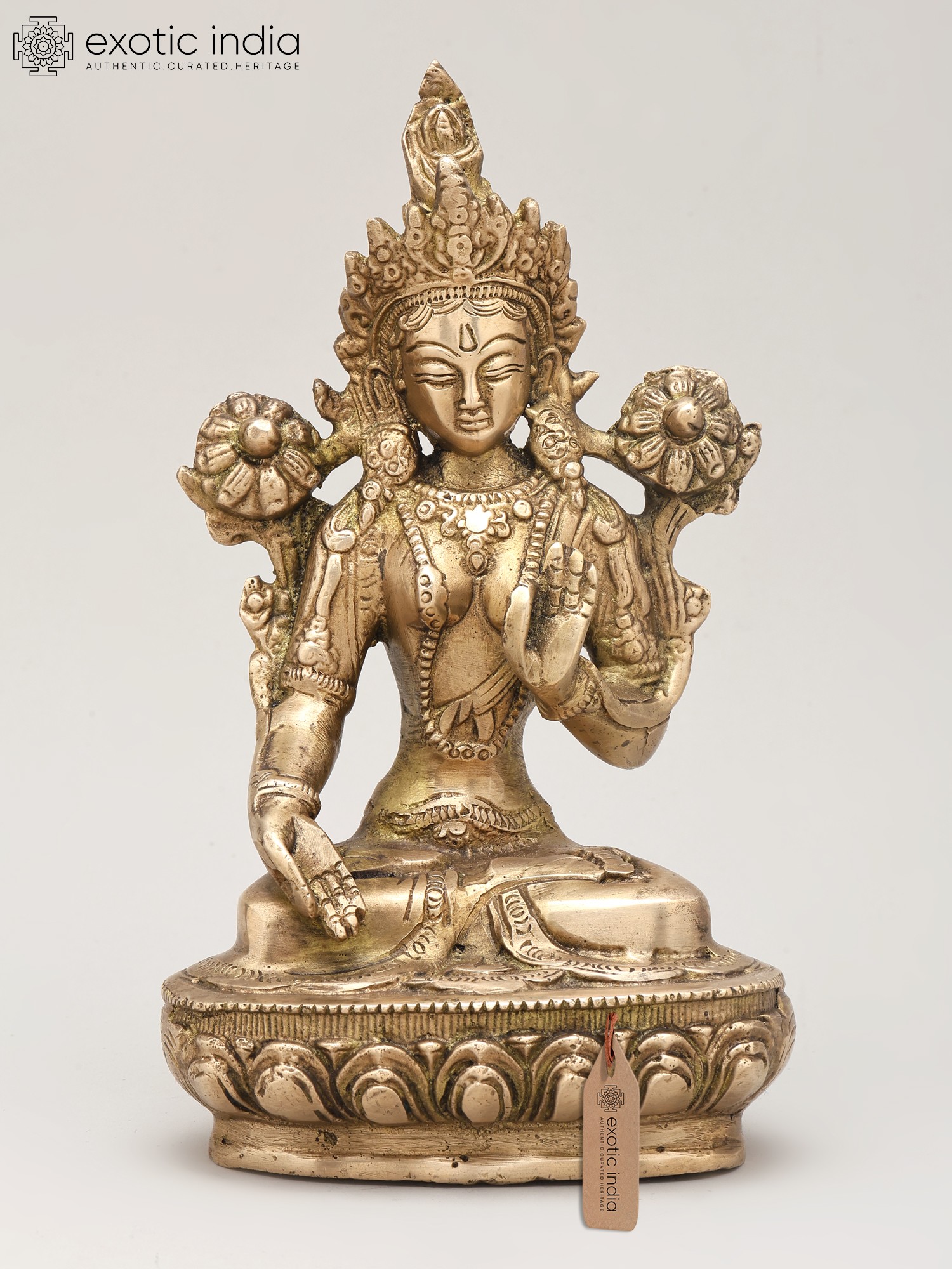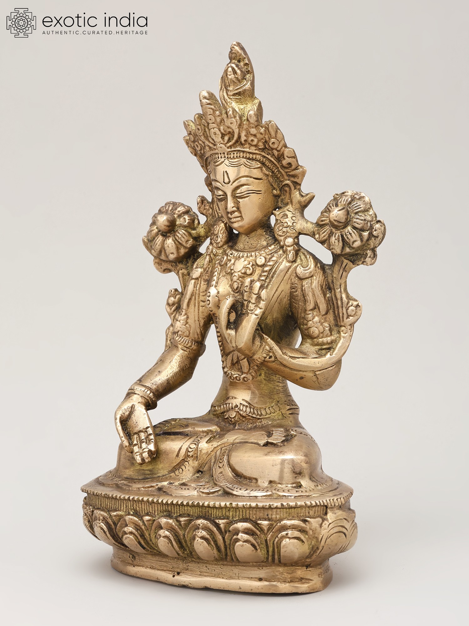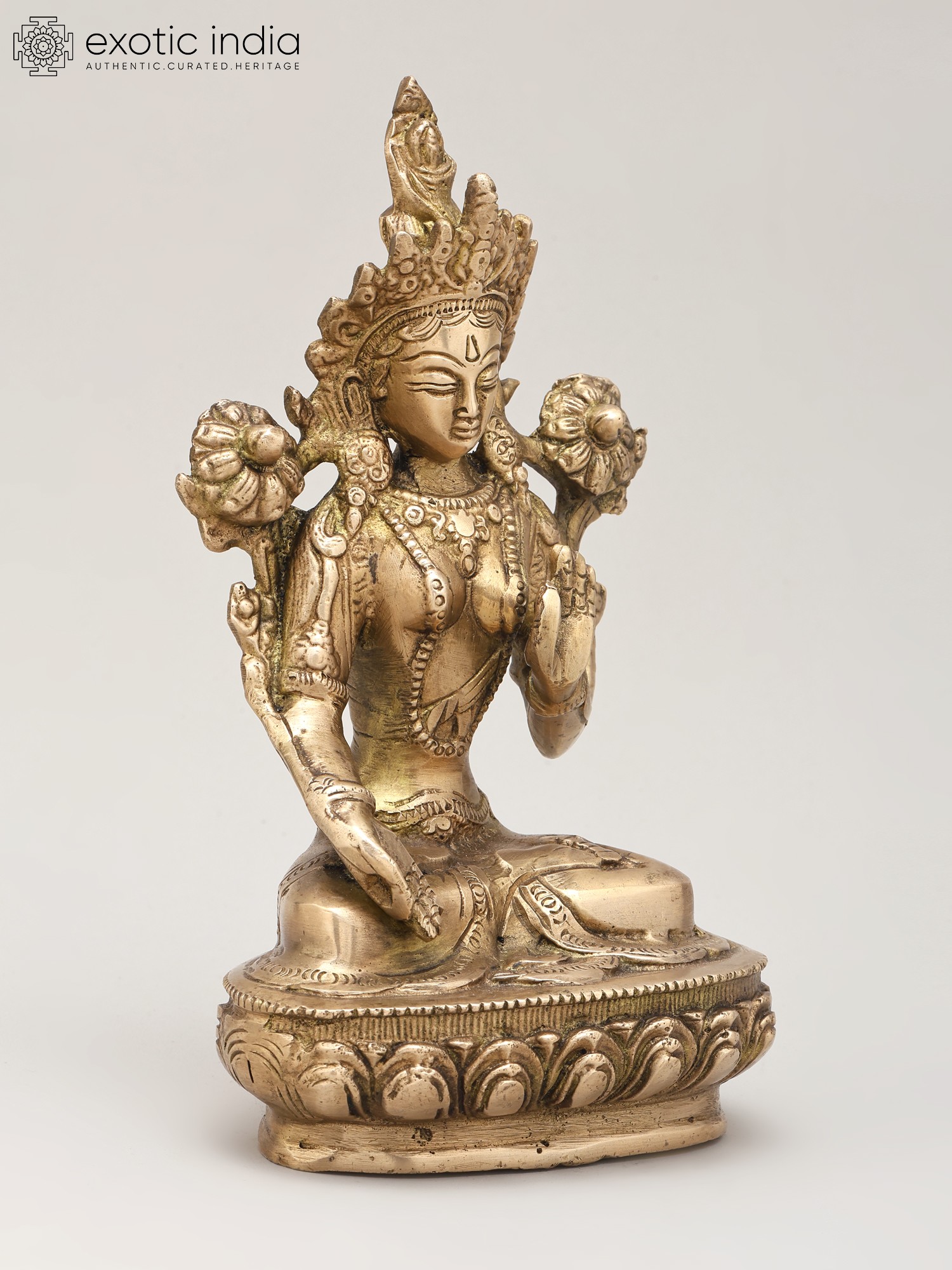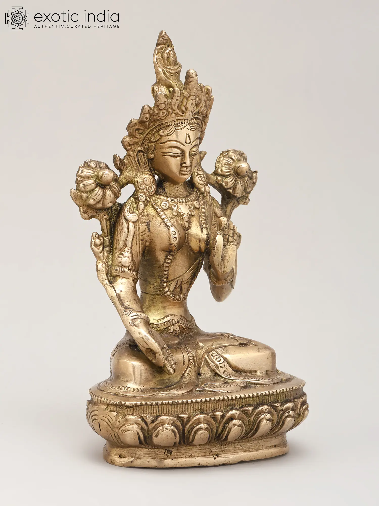 Standing at a commanding eight inches, this piece captivates with its elegant posture and symbolic accoutrements. Observe the gentle hand gestures, the benevolent gaze, and the blossoming lotus flowers held in the upper hands, representing purity and spiritual awakening. The intricate ornamentation, including the ornate crown and jewelry, showcases the masterful craftsmanship that elevates this from mere decor to a sacred object. Its balanced proportions and pleasing aesthetic, approximately five inches in width and three inches in depth, make it a statement of refined taste.