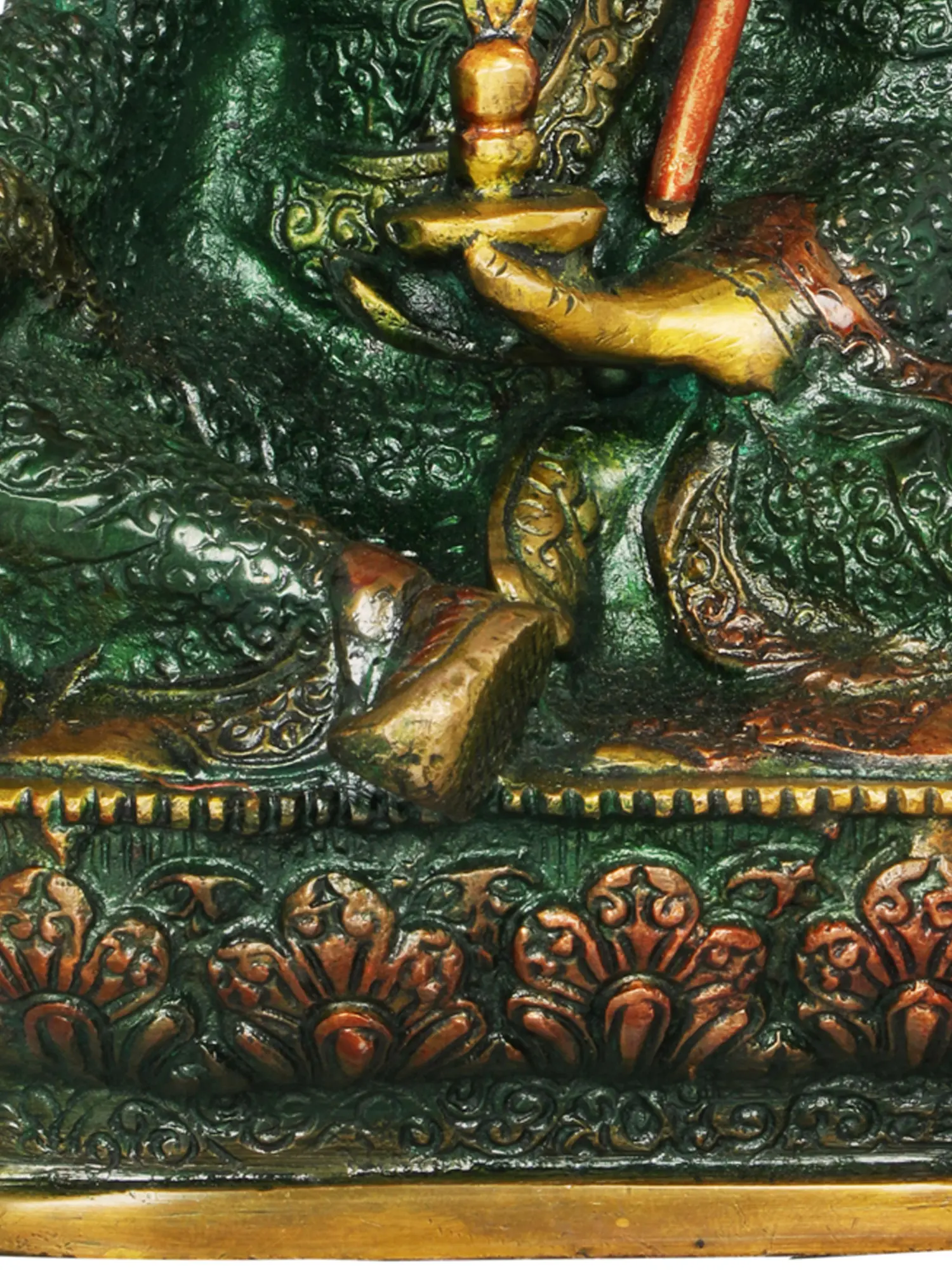 This statue is not merely an object of devotion but also a testament to the enduring legacy of Indian craftsmanship. Made from high-quality brass, the material itself holds significance, being associated with auspiciousness and longevity. The green and subtle copper patination applied to the brass enhances the visual depth and texture, bringing the deity to life. Each statue is handmade, ensuring that it possesses a unique character and spiritual vibration, a quality highly prized in devotional art. The tradition of creating such sacred objects in India has been passed down through generations, blending ancient techniques with artistic sensibility to produce pieces that are both aesthetically captivating and spiritually potent. Displaying this statue in your home or meditation space can serve as a constant reminder of the profound teachings of Padmasambhava and invoke his blessings for wisdom, protection, and spiritual progress.