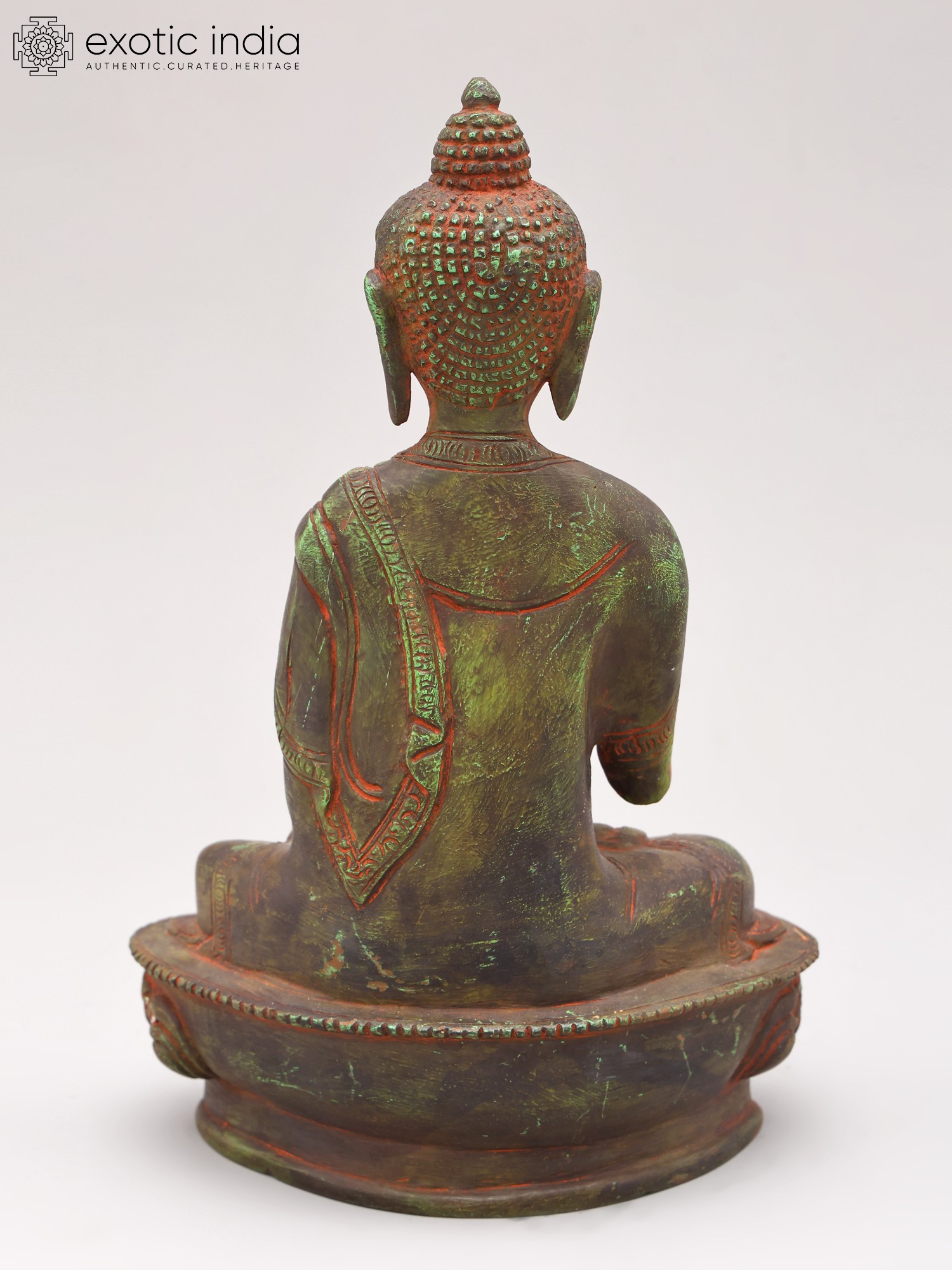 Each aspect of this sculpture speaks to the skilled hands and dedicated spirit of its makers. The flowing robes are rendered with delicate folds, suggesting movement and grace. The intricate patterns adorning the sanghati (robe) and the base are reminiscent of traditional motifs found in Himalayan and Tibetan Buddhist art, adding layers of symbolic meaning. The urna, the tuft of hair between the eyebrows, is a symbol of Buddha's spiritual insight. The ushnisha, the cranial protuberance, signifies his elevated wisdom and understanding. This statue is not merely an object of beauty but a testament to a rich heritage of craftsmanship passed down through generations. ––––––––––––––––––