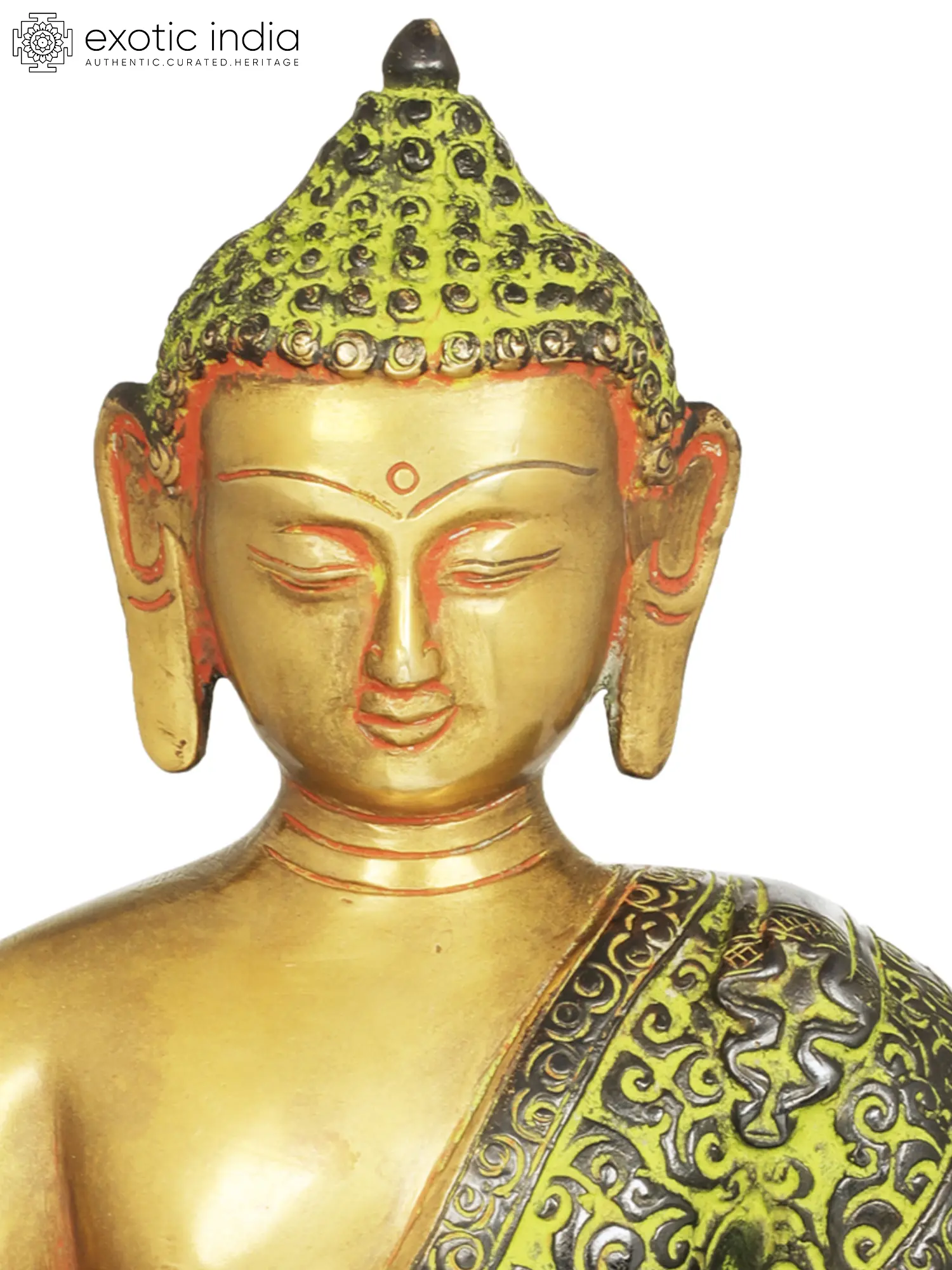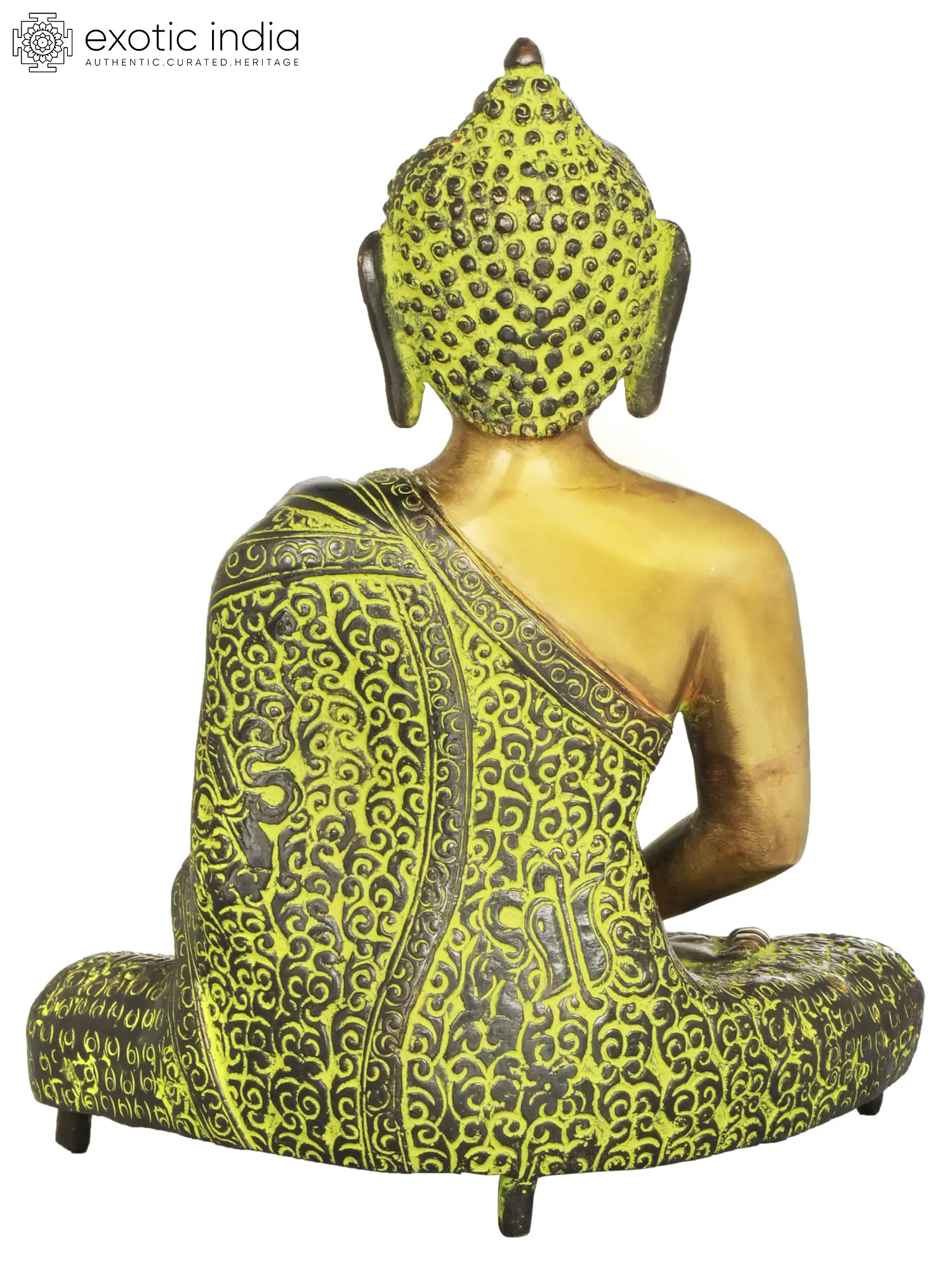 Handcrafted in India, this sculpture is a testament to the enduring legacy of traditional Indian craftsmanship. The lustrous brass, meticulously cast and finished, lends a timeless quality to the representation. The serene expression on the Buddha's face, with eyes gently closed and a subtle smile, radiates tranquility and compassion. The intricate detailing of his monastic robe, adorned with a striking green and black pattern of swirling motifs, adds a layer of visual richness and artistic sophistication. This decorative scheme is reminiscent of the vibrant textiles and artistic expressions found in Tibetan Buddhist art, reflecting the cultural diffusion and artistic exchange that has shaped Buddhist iconography across Asia.