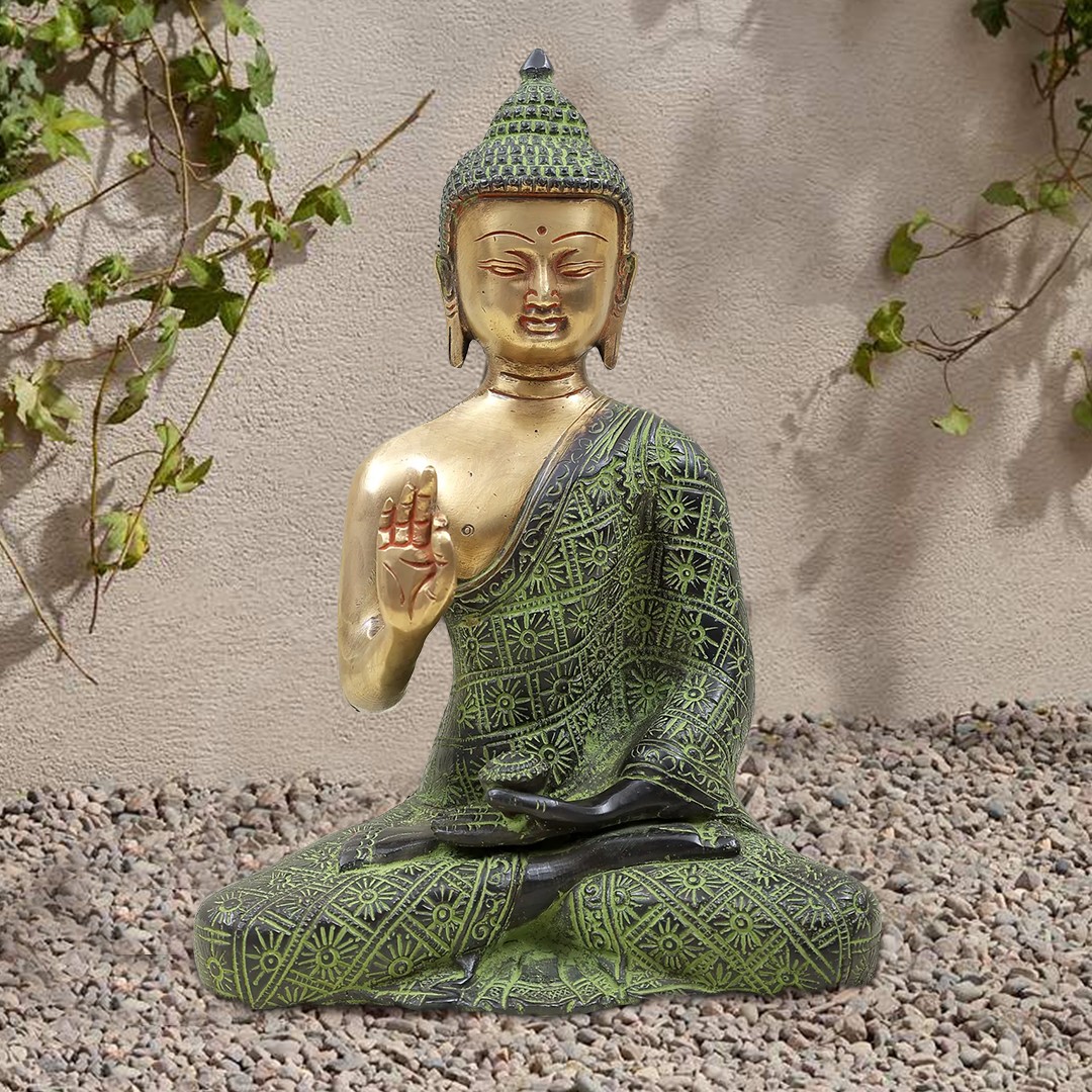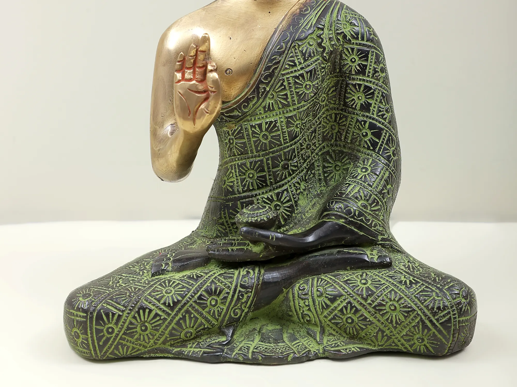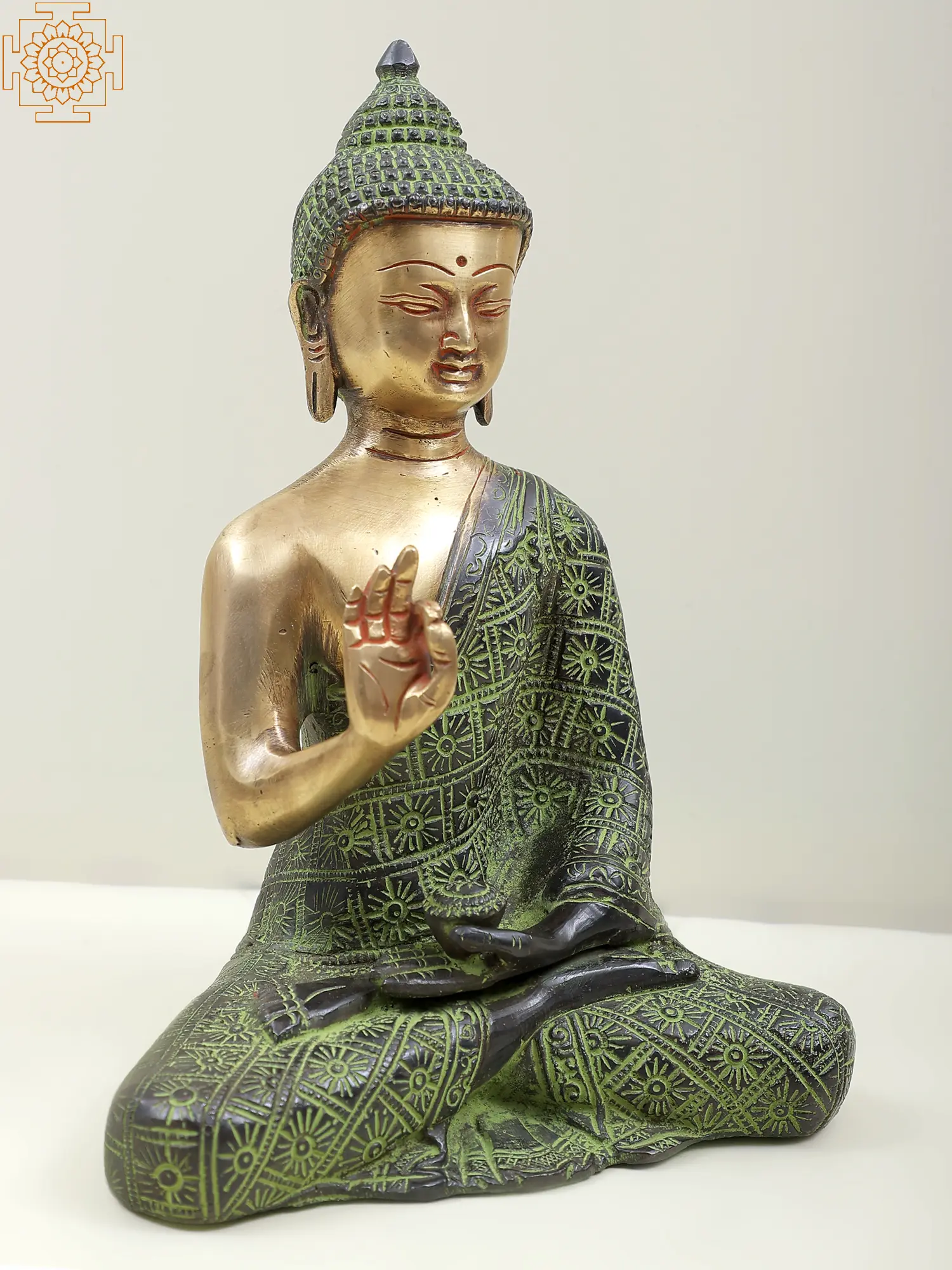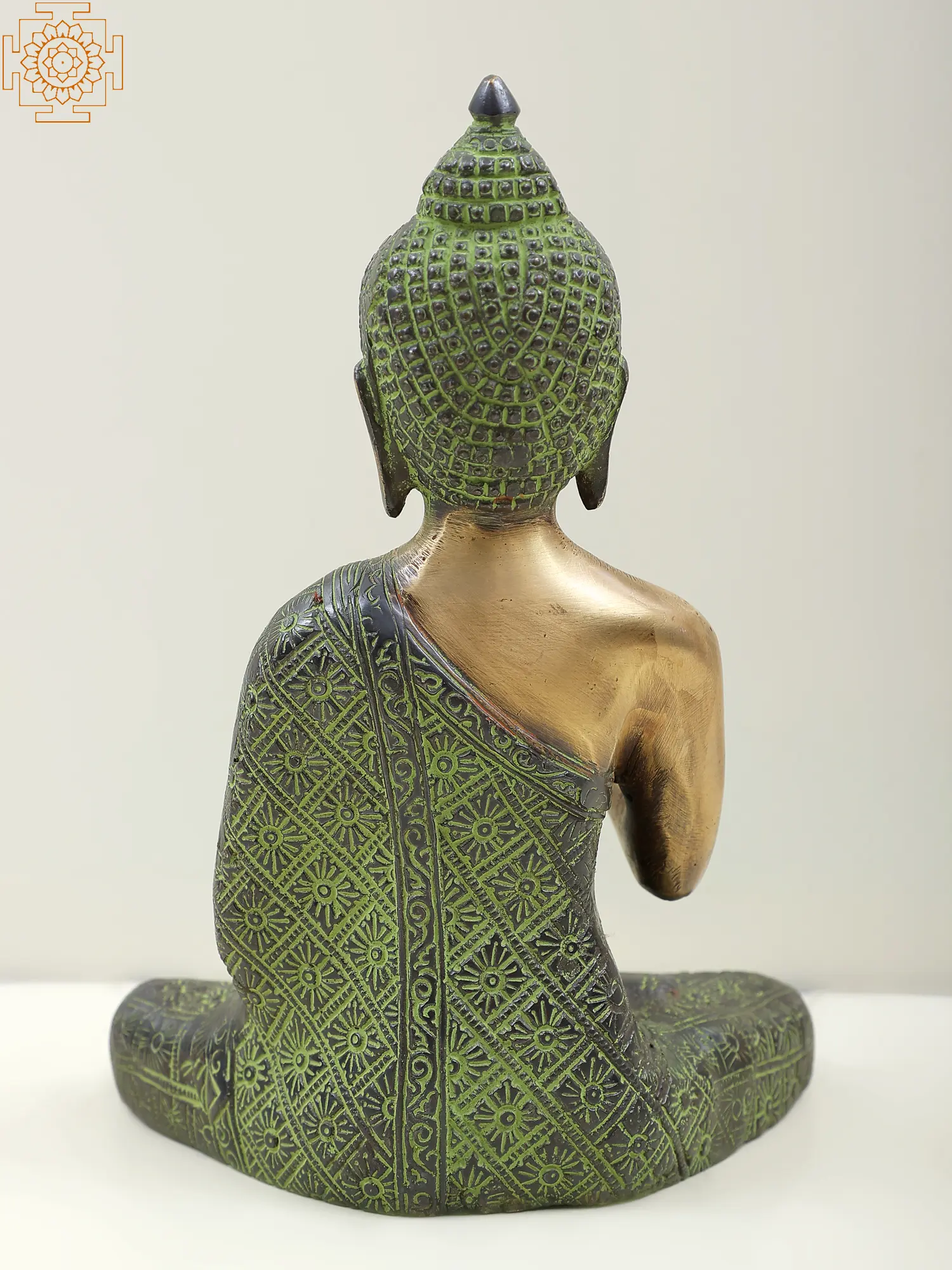 This brass creation of Lord Buddha in a brass sculpture, assuming the Vitarka Mudra or the Preaching Gesture, encapsulates the essence of his profound teachings, wisdom, and spiritual enlightenment. This sculpture invites us to contemplate the path to liberation and enlightenment through the gesture of intellectual discourse.