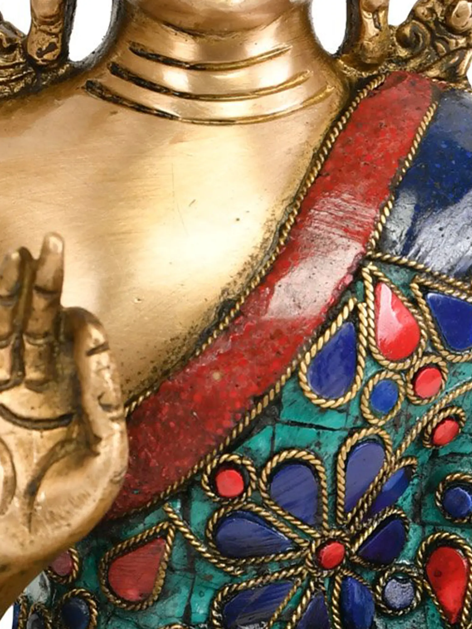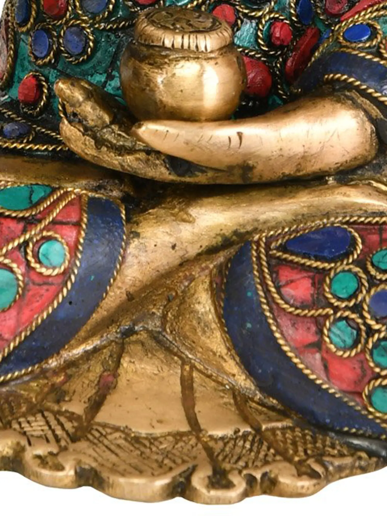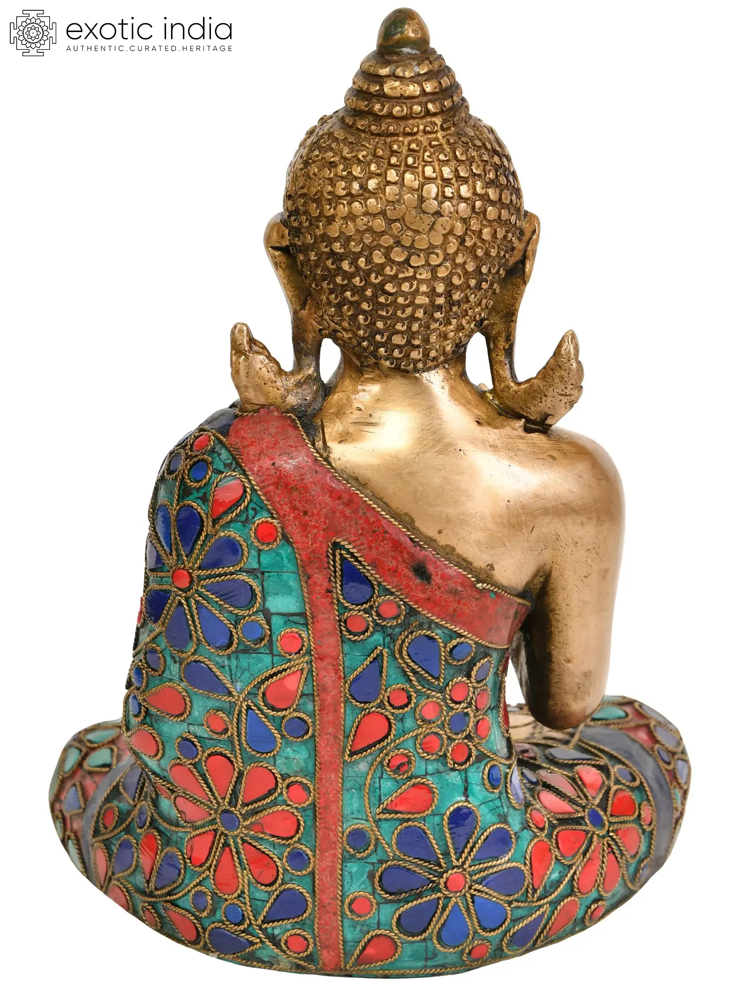 The robe adorning the Buddha is a spectacle of vibrant color and intricate design. Lavishly inlaid with genuine lapis lazuli, turquoise, and coral stones, it evokes the rich symbolism found in Buddhist art. The deep blues of lapis lazuli represent the vastness of the sky and the wisdom of the cosmos, while turquoise signifies healing and spiritual protection. Coral, with its fiery red hue, symbolizes life force and vitality. These precious stones, meticulously set within the brass, form swirling floral patterns and a tapestry of divine teachings, transforming the Buddha's garment into a canvas of spiritual enlightenment. The overall effect is one of opulent yet harmonious beauty, reflecting the multifaceted nature of the Buddha's teachings.