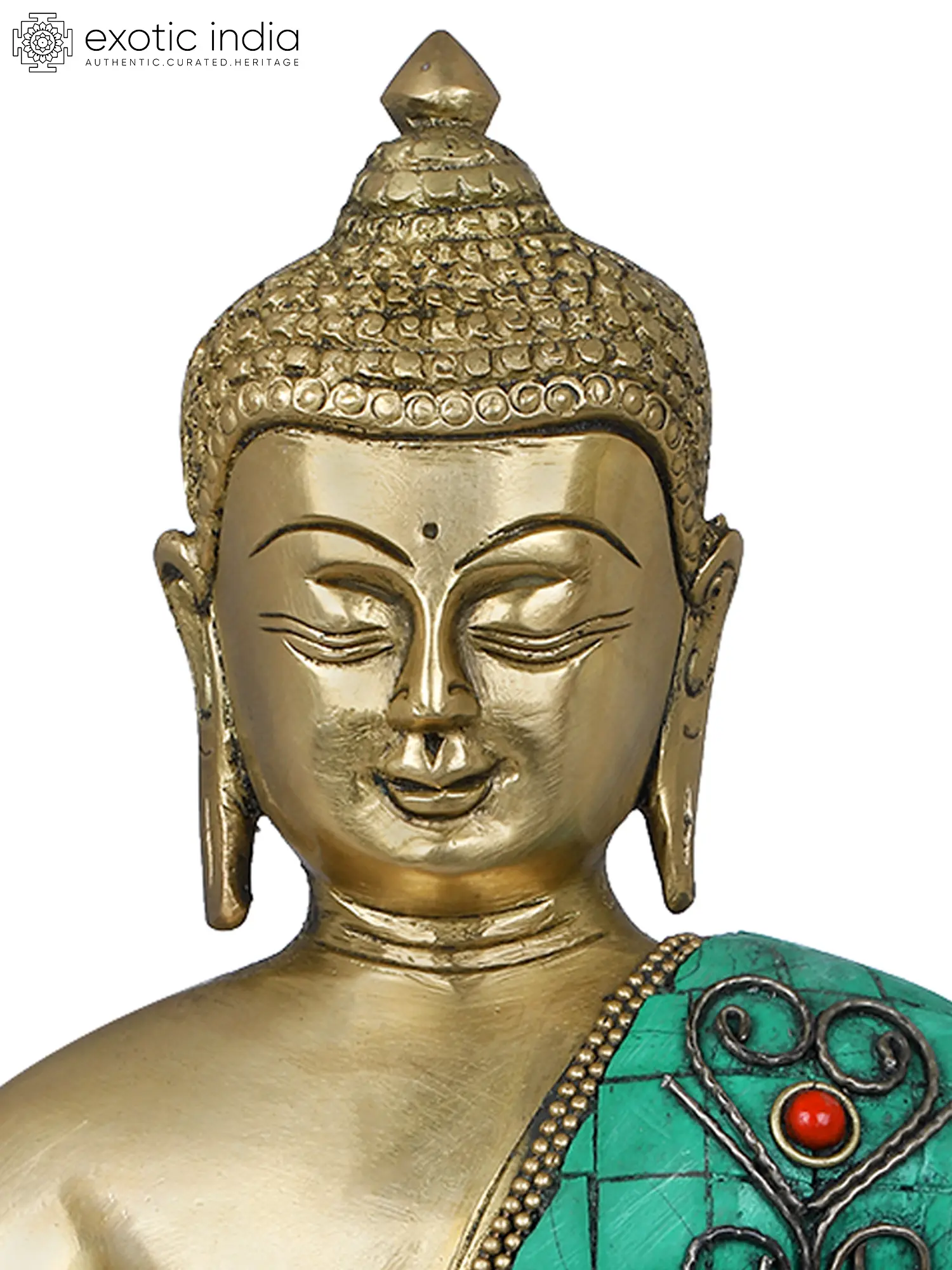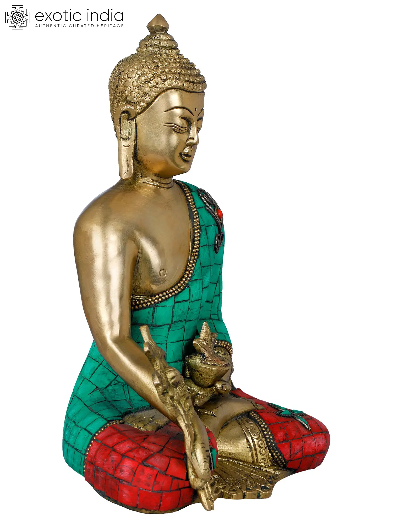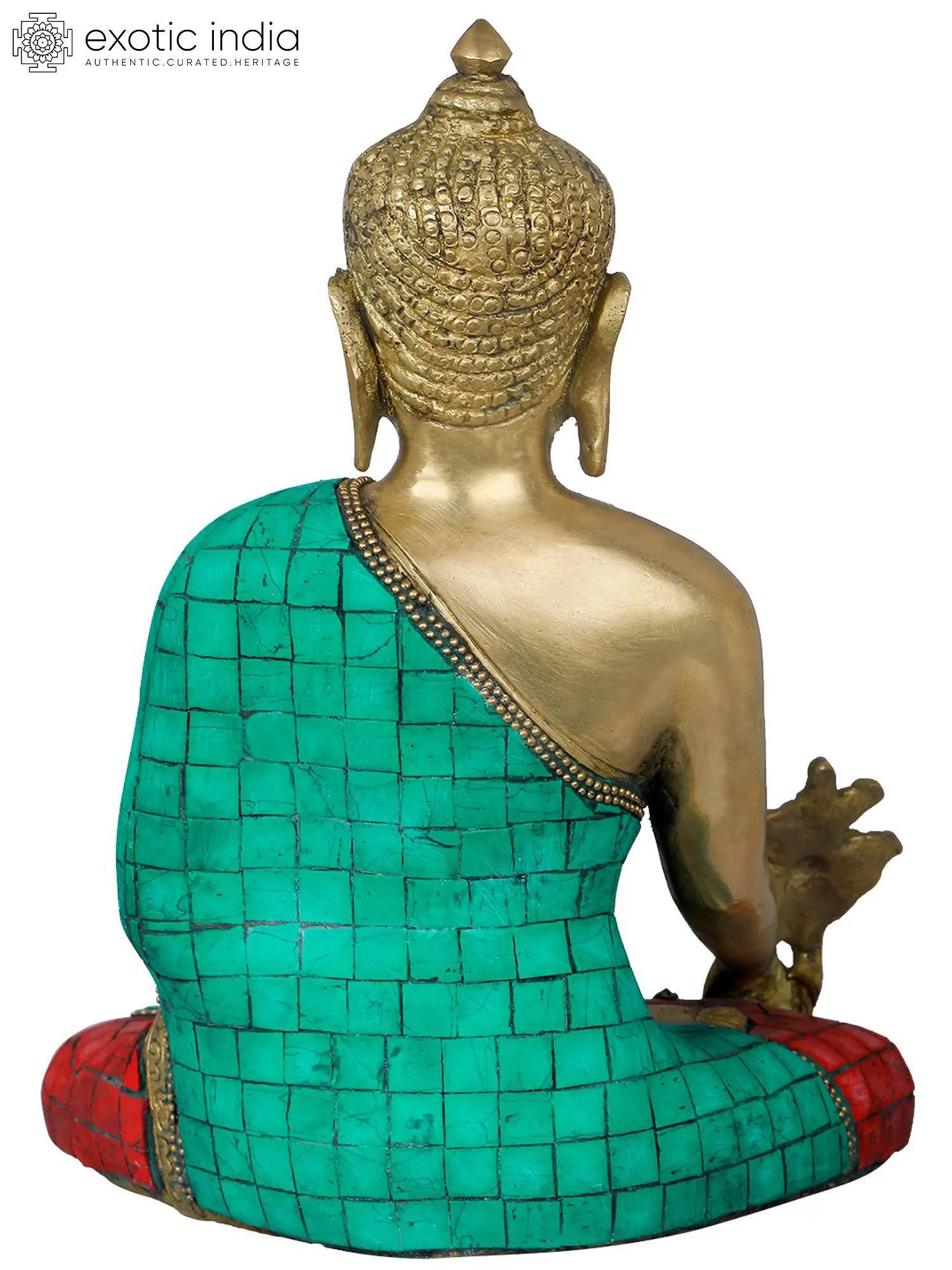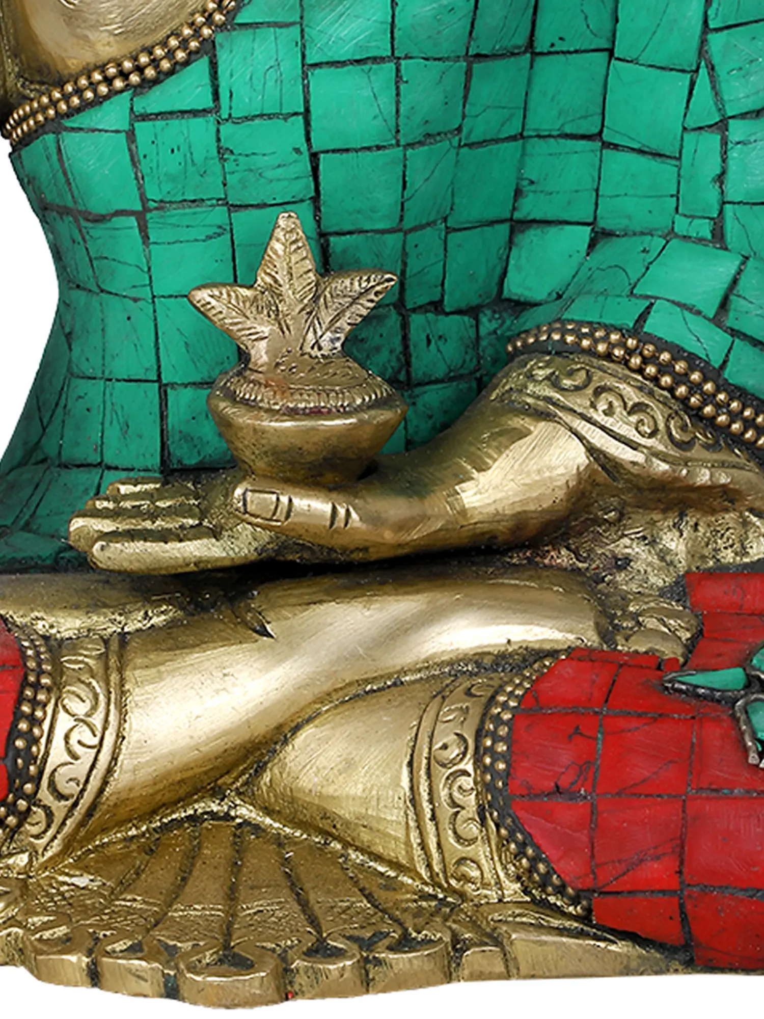 The statue is expertly cast in brass, a material chosen for its durability and its ability to hold intricate details. The robe is adorned with vibrant mosaic work, featuring squares of turquoise and red stones, each meticulously placed to create a striking visual appeal. The turquoise, often associated with the sky and the sea, represents life and healing in many cultures, while the red hues can symbolize vitality and protection. The delicate beaded trim along the robe and the ornate decoration on the lotus seat further enhance the richness and spiritual essence of the sculpture. This piece is a testament to the enduring legacy of Indian craftsmanship, where artistry and spirituality are deeply intertwined.