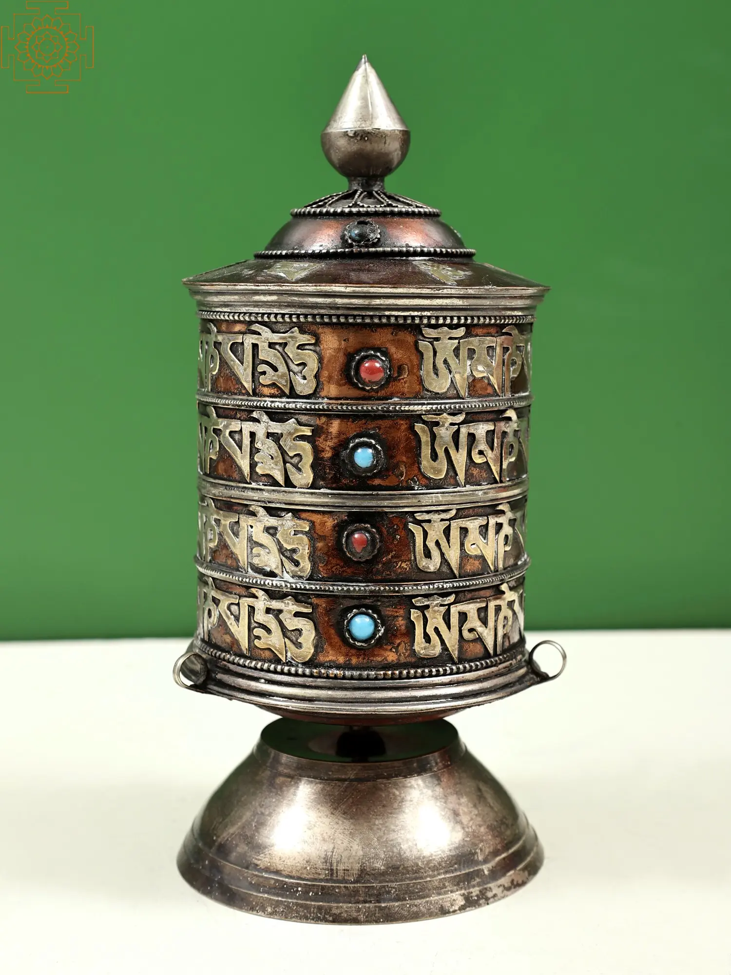 The prayer wheels are ubiquitous in Buddhist culture. The wheeling prayer is enshrined in a mantra roll. It consists of a hollow cylindrical body, with inlay work which is engraved with a mystic emblem.