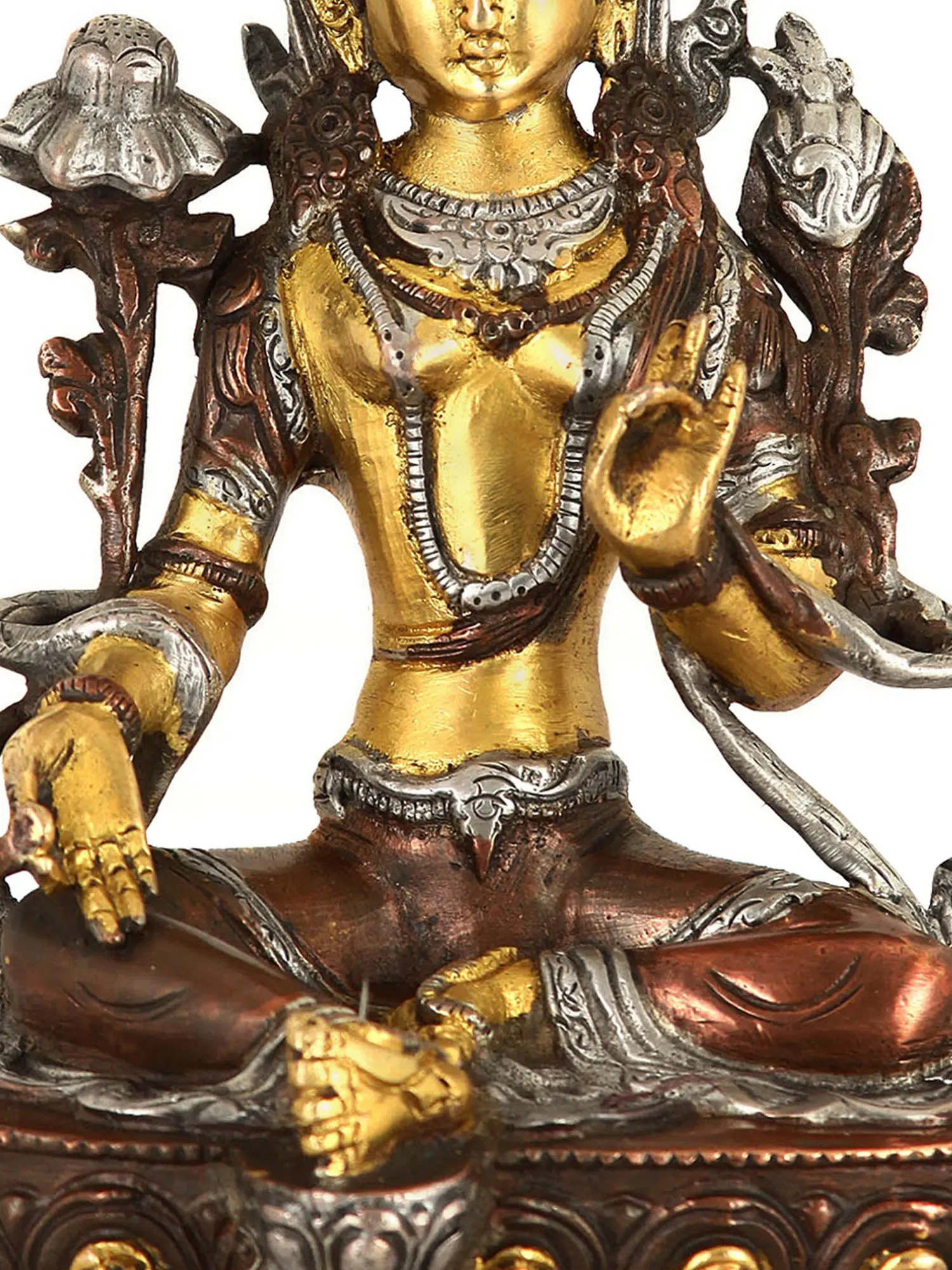 Seated in the posture of ease, one leg extended slightly, shows her readiness to spring into action and aid those in need. Her right hand is displayed in the gesture of giving, or varada mudra, symbolizing generosity and offering blessings to all who seek her help. Her left hand holds the stem of a lotus flower, a symbol of purity and spiritual awakening, that extends upwards. The brass medium used to create this representation lends a timeless quality. The different color tones of brass throughout the statue create a striking contrast, accentuating the intricate details of her jewelry, the folds of her robe, and the serene expression on her face. The elaborate crown she wears is emblematic of her enlightened status and regal spirit. The lotus upon which she sits signifies her transcendence of the mundane world and her unshakeable commitment to compassion. This sculpture is not merely a decorative object; it is a powerful symbol of hope, compassion, and the potential for enlightenment that resides within us all. It can serve as a reminder to cultivate kindness, empathy, and the courage to overcome obstacles on our own spiritual paths. This beautiful representation of this enlightened figure will make a stunning addition to your altar, meditation space, or home.