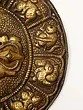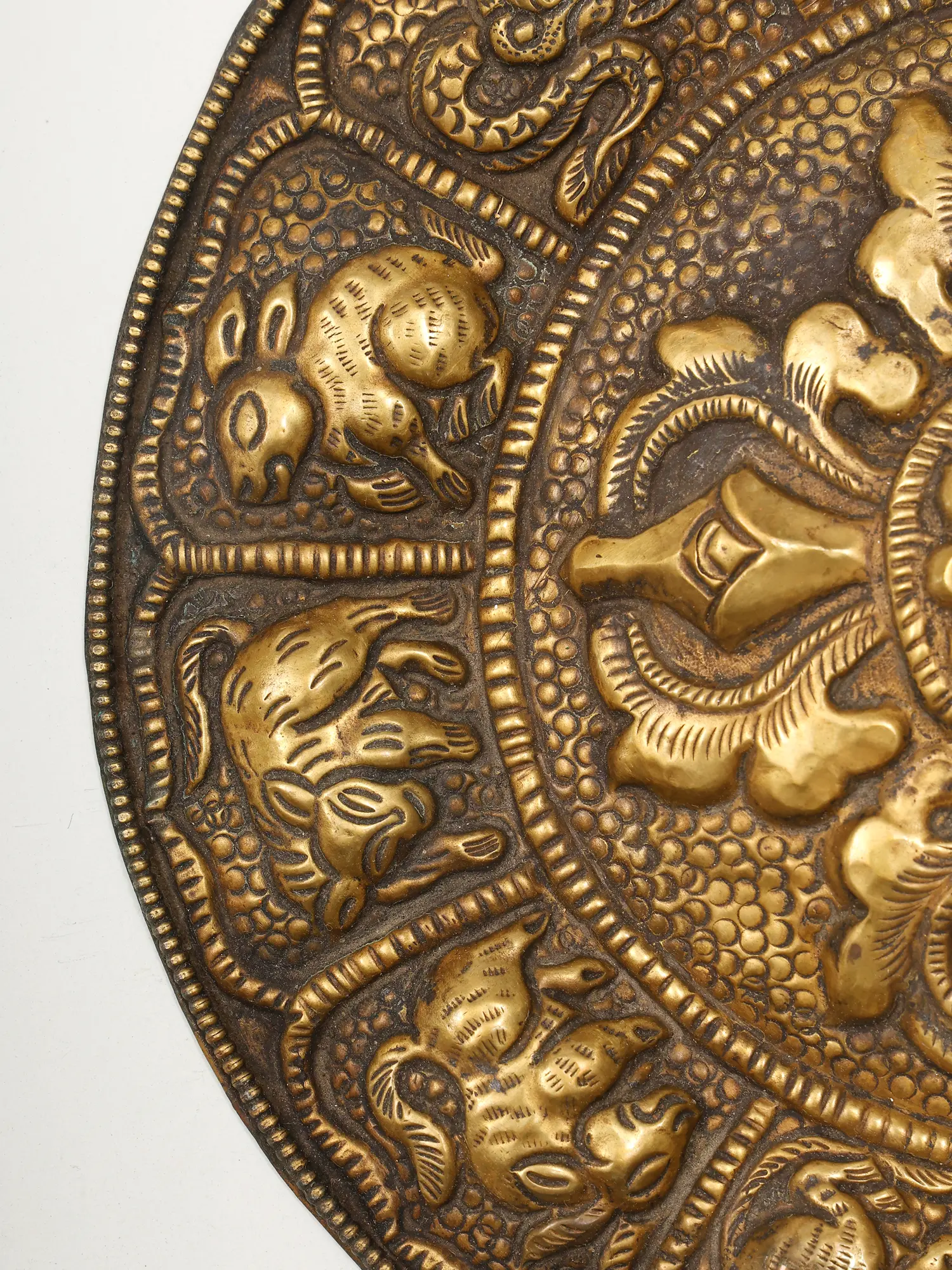This exquisite 8-inch Vishva-Vajra wall hanging, meticulously handcrafted in Nepal, is more than just a decorative piece; it’s a portal to the rich tapestry of Tibetan Buddhist symbolism and mythology. The Vishva-Vajra, often depicted as a ritual implement or a symbolic representation, embodies the indestructible nature of truth and the power to overcome obstacles. In Tibetan Buddhism, it represents the union of wisdom and compassion, method and emptiness—two fundamental aspects of the path to enlightenment. This particular design showcases the twelve animals of the Tibetan zodiac, each intricately carved in brass, surrounding a central mandala-like floral design. The craftsmanship is evident in every detail, from the fine etching of each animal to the smooth, rich patina of the brass. This piece is not merely an ornament; it’s a meditation on the interconnectedness of all things, a reminder of the cosmic forces at play in our lives.