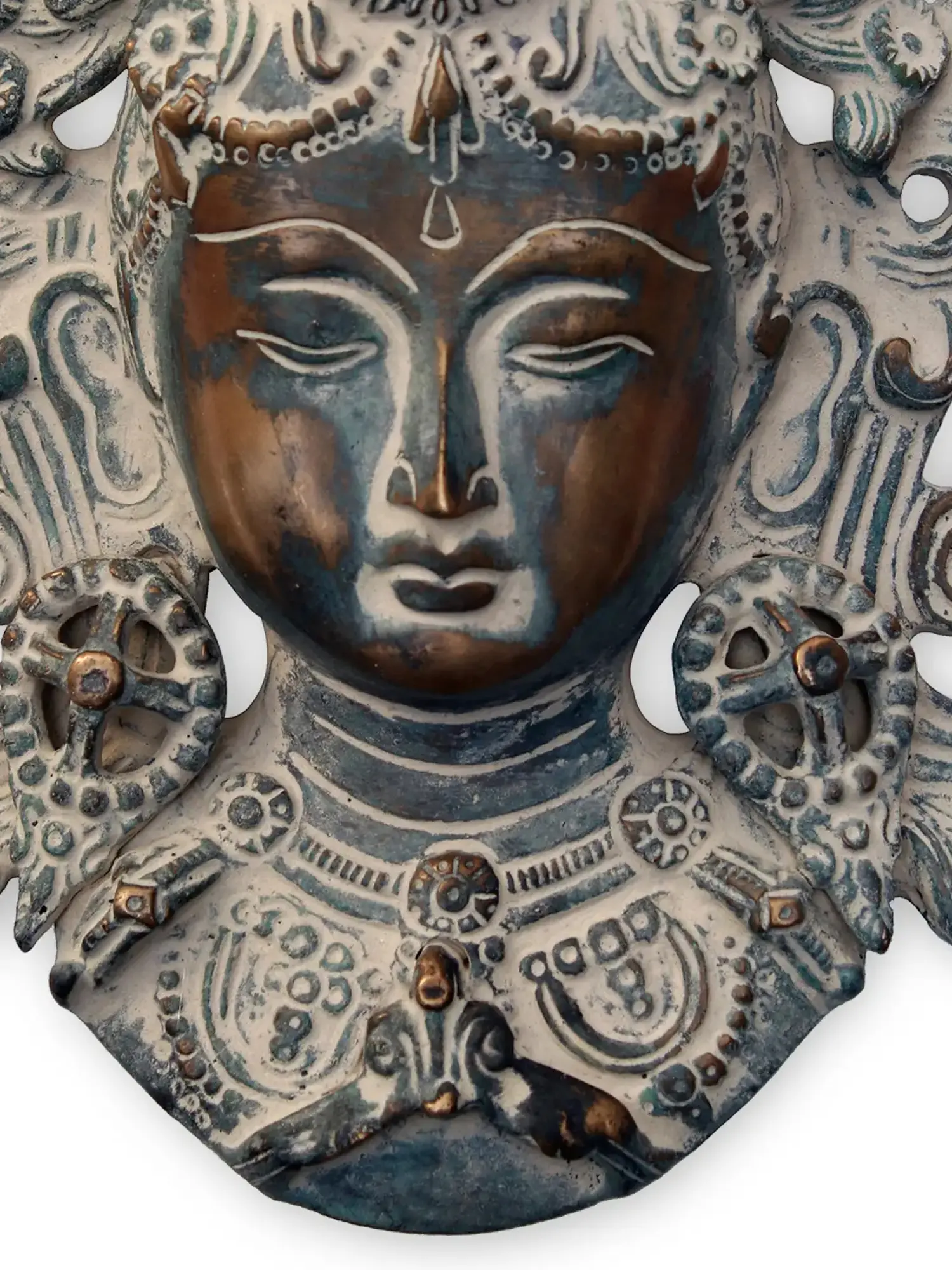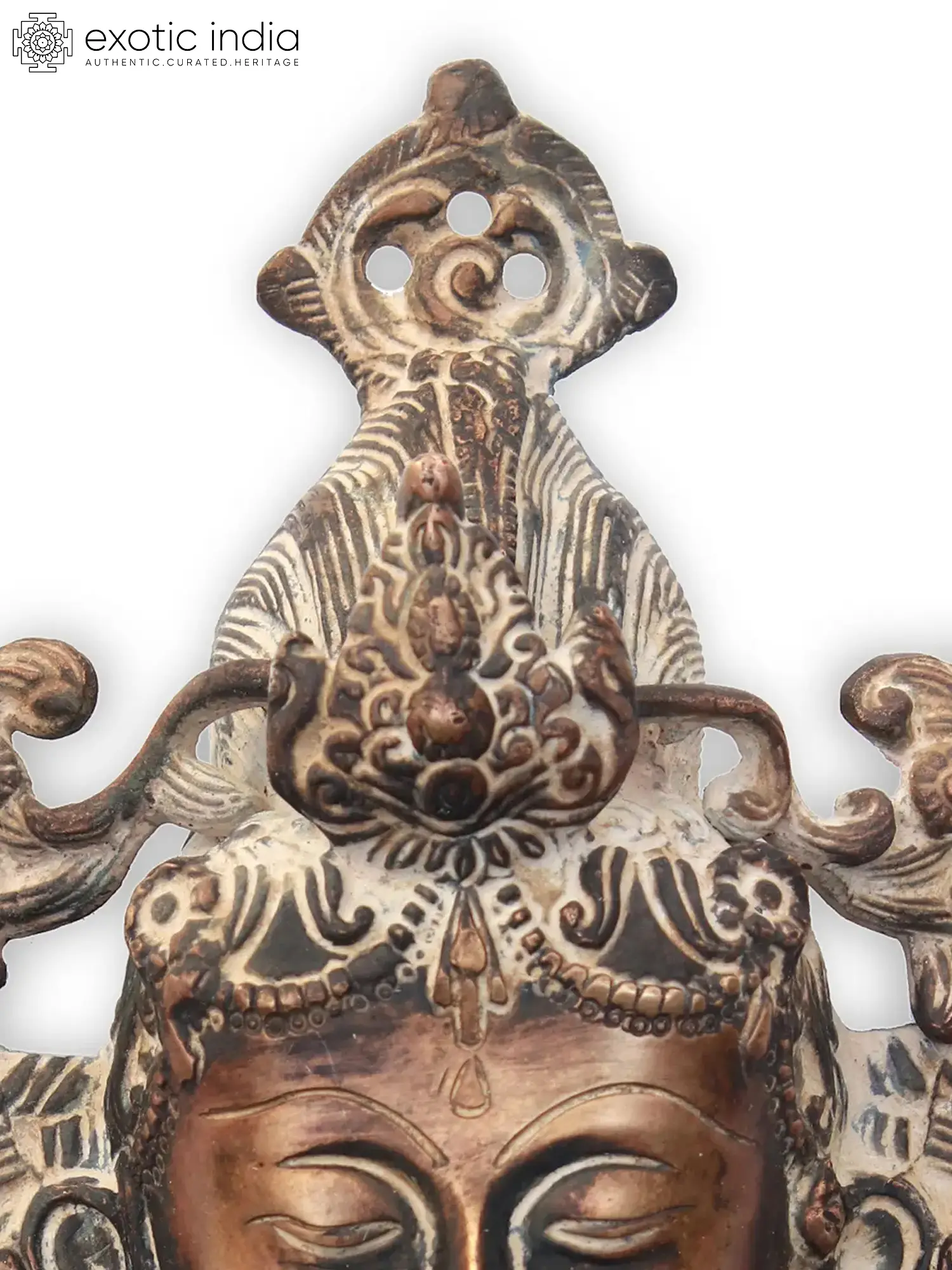 Embrace the spiritual energy and wisdom of Tara, the Tibetan Buddhist deity, with our finely crafted brass wall-hanging mask. Handmade with deep respect in India, this artwork embodies the essence of compassion, protection, and wisdom, central to Tibetan Buddhist philosophy. As you gaze upon the mask, you'll appreciate the intricate details that convey Tara's serene countenance and the symbolism in every aspect of her form. Tara's role as the protector and guide is central to Tibetan Buddhist philosophy, and this wall hanging serves as a constant reminder of compassion, wisdom, and the path to spiritual enlightenment.