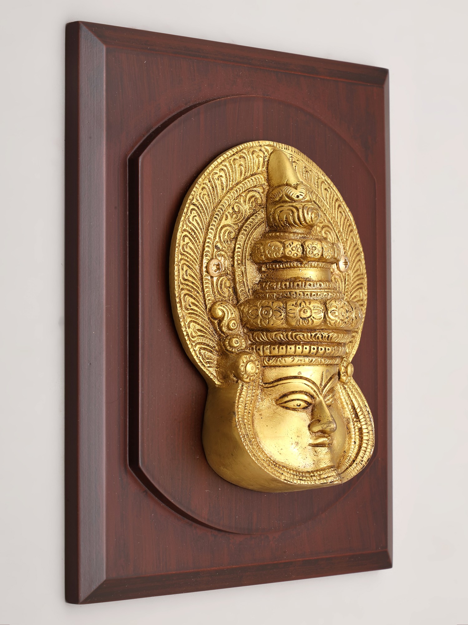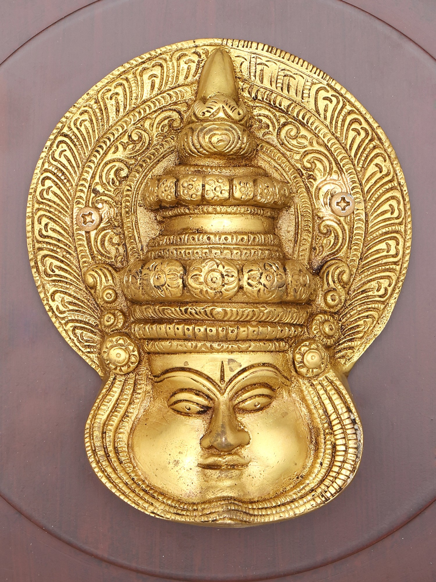 You'll appreciate the commanding presence of the central brass face, adorned with an elaborate headdress and a halo-like decorative surround. The deep-set eyes and serene expression of the face draw you in, inviting contemplation of the stories it holds. The polished brass gleams, highlighting the delicate engravings and sculpted layers of the ornamentation, creating a dynamic play of light and shadow. The sturdy wooden base provides a sophisticated backdrop, its smooth finish contrasting beautifully with the detailed metalwork, offering a balanced and impactful visual statement.