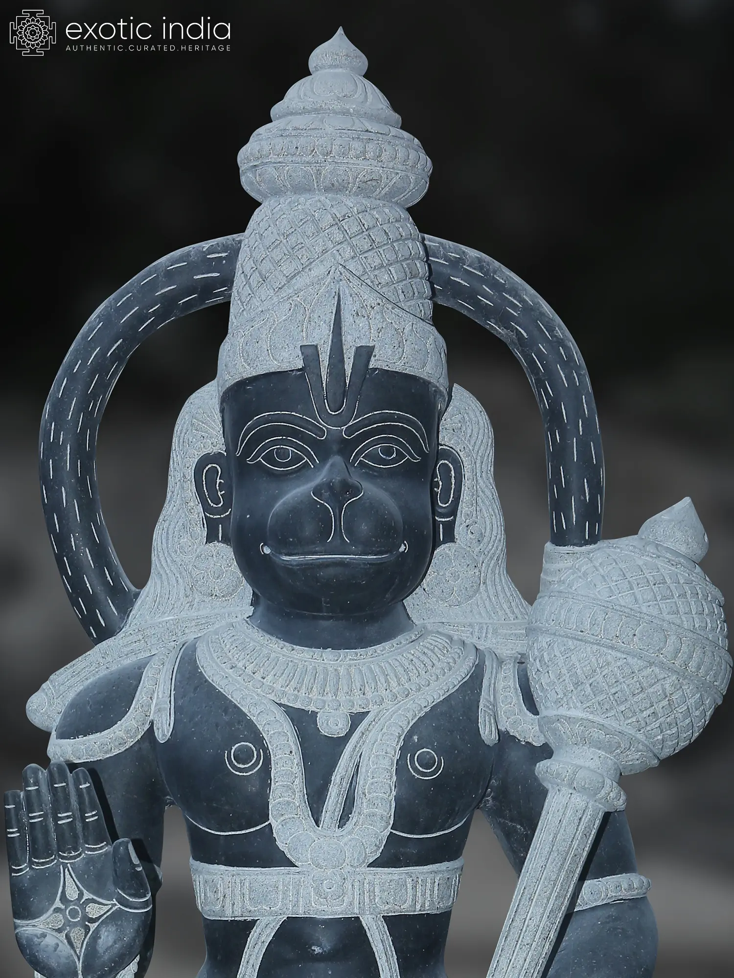 Hanuman is represented with a powerful yet relaxed expression, which represents both his martial spirit and his modest devotion to Lord Ram.