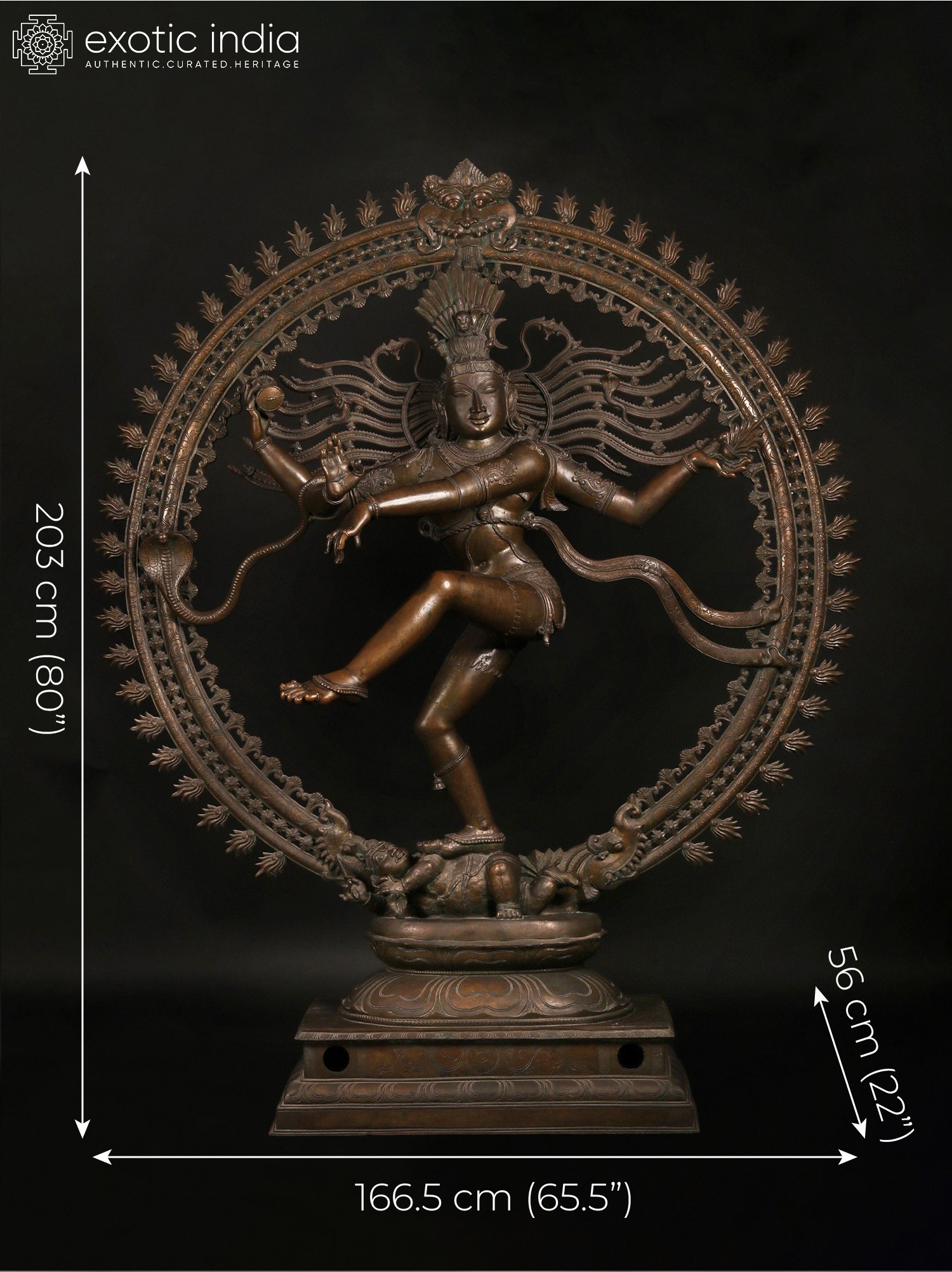 A larger-than-life bronze to grace the home or office of the truly devoted. Fashioned from panchaloha, a mix of five (‘pancha’) different alloys of iron (loha), it depicts the Nataraja roopa (form) of the great Lord Shiva. Caught amidst His powerful, all-annihilating tandava, the stance is one of enchanting grace and harmony.