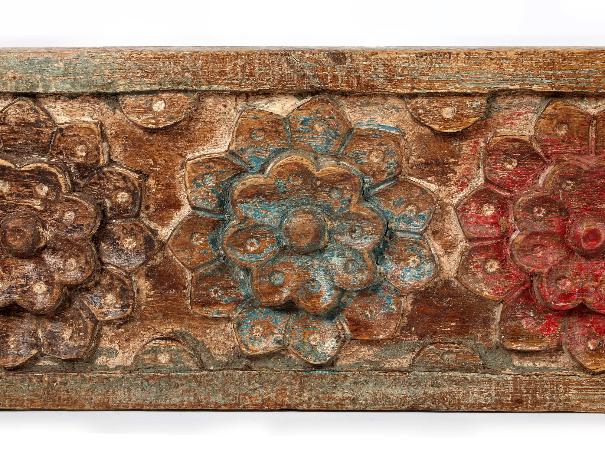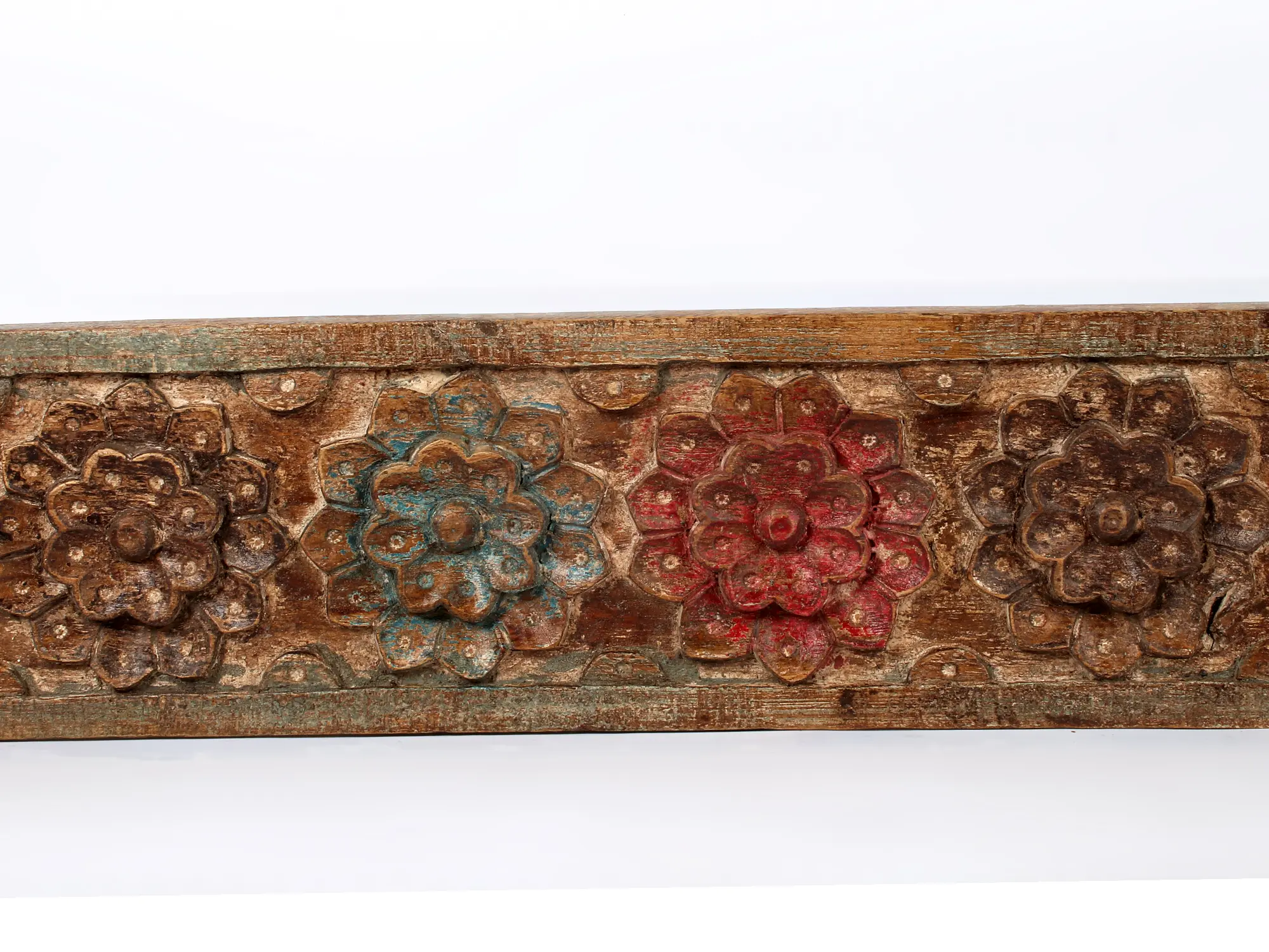 Transport your space to a realm of timeless beauty and artisanal heritage with this magnificent carved wooden panel. Stretching nearly seven feet, this piece is more than just a decorative element; it's a narrative captured in wood, a testament to the enduring artistry of cultures that revered nature and the divine. The panel features a continuous procession of intricately carved flowers, each bloom a miniature masterpiece. The rich patina of the aged wood, combined with subtle traces of faded color – hints of crimson, deep teal, and earthy ochre – speak of a history steeped in tradition and the passage of seasons.