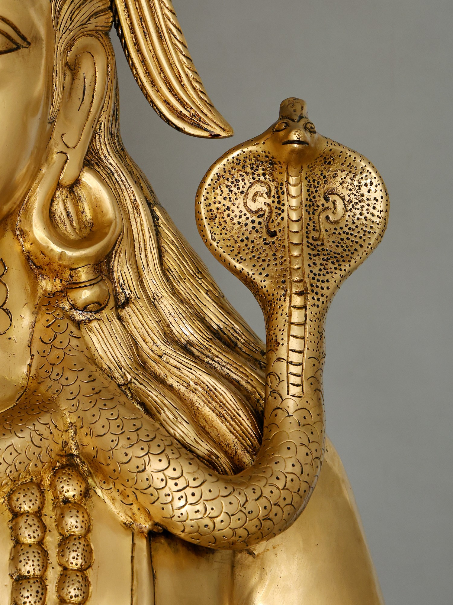 A stateliness characterises this composition of Shiva. His gaze is powerful, directed straight ahead, which is matched by the dignified stance of the wide-hooded cobra that sits on His shoulder. From within the layers of His voluminous tresses that reach well below the shoulders emerge a couple of gigantic kundalas that dangle from His large lobes. The skill that has gone into sculpting this part of the statue is considerable. Each strand of the lord's hair has been defined.