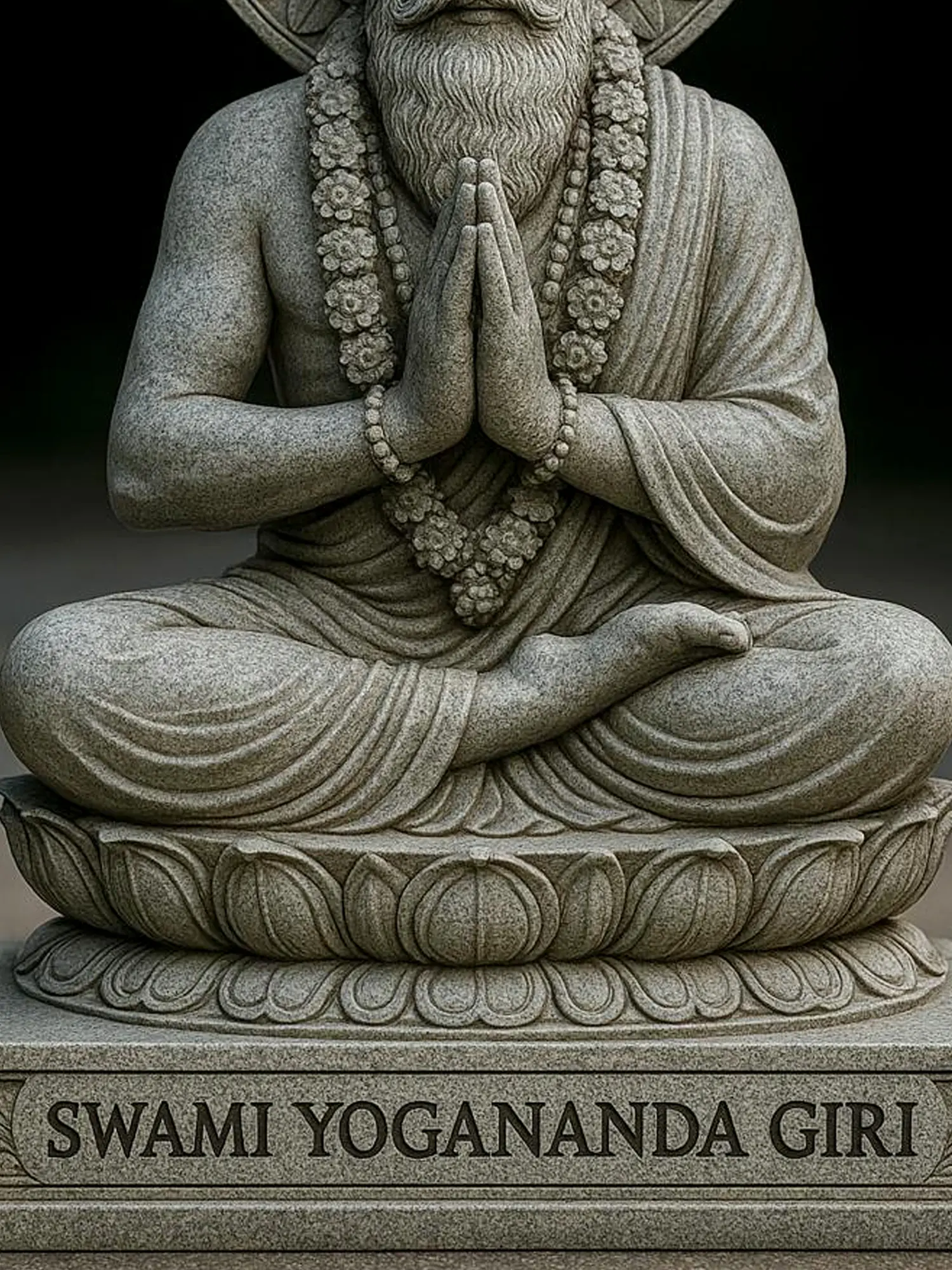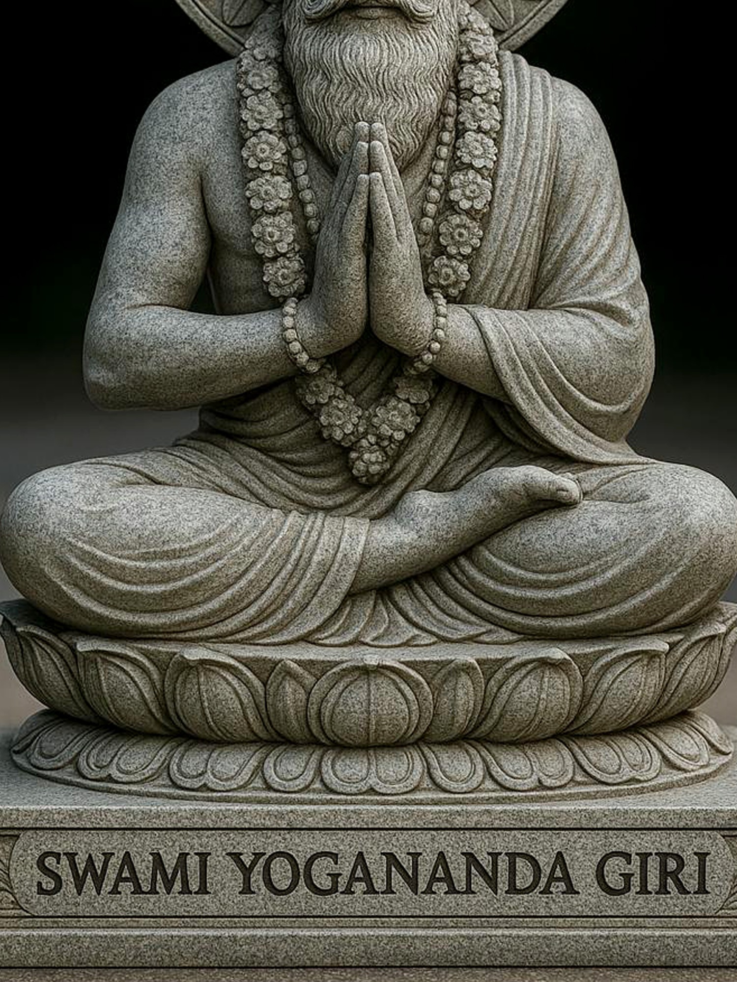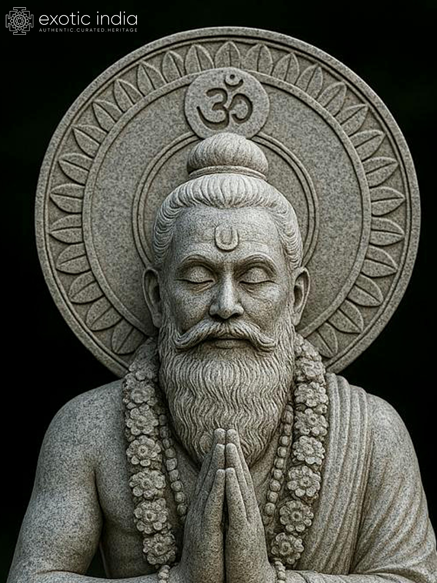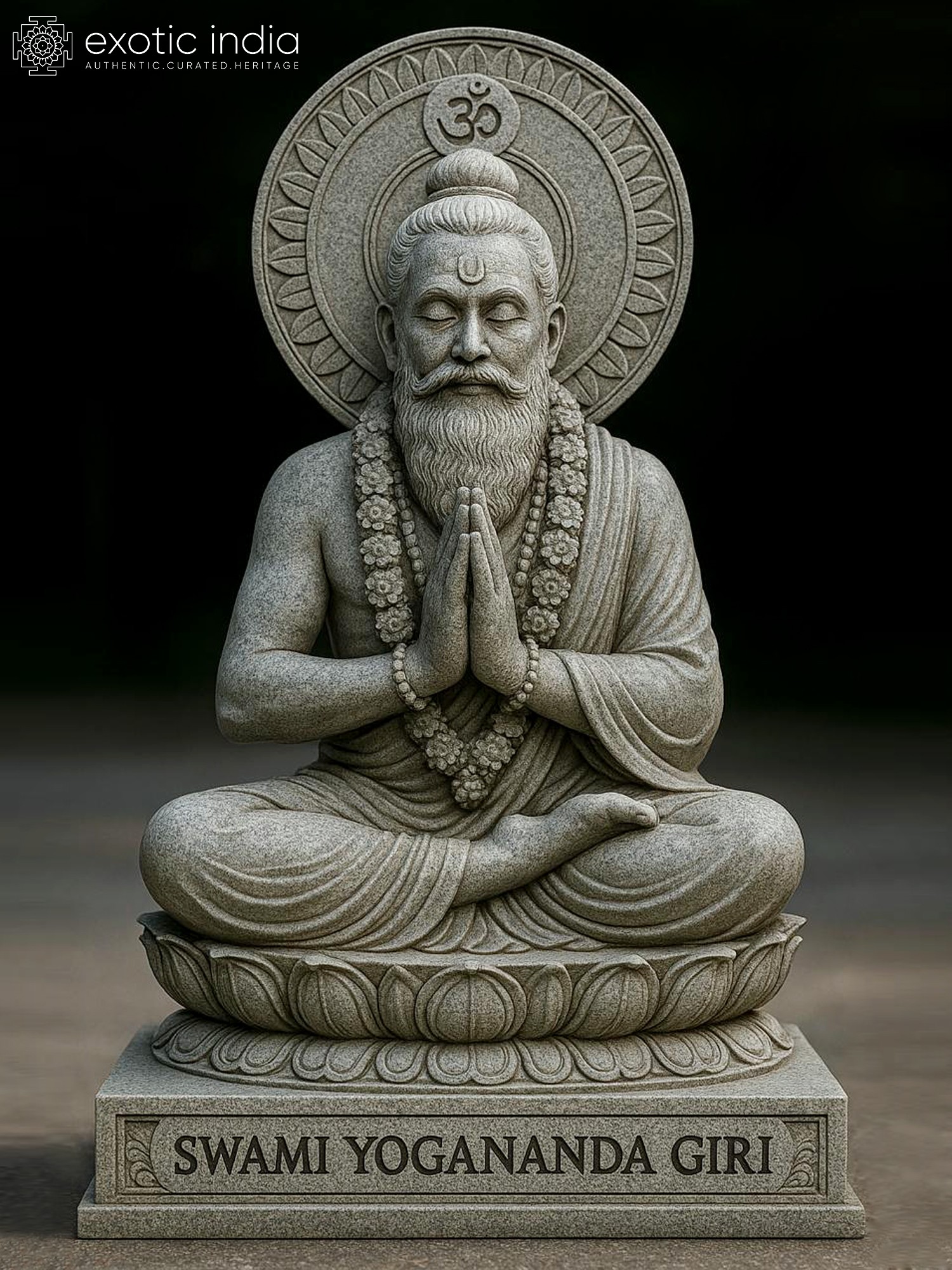 Behold the embodiment of serenity and spiritual wisdom. This sculpture captures a yogi in deep meditation, a visual representation of inner peace and enlightenment. Carved meticulously from granite, this figure is a testament to both artistic skill and the enduring power of spiritual seeking. The yogi sits in the lotus position, Padmasana, the most recognized and revered posture in yogic practice. Padmasana symbolizes stability, concentration, and the blooming of inner consciousness. The hands are held together in Anjali Mudra, a gesture of reverence, greeting, and inner stillness. The mudra signifies the union of the individual self with the universal self. The yogi's serene expression, framed by a long beard and mustache, speaks of years spent in contemplation and spiritual practice. A tilak adorns the forehead, a mark of auspiciousness and spiritual insight. Around the yogi's neck, delicate garlands cascade, symbolizing purity and devotion. Behind the yogi’s head, a halo is inscribed with the sacred Om symbol.