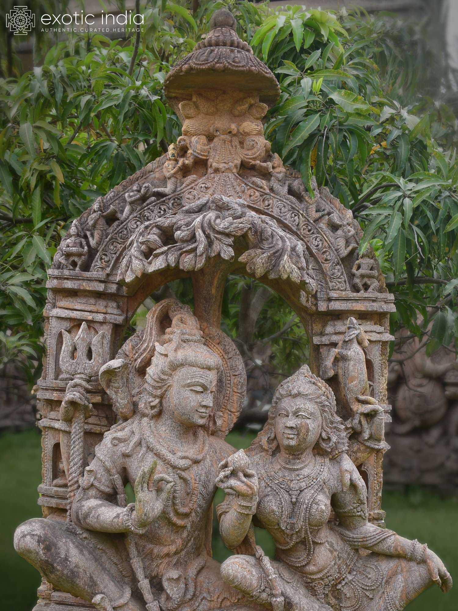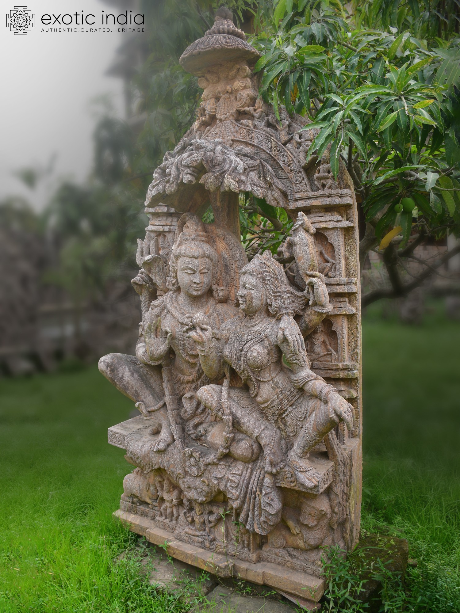 This sculpture draws inspiration from the rich artistic traditions of ancient India, particularly the sculptural styles prevalent in the region of Orissa, renowned for its masterful temple carvings. The depiction of divine couples like Shiva and Parvati is deeply rooted in Hindu philosophy, symbolizing the union of masculine and feminine energies, the transformative power of destruction and creation, and the enduring strength of domestic bliss within the divine realm. Its creation speaks to an unbroken lineage of artistic expression and spiritual devotion.